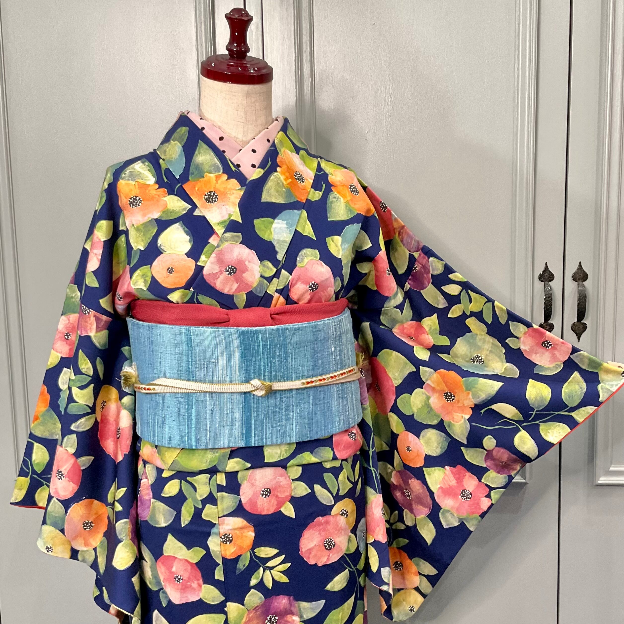 ネイビーの地色にやさしい花模様がデザインされたほんのりレトロな小紋着物です♪