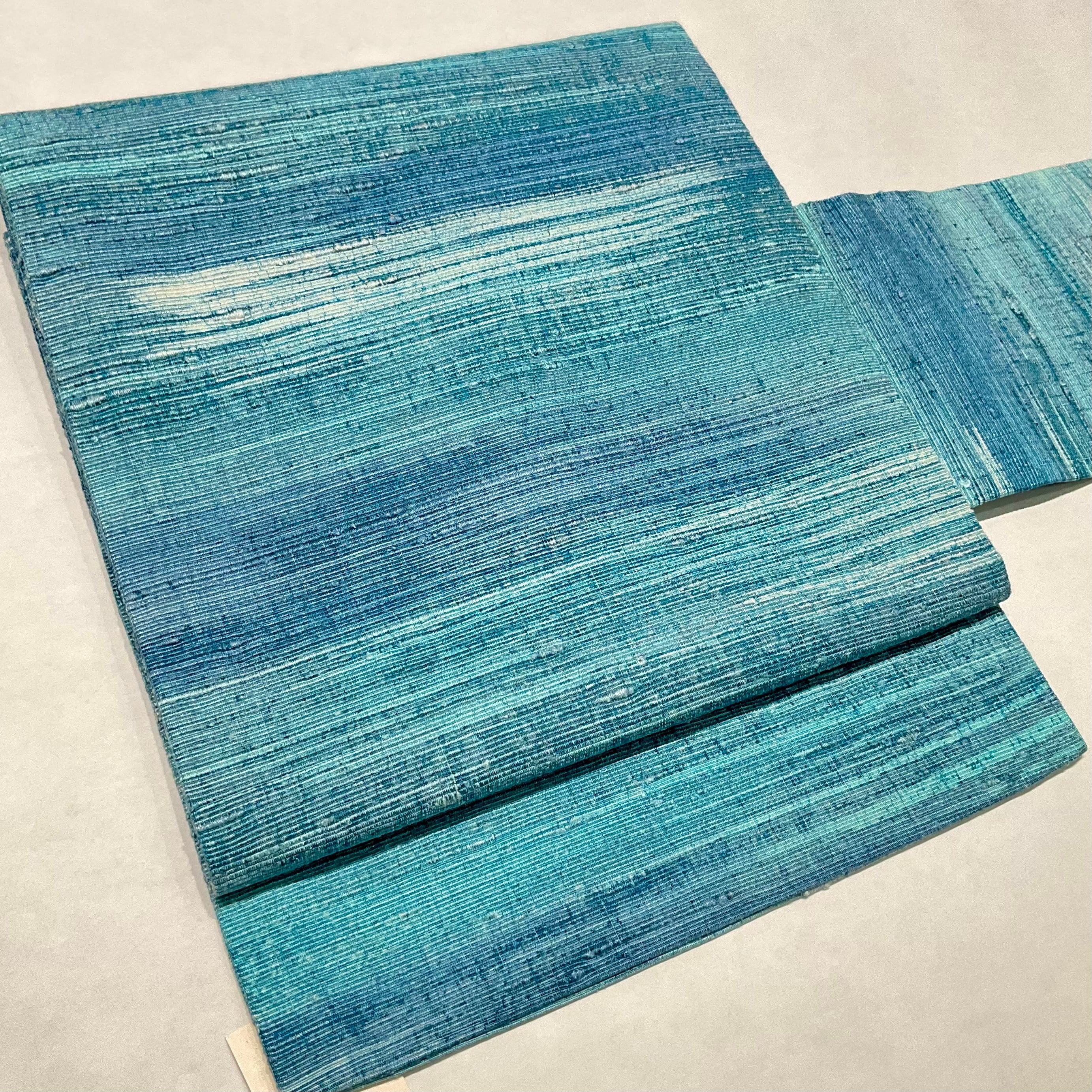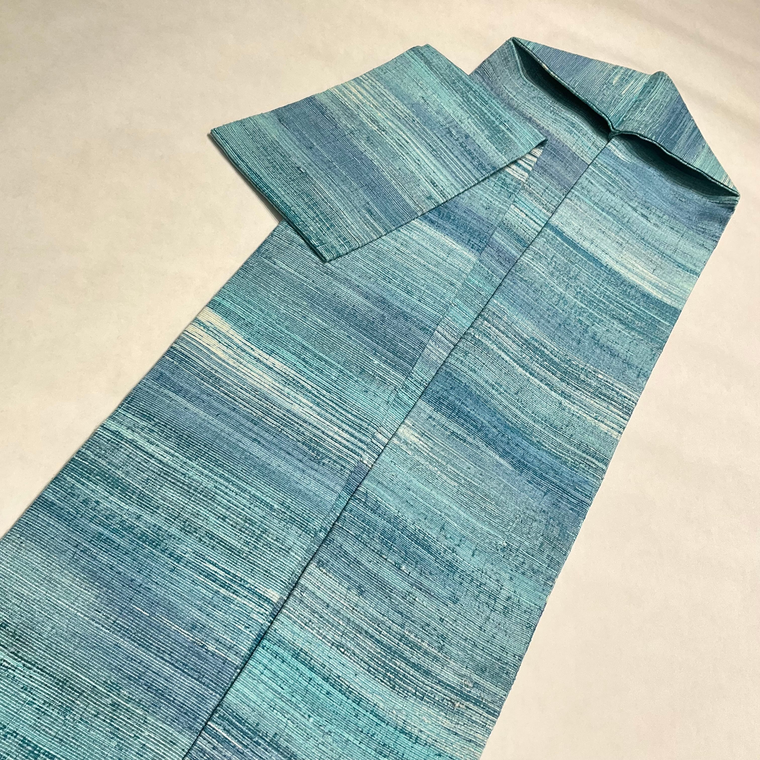 微細な織りが美しくグラデーションになり、紬地の節までもが、どこか幻想的な静かな湖畔の雰囲気を感じさせる逸品ですね✨
