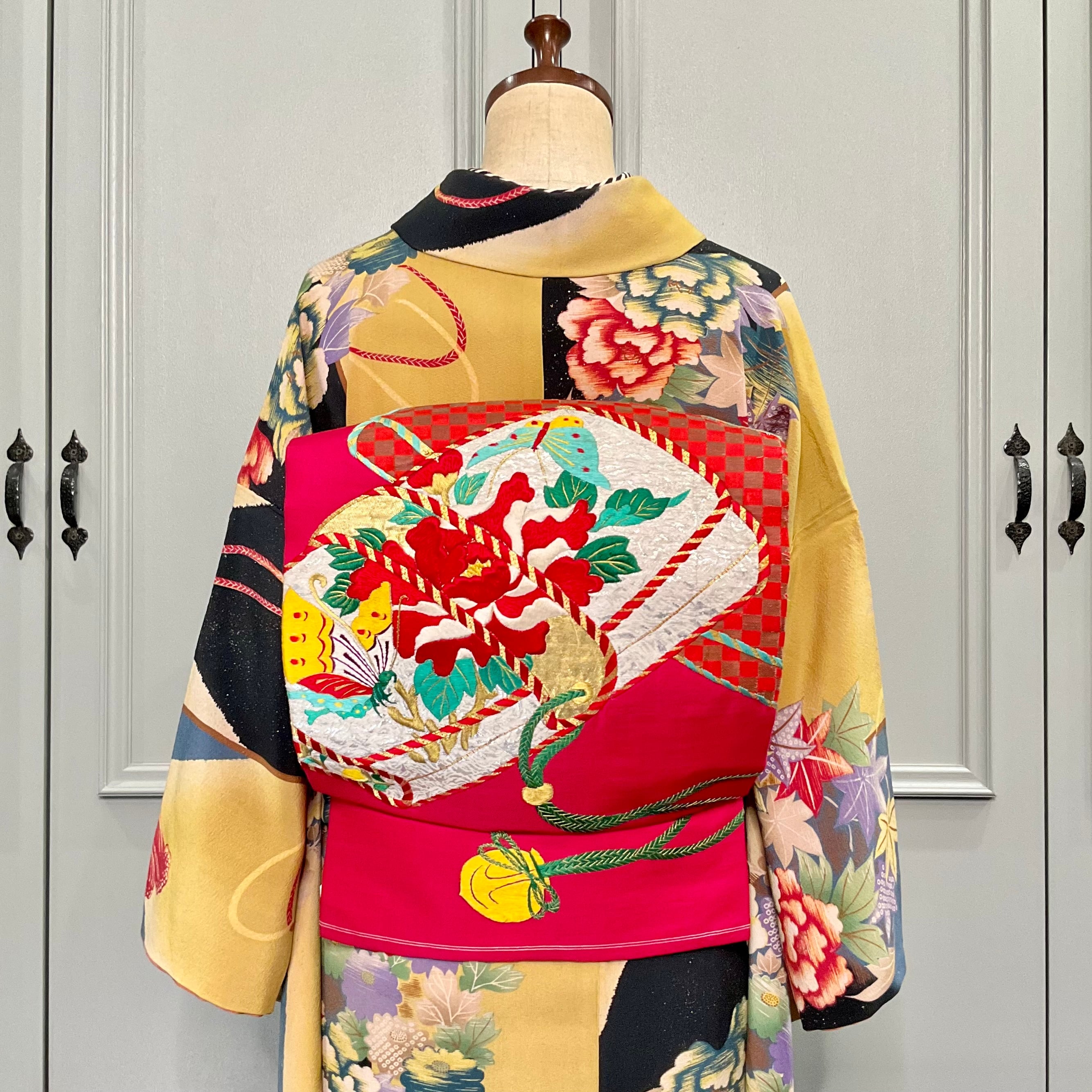 味のある線で描かれた牡丹や菊、紅葉などの大きな花薬玉、可憐に垂れ下がる紐が目を惹くデザイン♡
