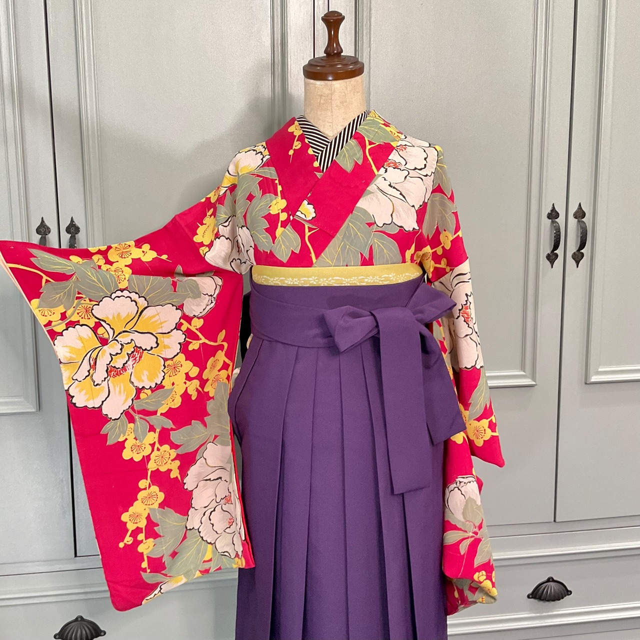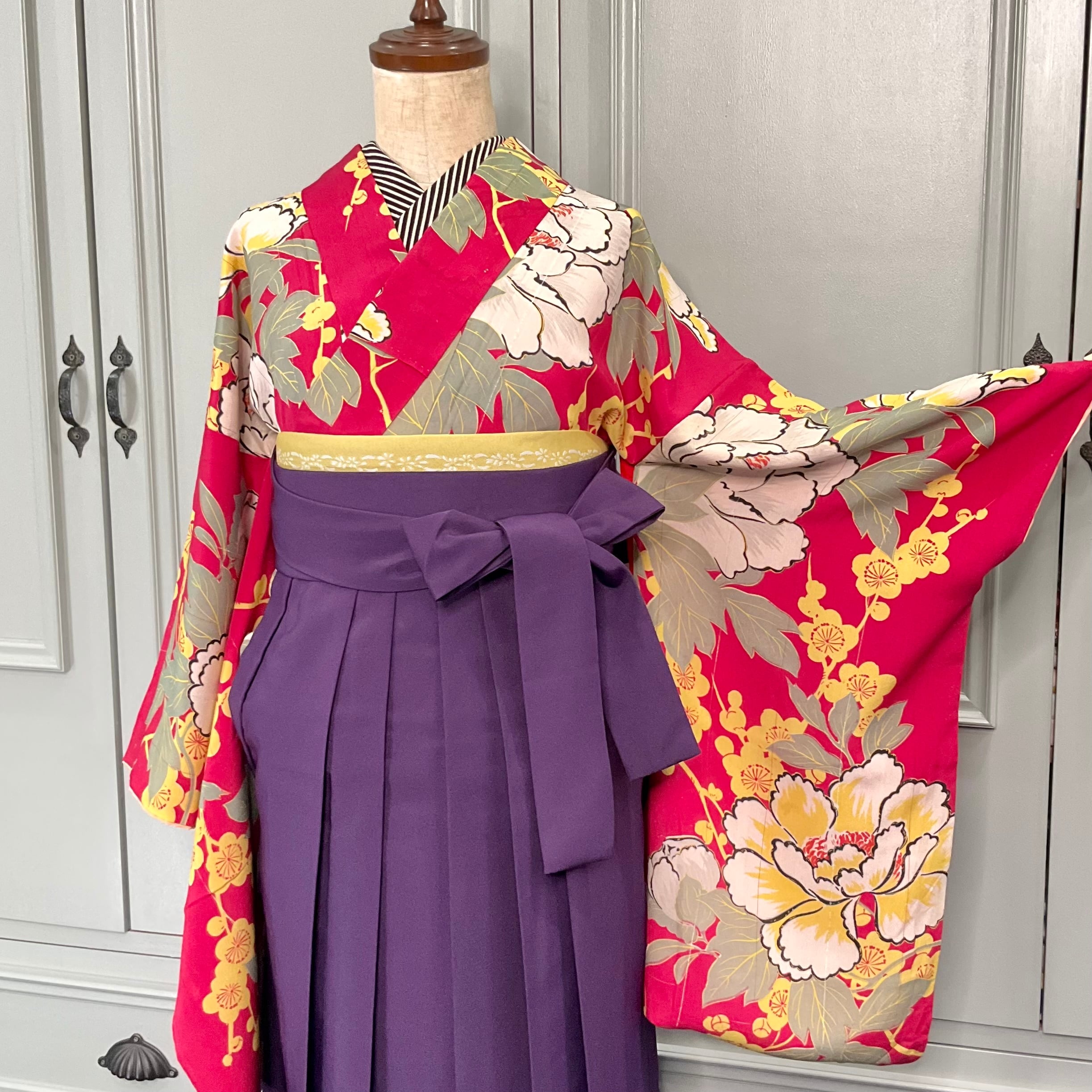 牡丹と梅* 大柄アンティーク 卒業式 袴 紅色 ルビーレッド アンティーク小紋着物 A483