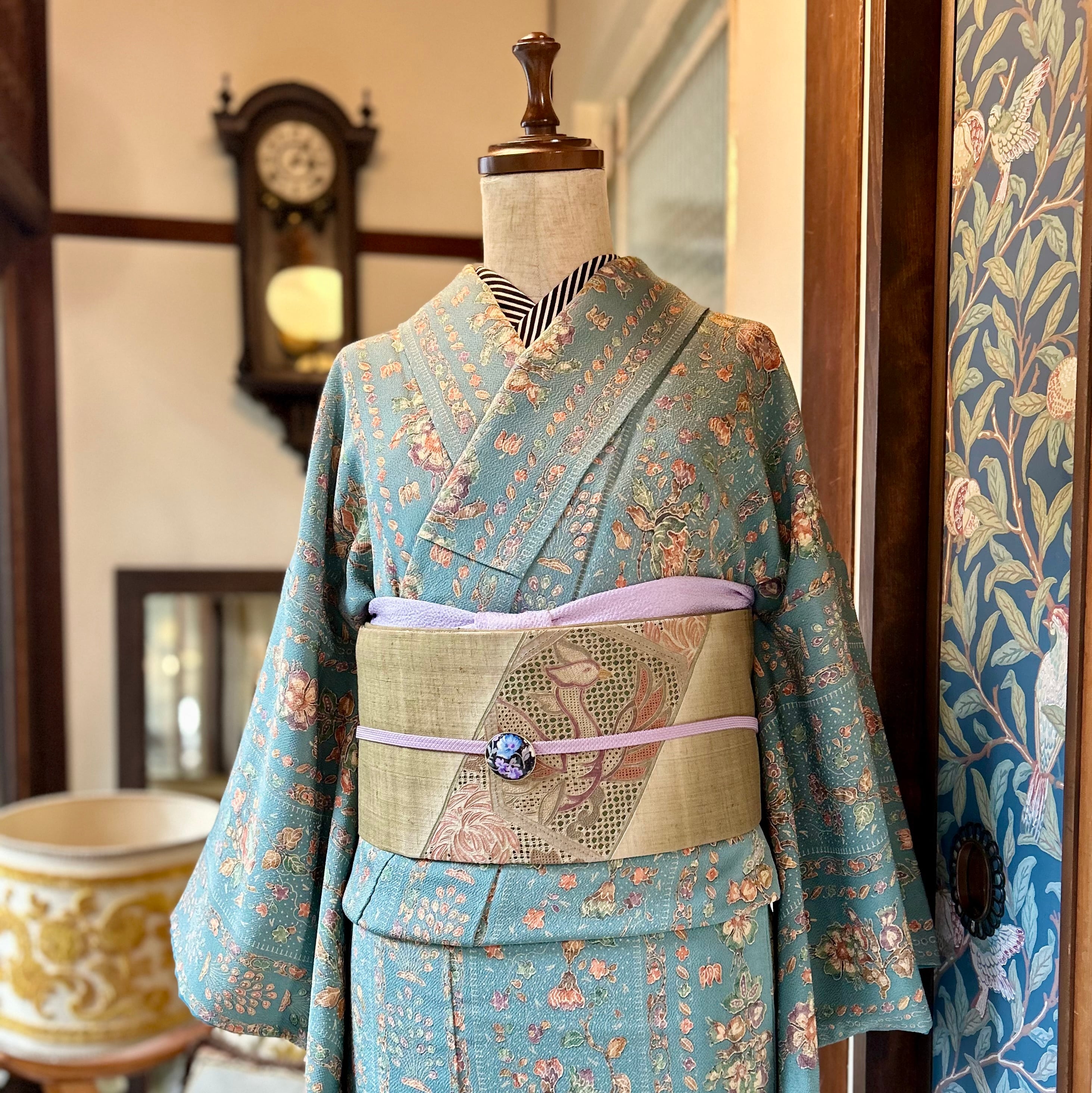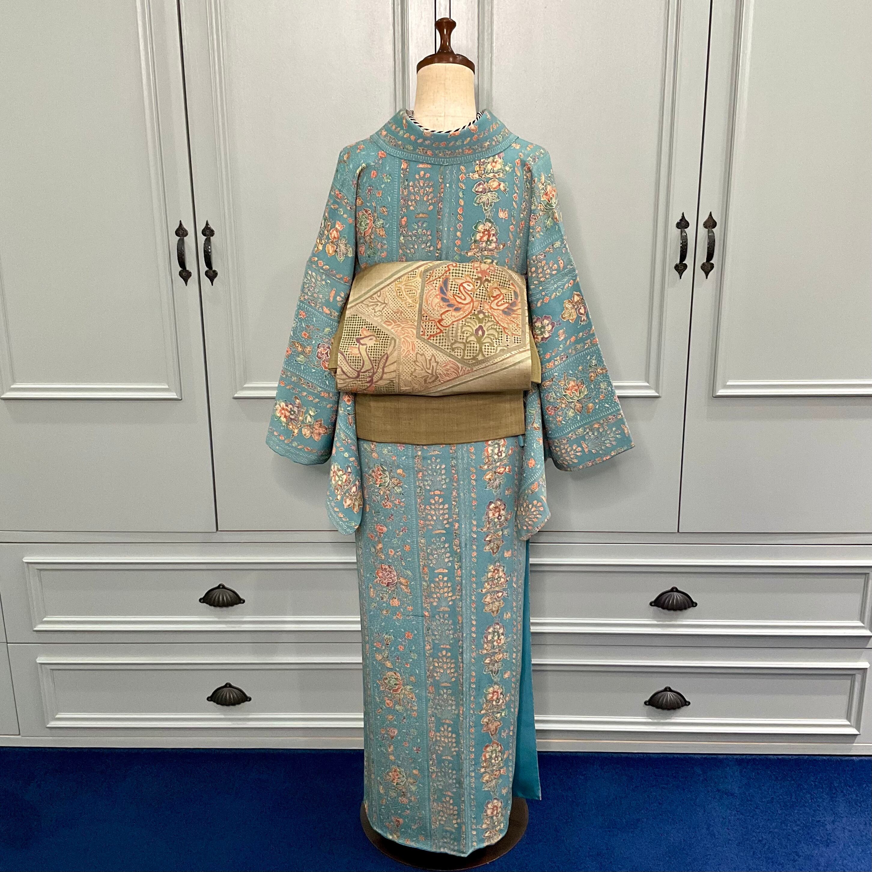こっくりとした落ち着いた濃浅葱色の地色に孔雀の羽のような花びらや様々な花模様がストライプ調にデザインされ大人カワイイ雰囲気に