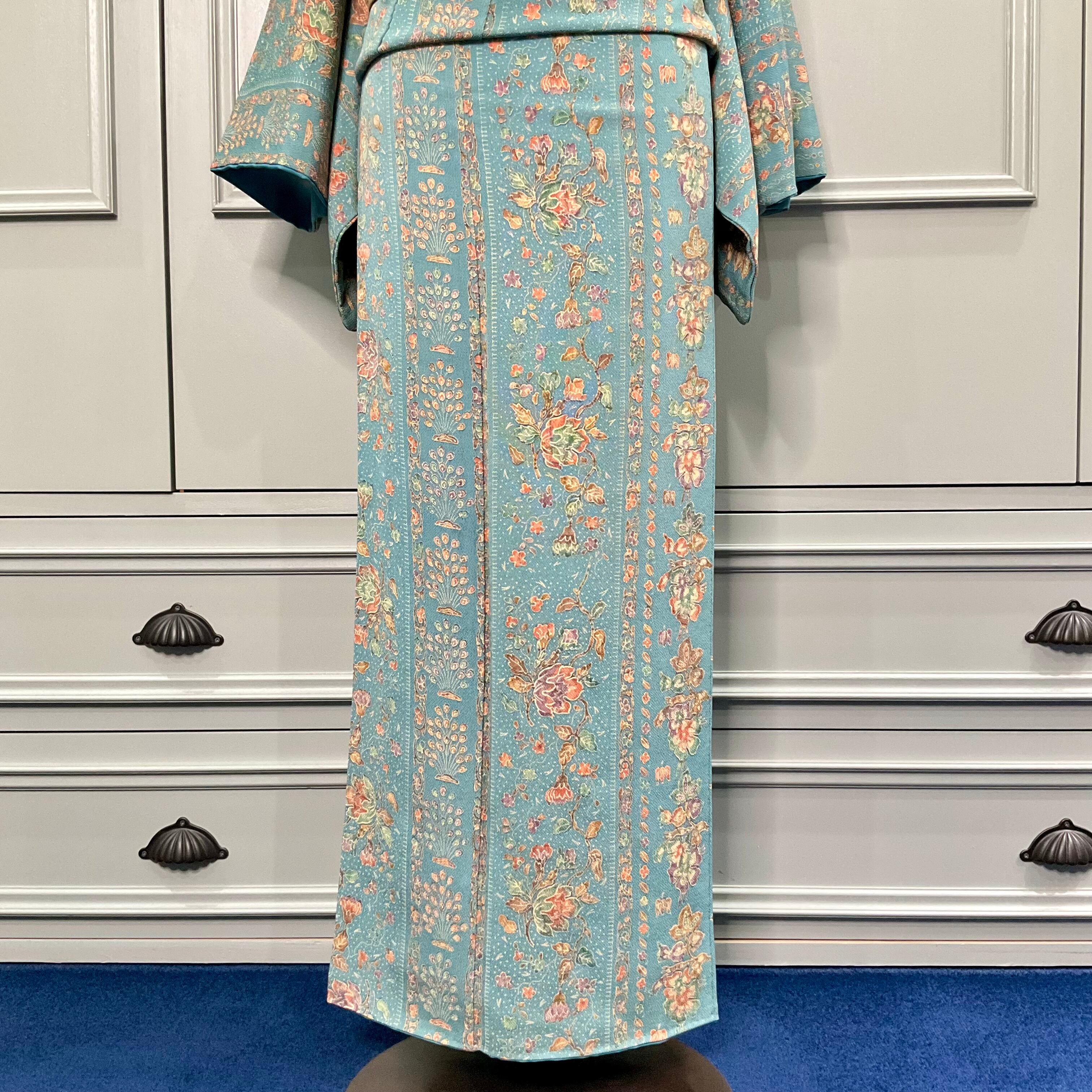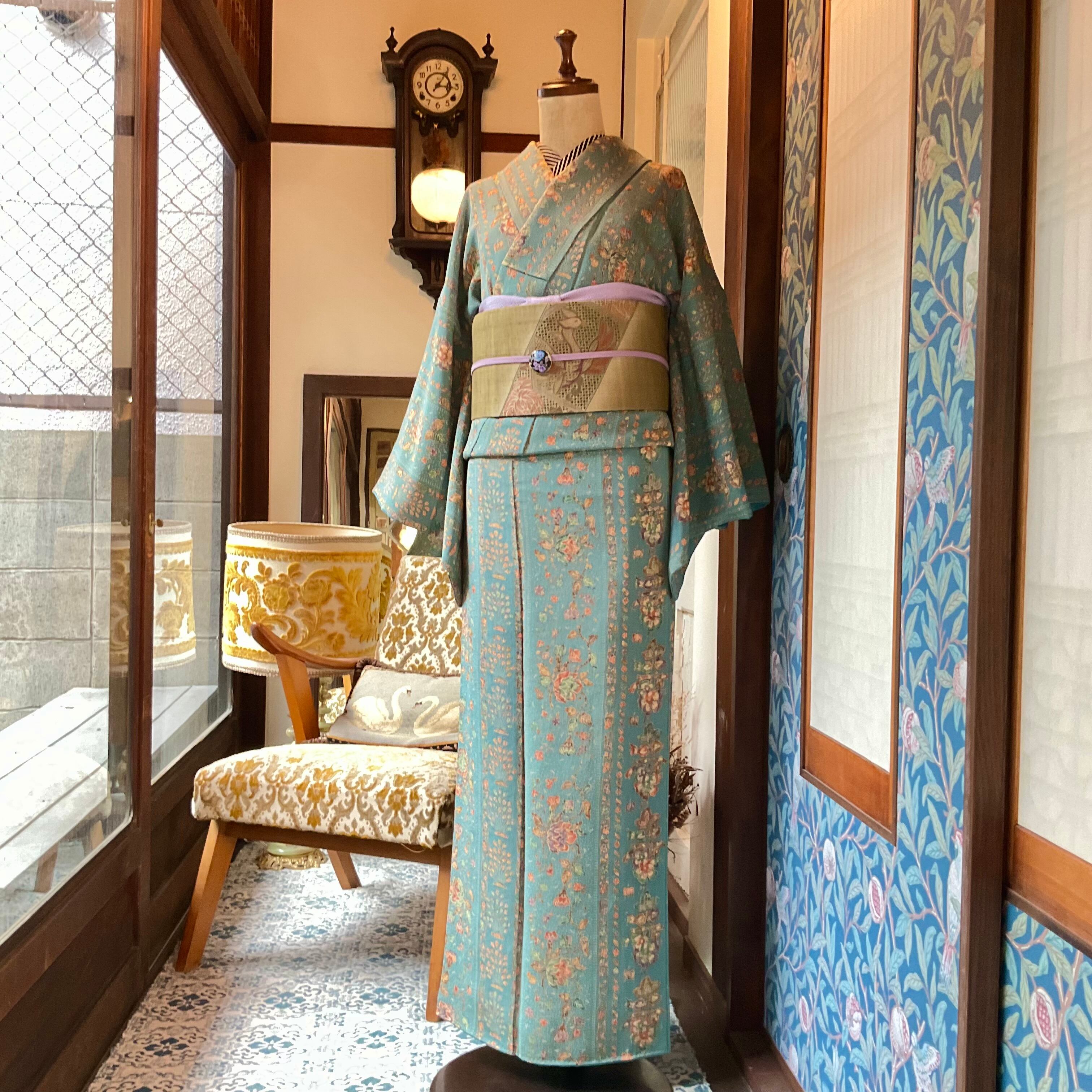 濃浅葱色の地色に、様々な花模様が縦ラインにデザインされたリサイクル小紋着物です♪