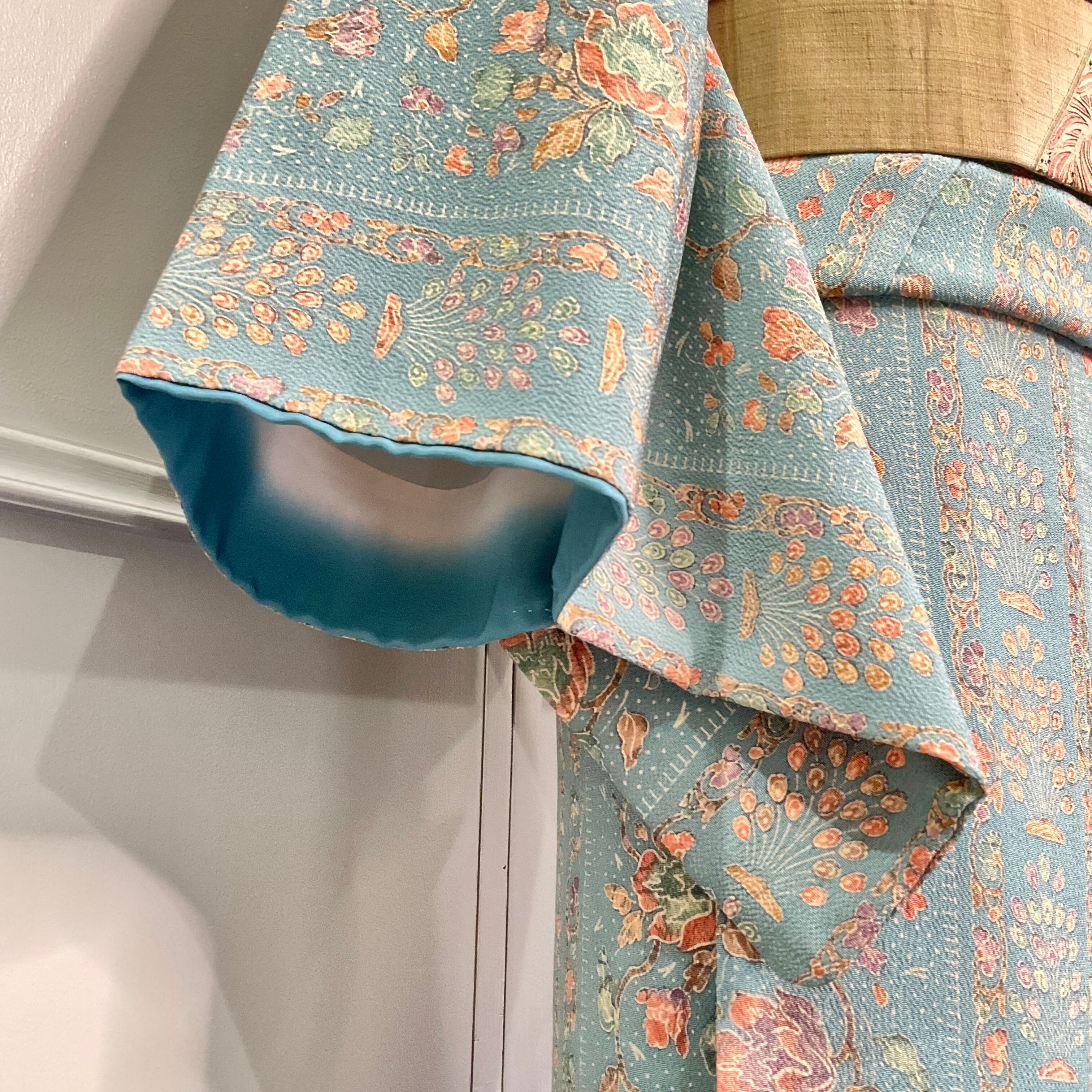 memory flower*ロング 縮緬 花模様 ピーコックブルー 浅葱色 リサイクル小紋着物 A489