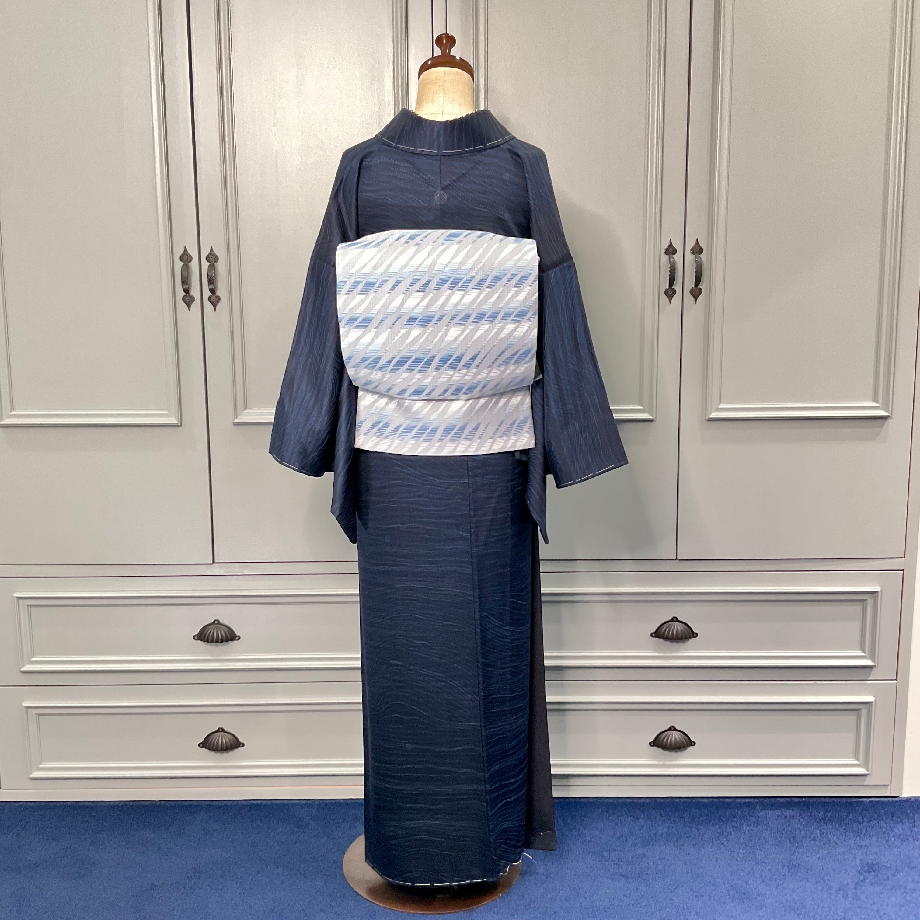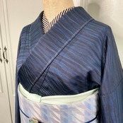 よく見ると紺青の小さなドットの地色に墨色のゼブラ柄のような縞模様、アクセントのように色鮮やかな点線がやわらかく描かれており、遊びゴコロのある一着です