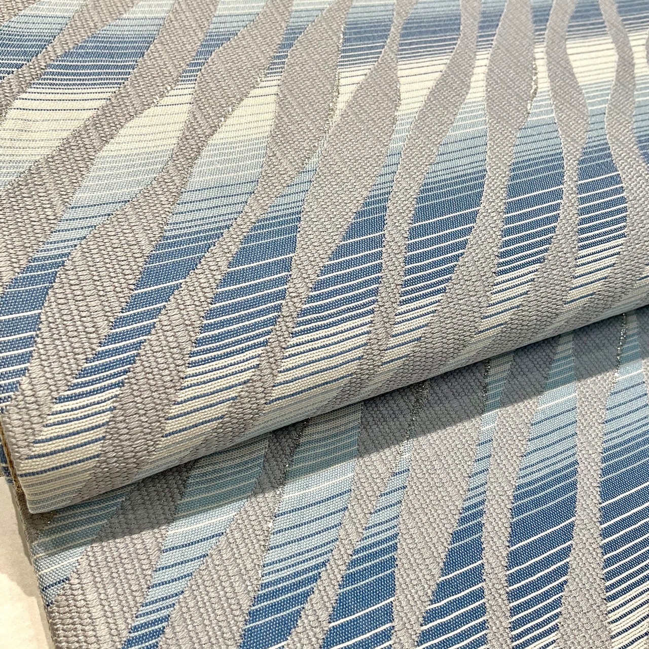 ホワイトからブルーのグラデーションの縞に重なるよう、グレーのよろけ縞が斜めにデザインされたリサイクル洒落袋帯です