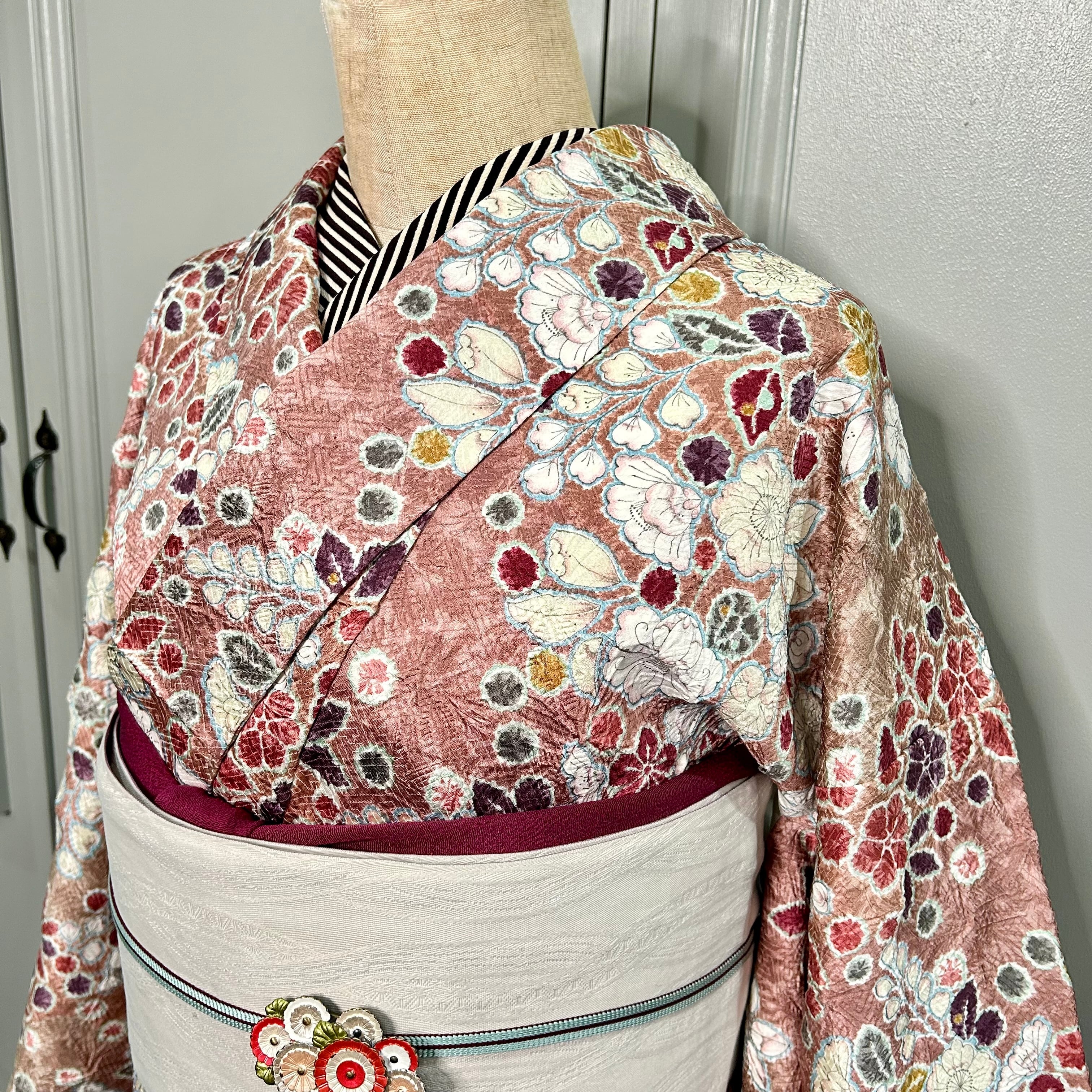 梅鼠色の地色に辻ヶ花調の美しく絵画的なデザインが華やかなリサイクル小紋です