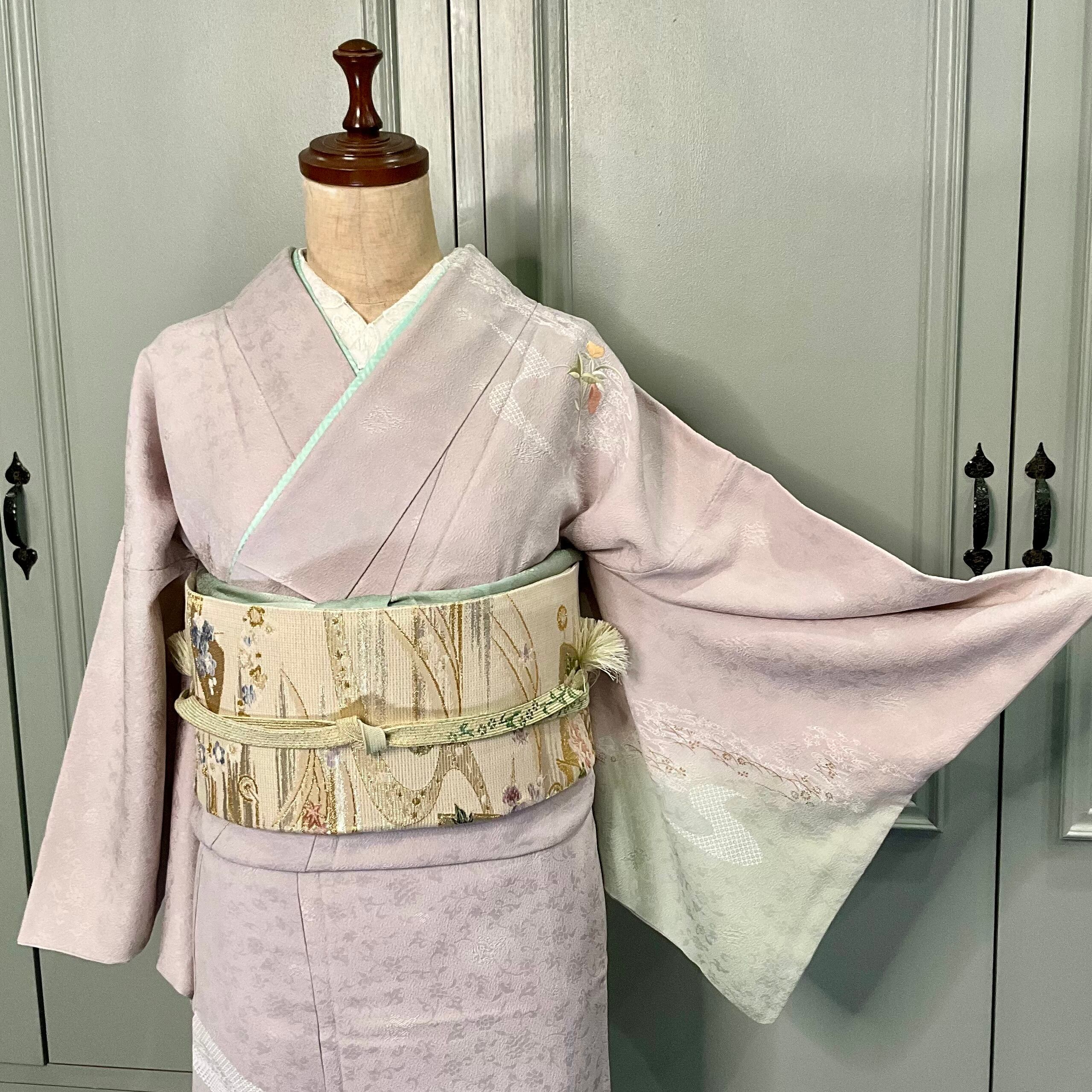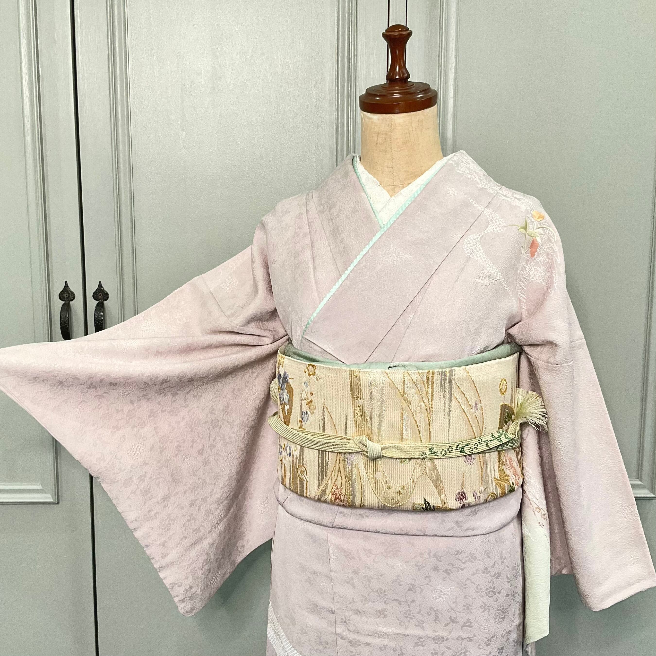 やさしく落ち着いた色柄ゆきが上品で、控えめな金色の芝草文の煌めきと花の刺繍が華やぎを添え、大人の雰囲気が美しい訪問着ですね✨