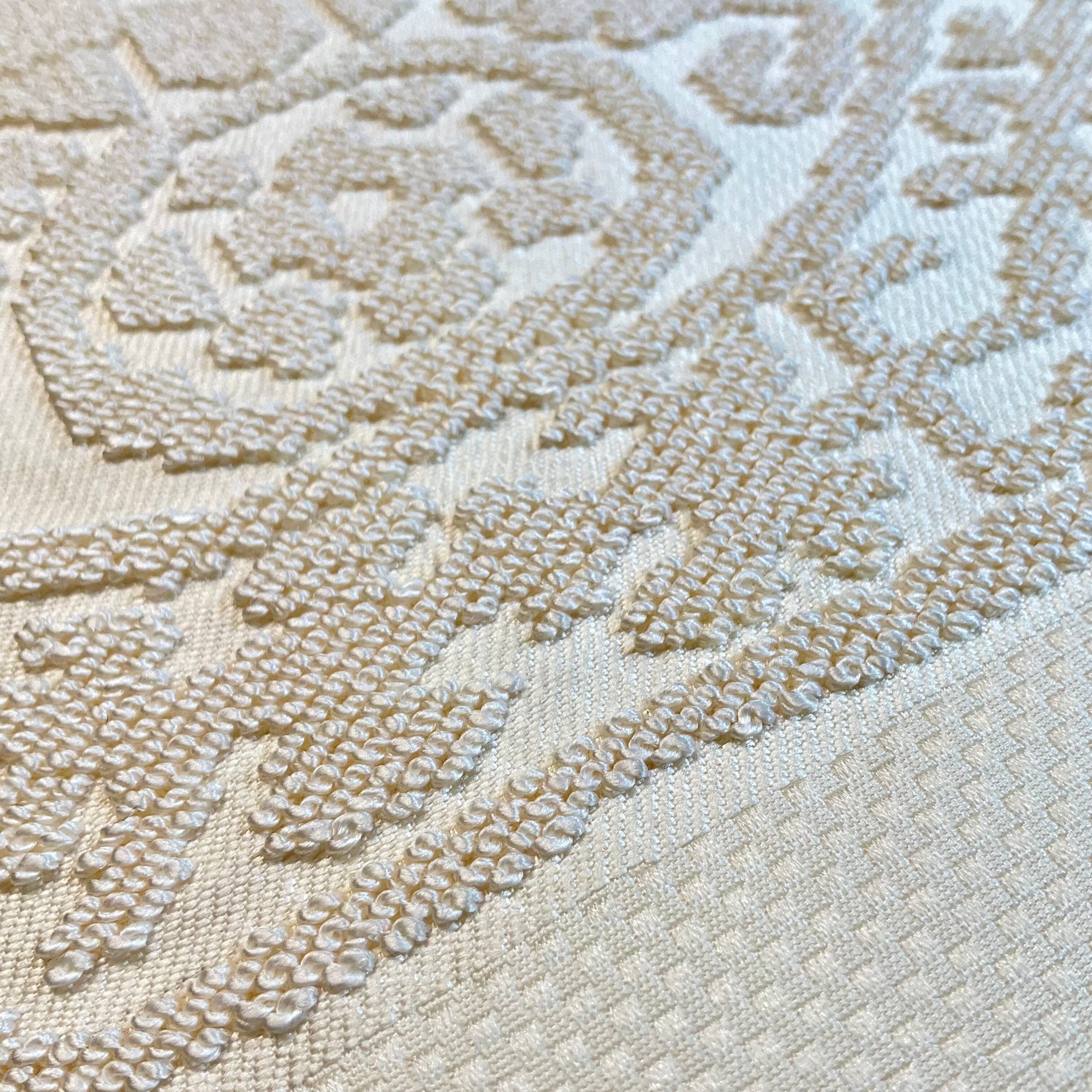 ホワイトの地色にふっくらと施された相良刺繍が美しいリサイクル名古屋帯です