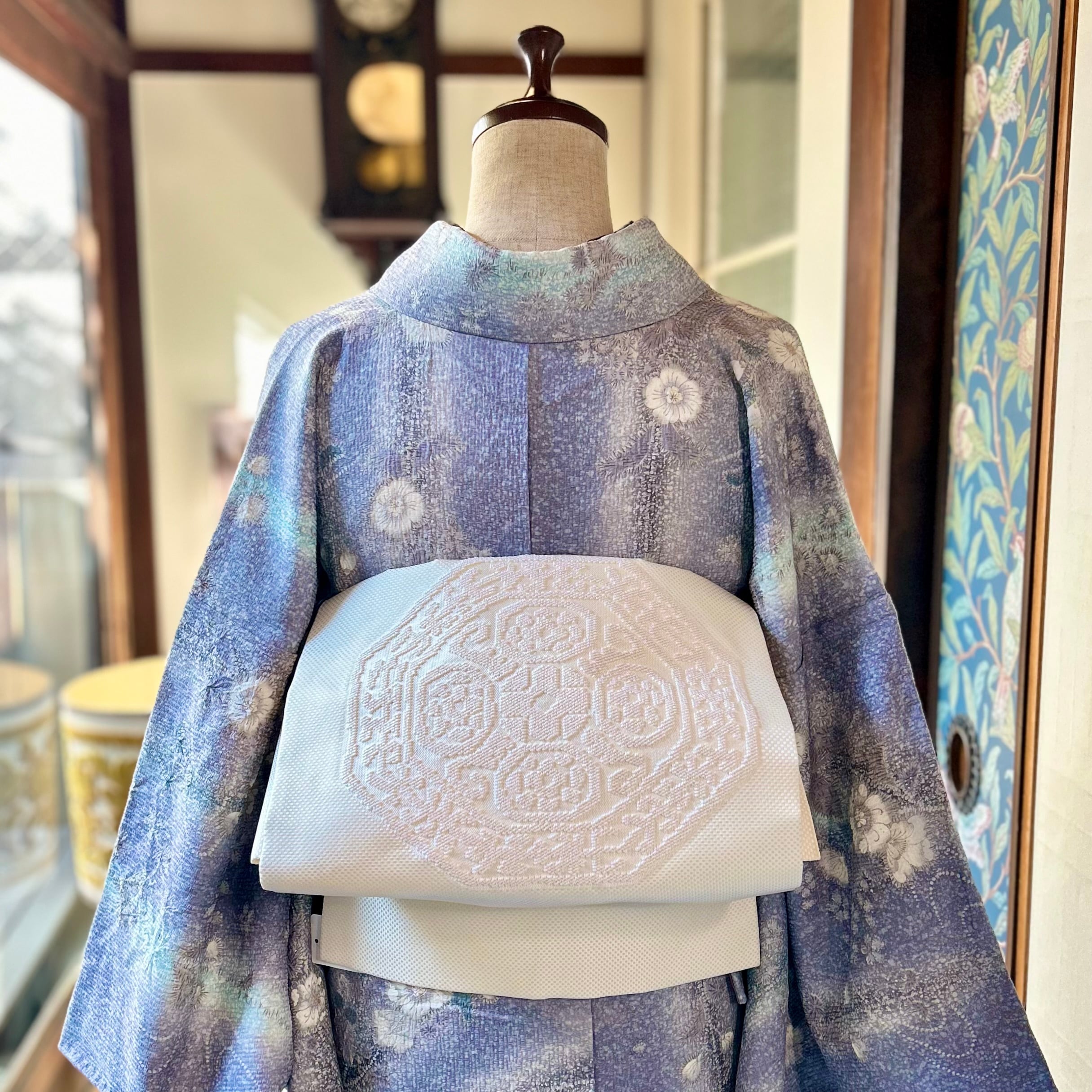 ○合わせた着物とオリジナル三分紐リバーシブルライン プラム×ミントもweb shop掲載品です♪
