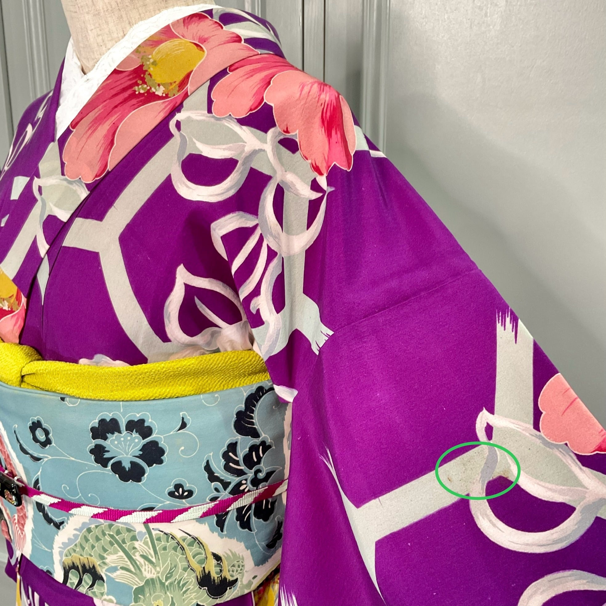 Camellia modern*椿 紫 パープル 花 亀甲 アンティーク小紋着物 A523