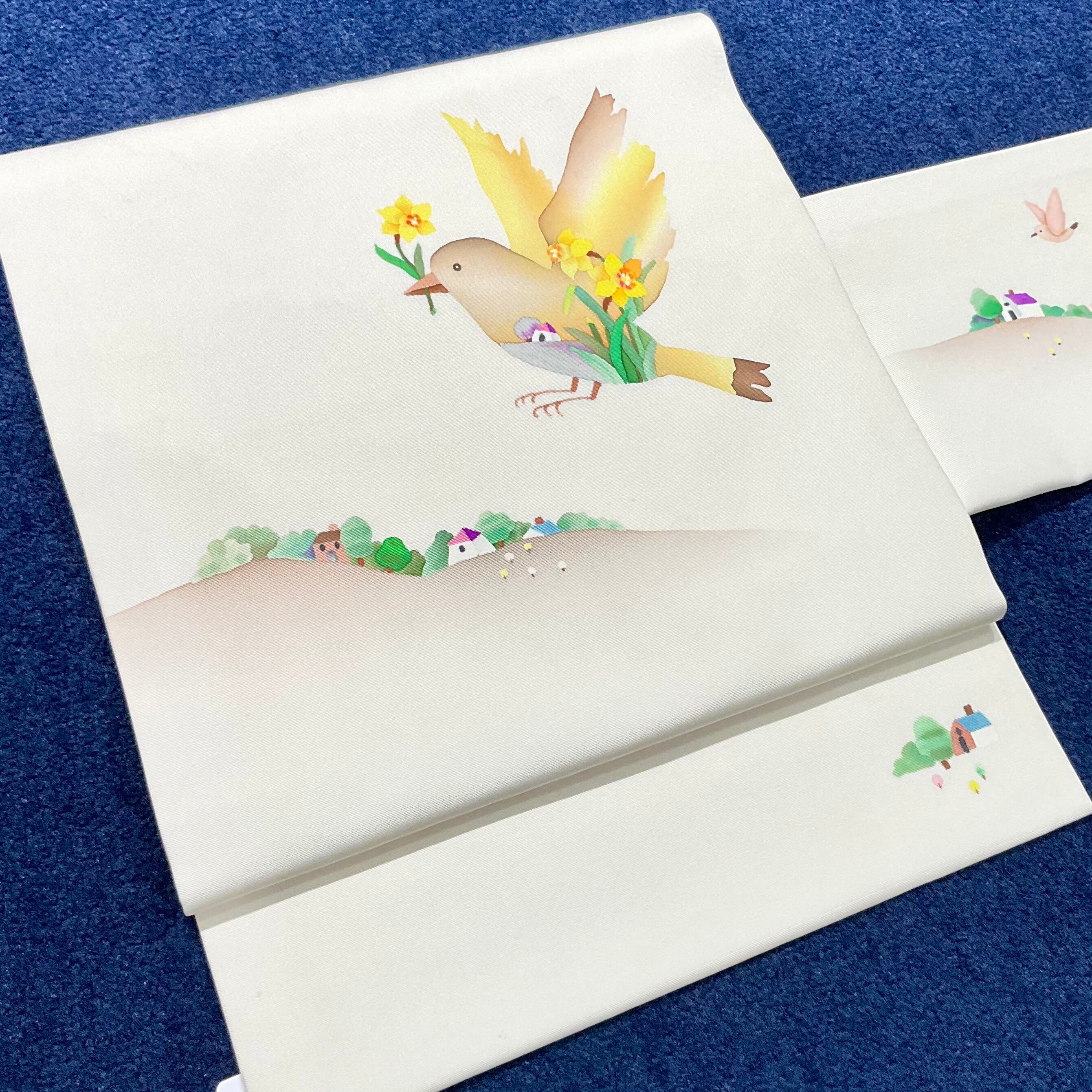 ホワイトの地色にかわいらしい小鳥が描かれたリサイクルの塩瀬名古屋帯です
