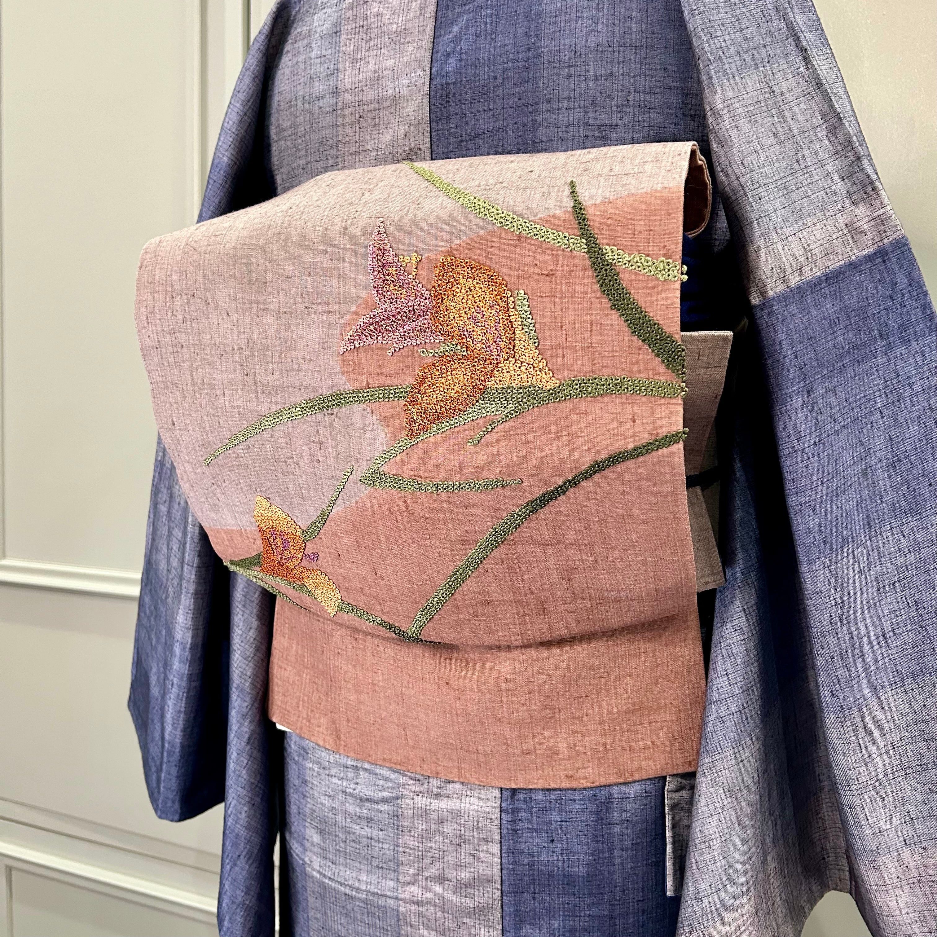 紫苑色×柿渋色の2色で彩られた地色に、相良刺繍であしらわれた花模様が美しいリサイクル名古屋帯です