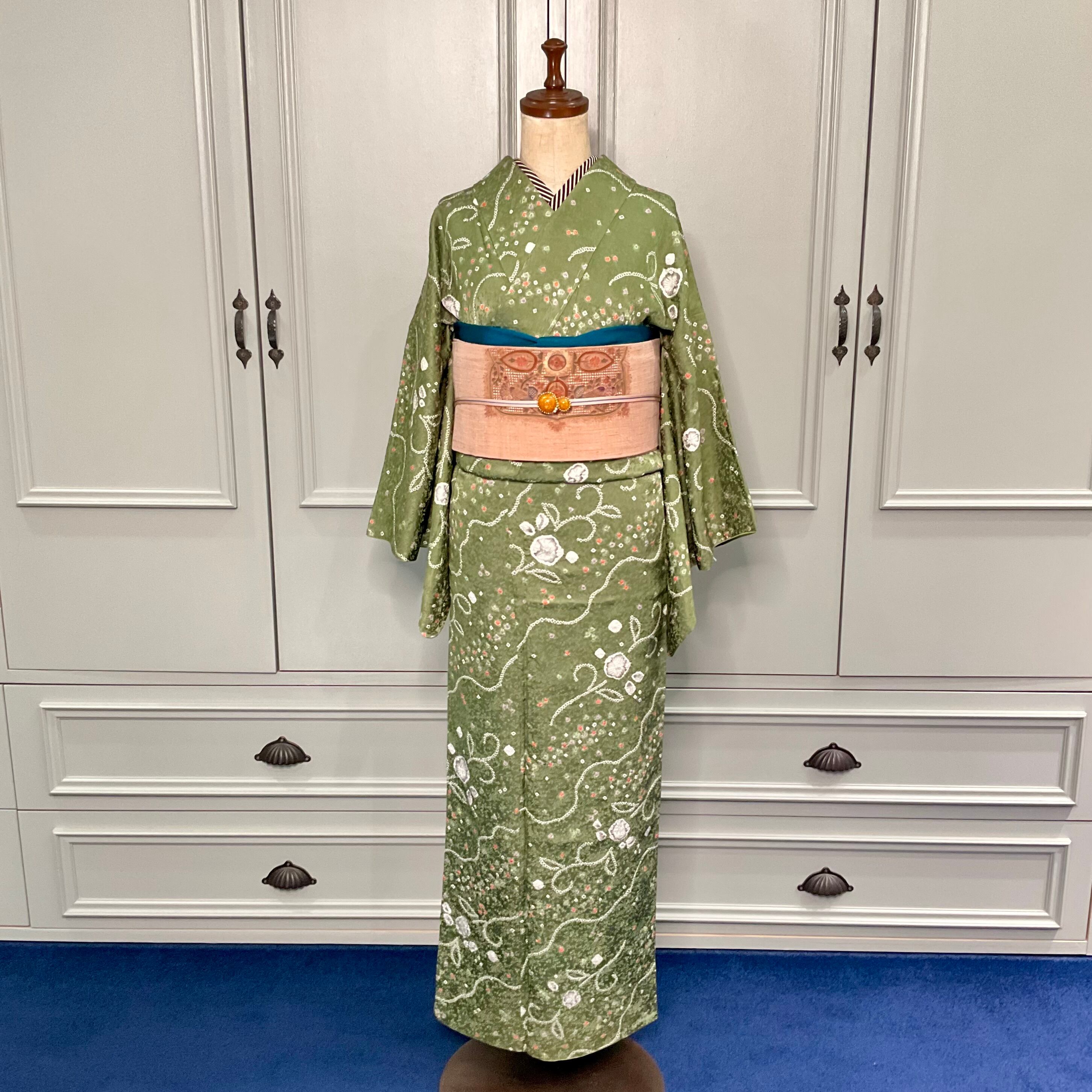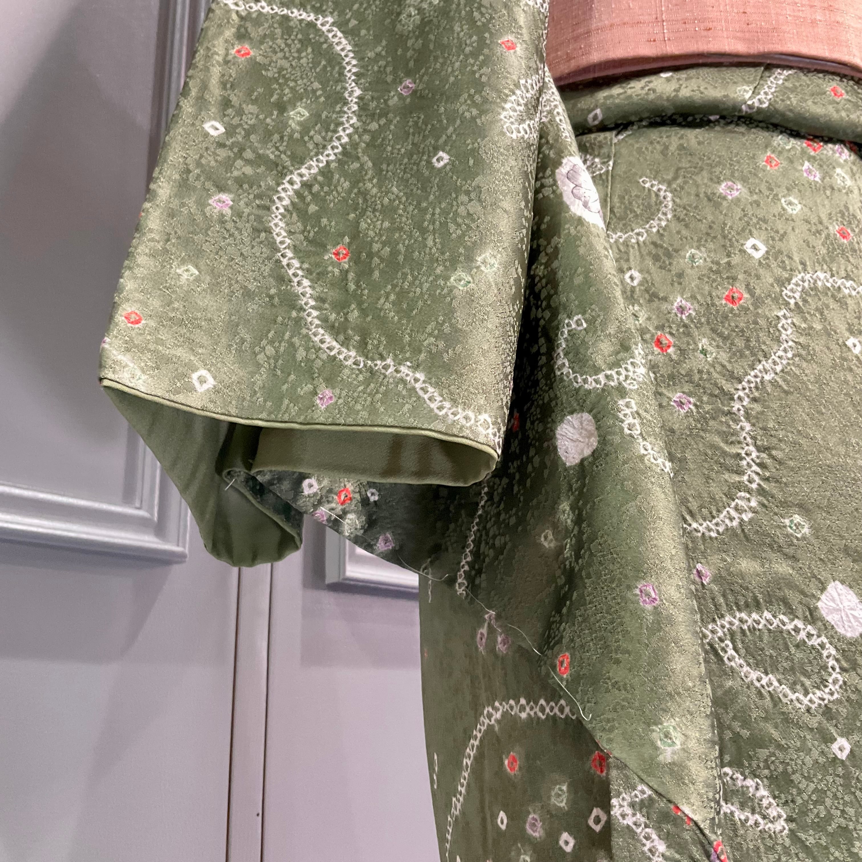 地色のモスグリーンが落ち着いた大人の雰囲気ですが、絞りの色目や花模様のかわいらしさもあわせ持っているので、暗めの帯でシックにも、白っぽい帯で可愛いらしくも様々なコーディネートを楽しめるオススメの小紋です♪