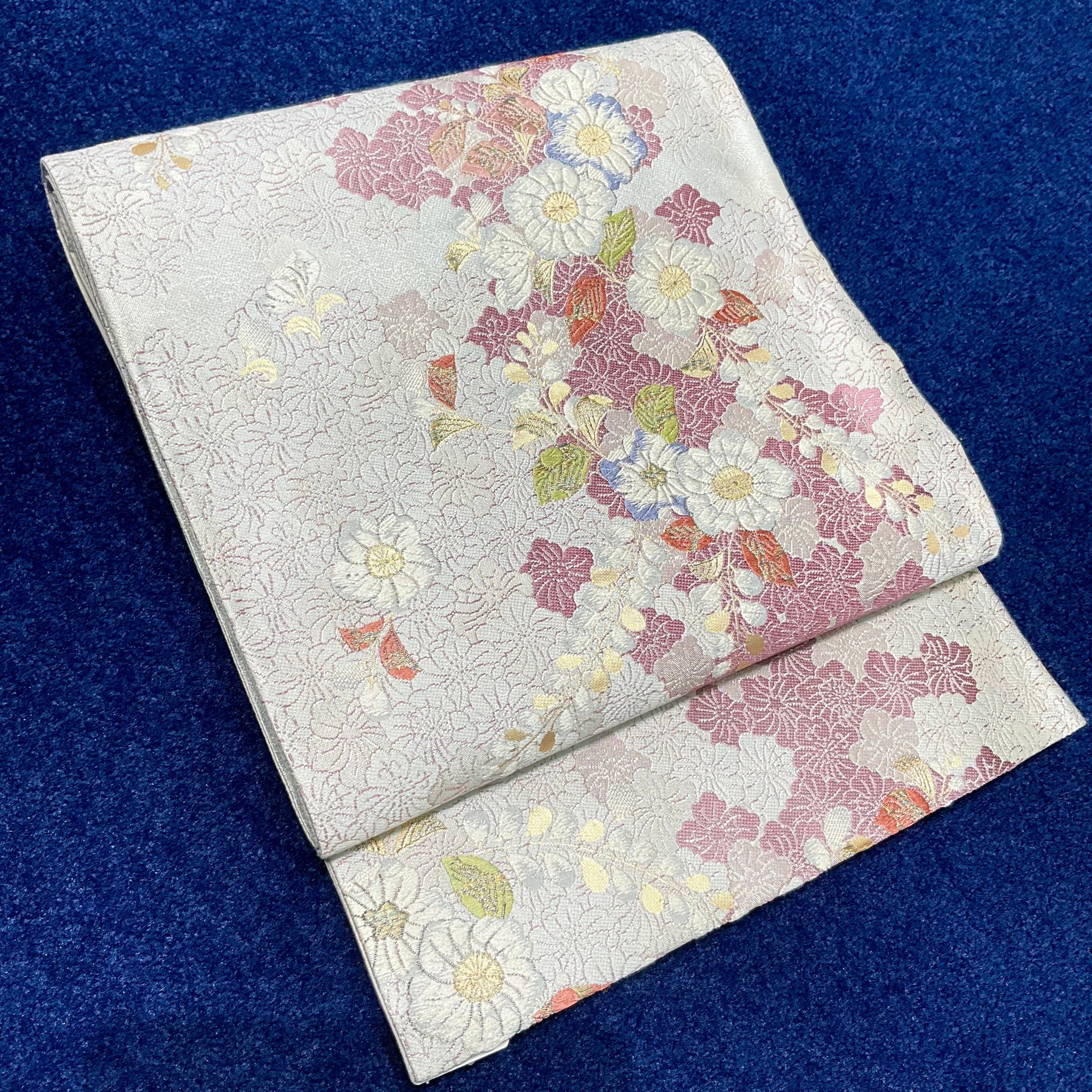 枝垂れる藤が美しく、地色の青みがかった白っぽいグレーが控えめですが、帯地いっぱいに咲き溢れる桜の花、帯地右寄りに施された色彩豊かな織り模様は華やかで上品なデザインですね✨