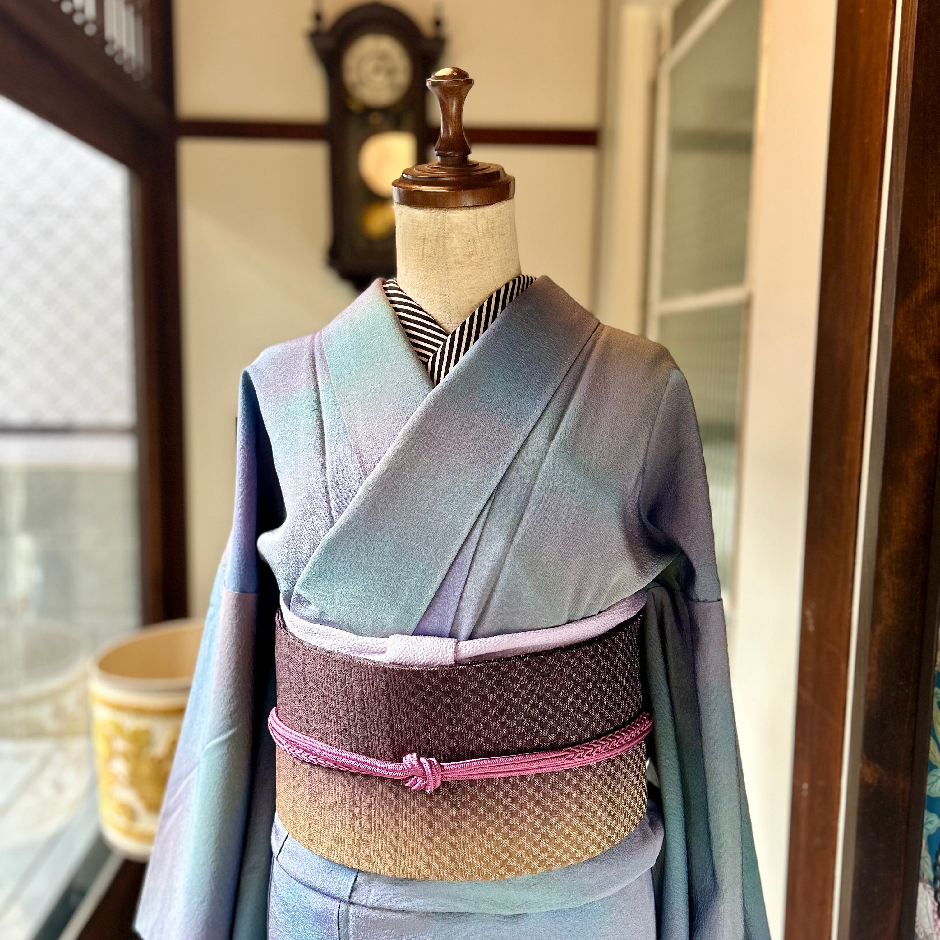 ○合わせた着物とオリジナル三分紐リバーシブルライン プラム×ミントもweb shop掲載品です♪