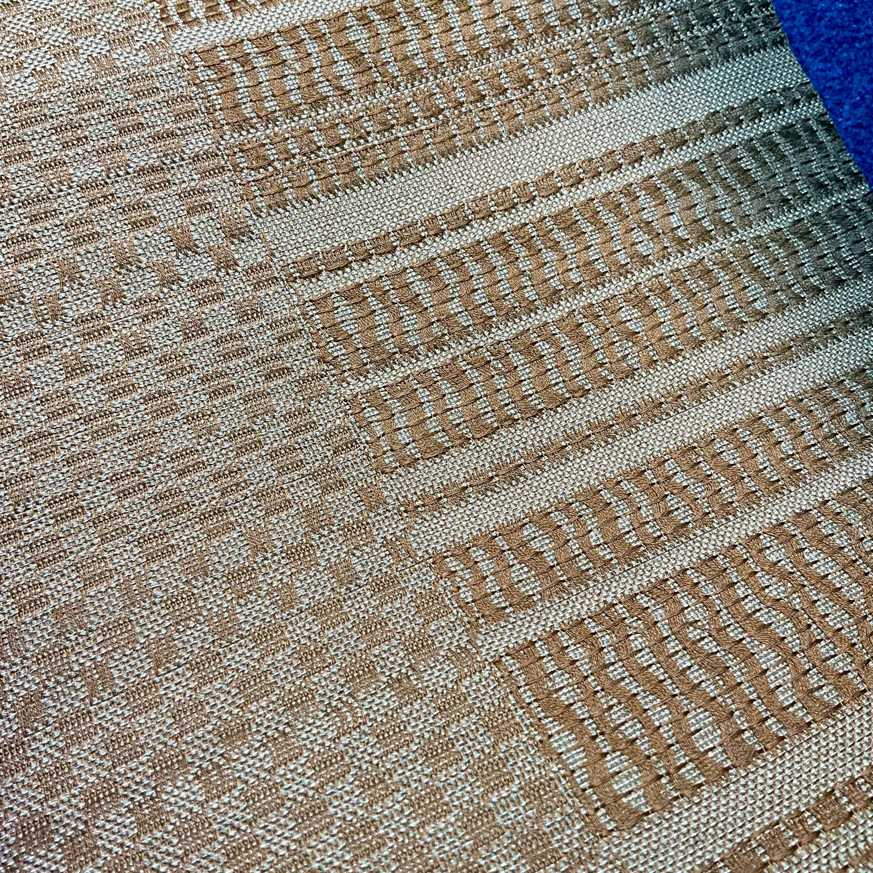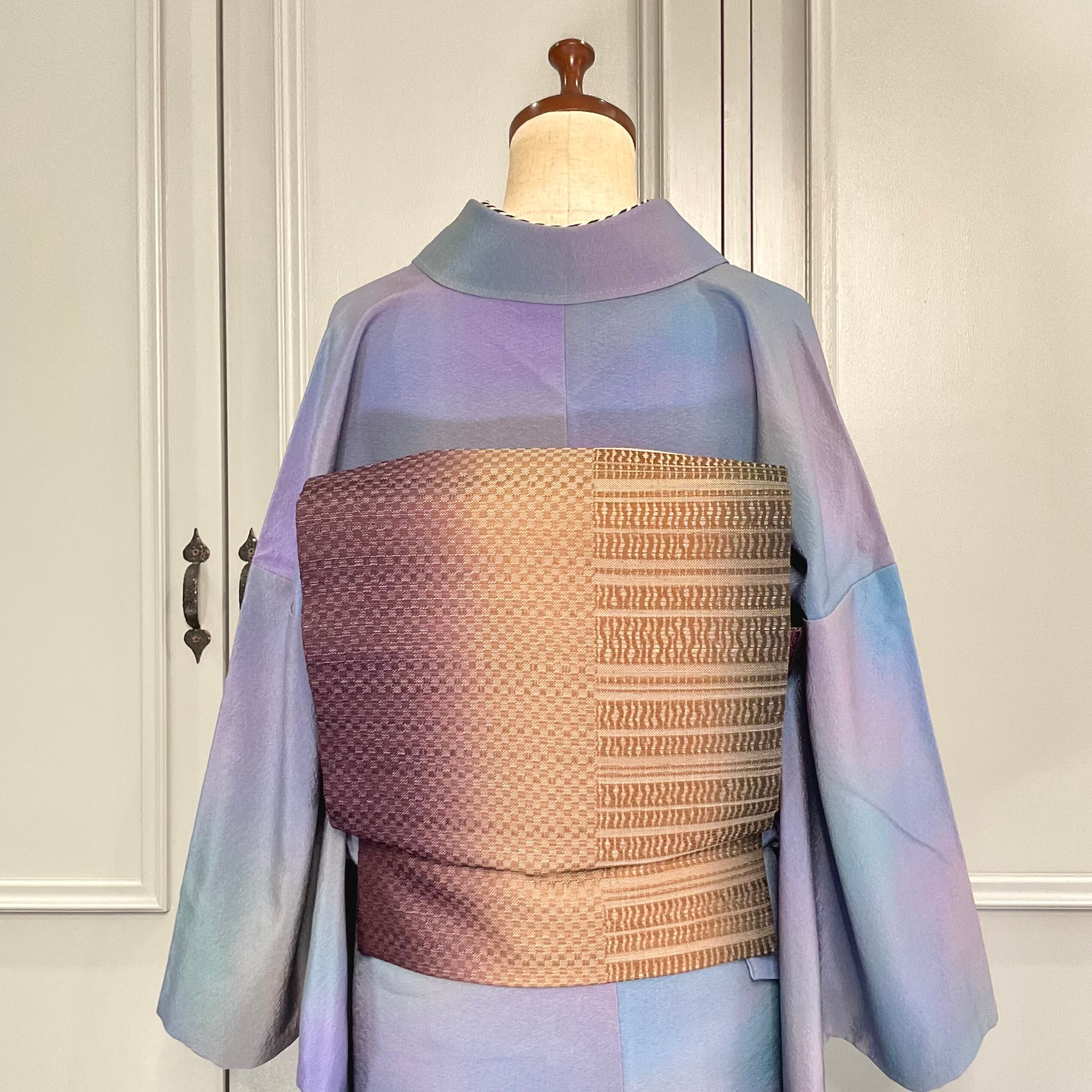 落ち着いたこっくりと深いお色に、繊細な織模様は美しく、織りの重なりでデザインされたカラーグラデーションはモダンで粋さを感じますね✨