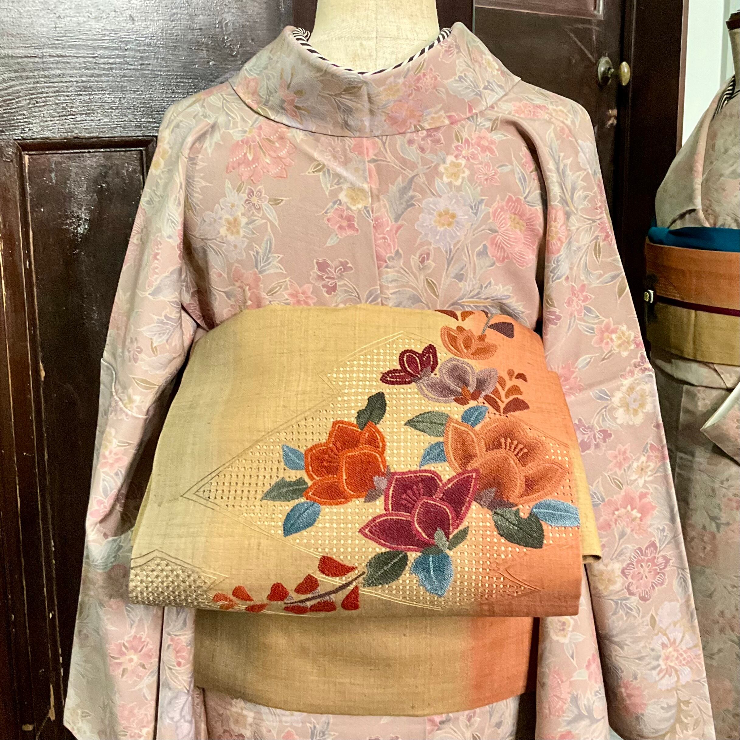 深みのある刺繍はグリーン、ボルドー、オレンジ、パープルの花模様がオリーブの地色と奥行きのあるスワトウ刺繍と紬の風合いに馴染み、趣ある帯姿に♪̊̈♪̆̈