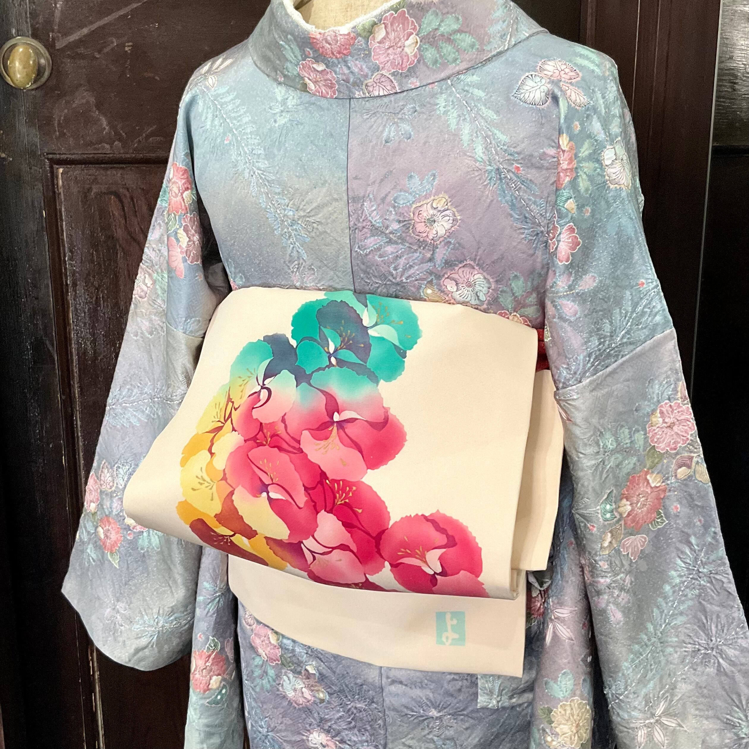 色の濃淡によって花模様の陰影、奥行きを感じ、塩瀬のサラリとした帯地が華やいでいますね✨️