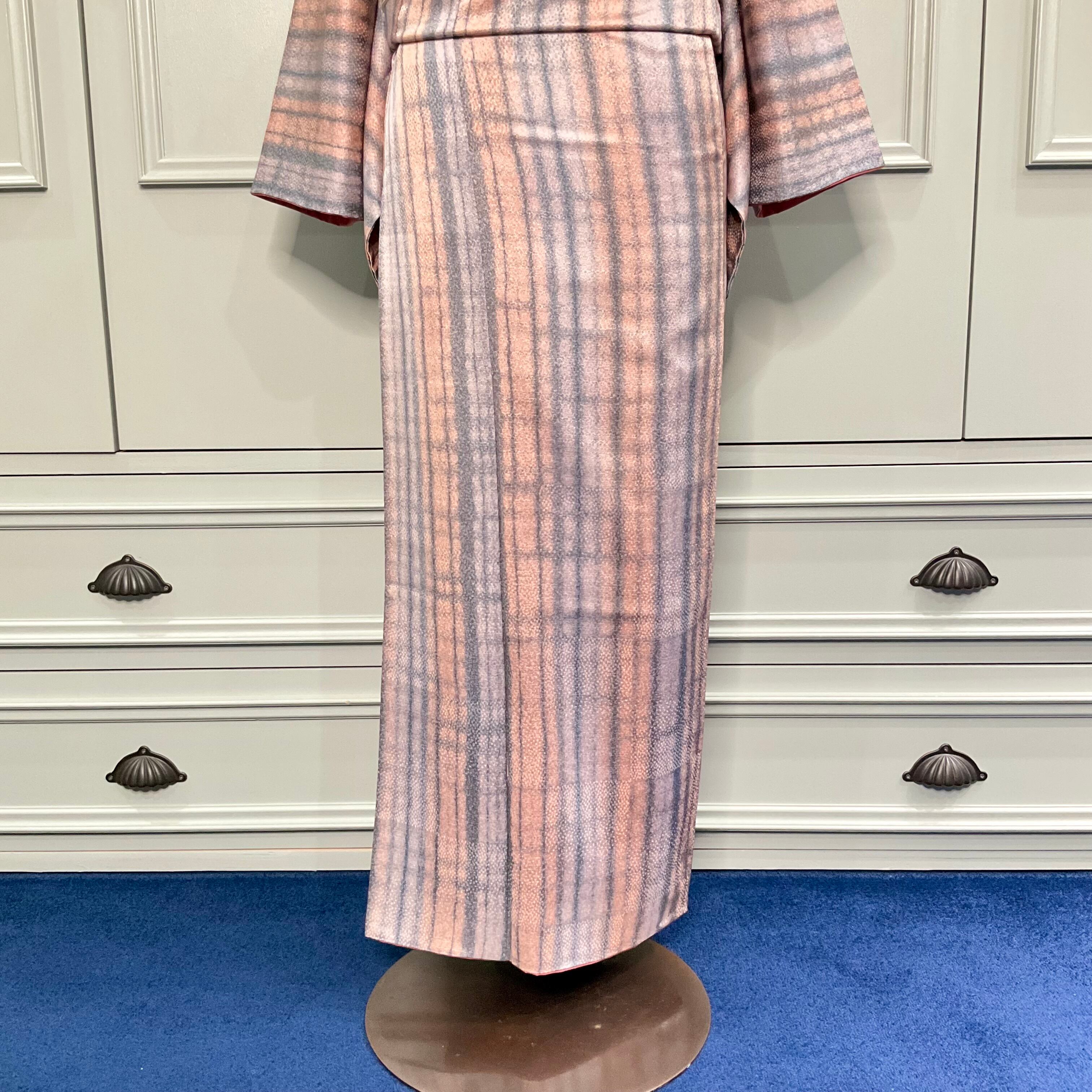 格子の向こう*チェック柄 市松模様 くすみカラー リサイクル小紋着物 A567