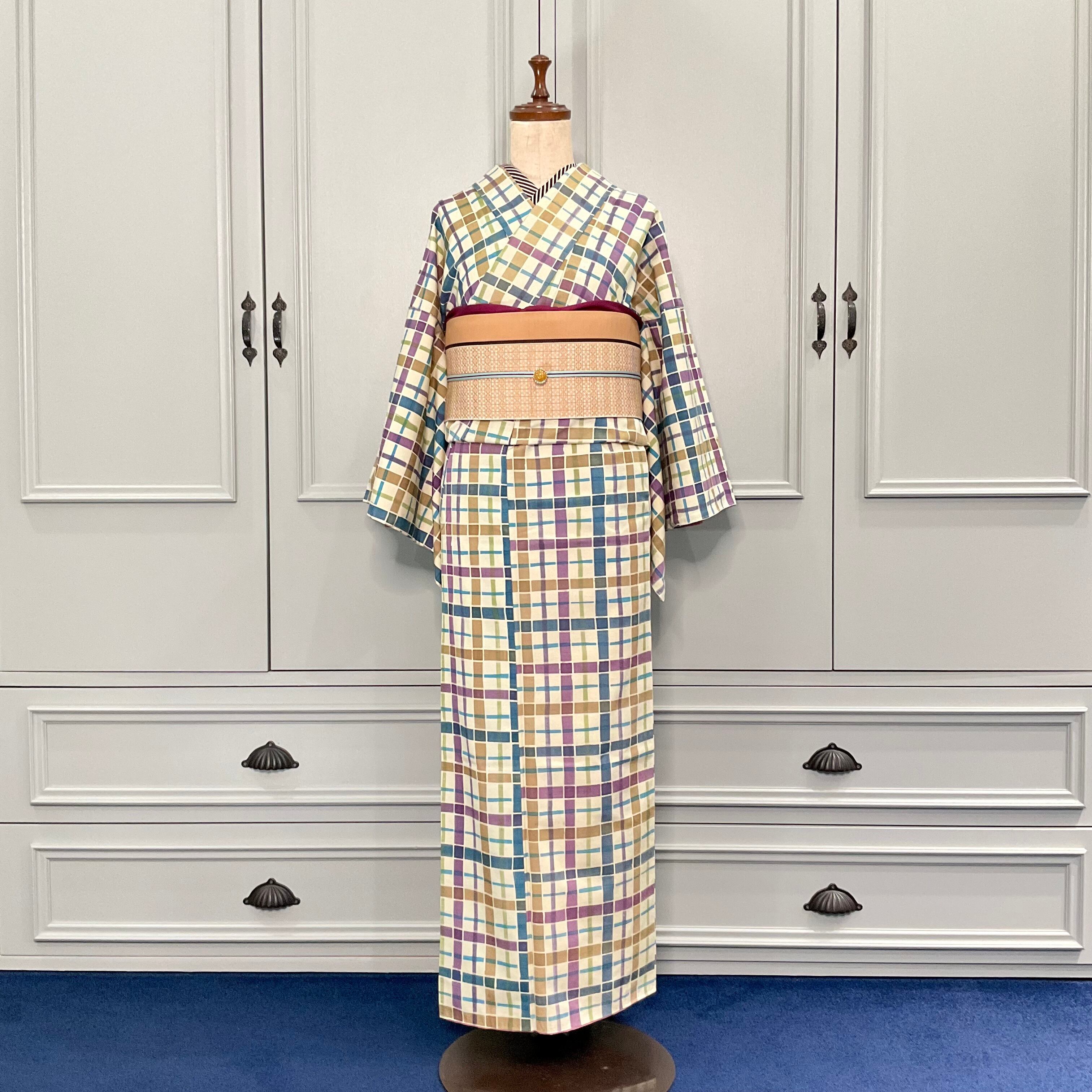 エルクベージュの地色にやわらかなチェック柄が描かれたリサイクル染め紬着物です