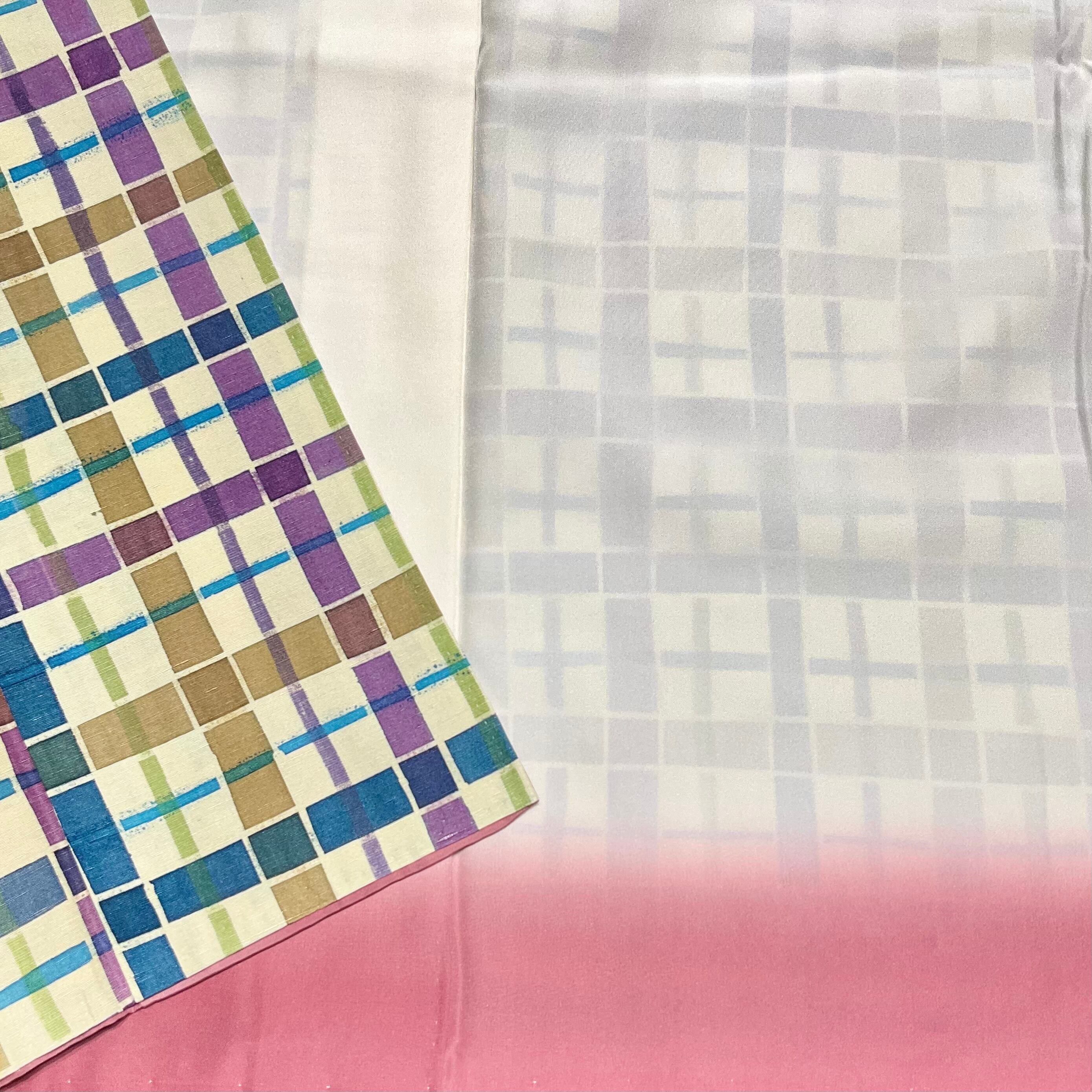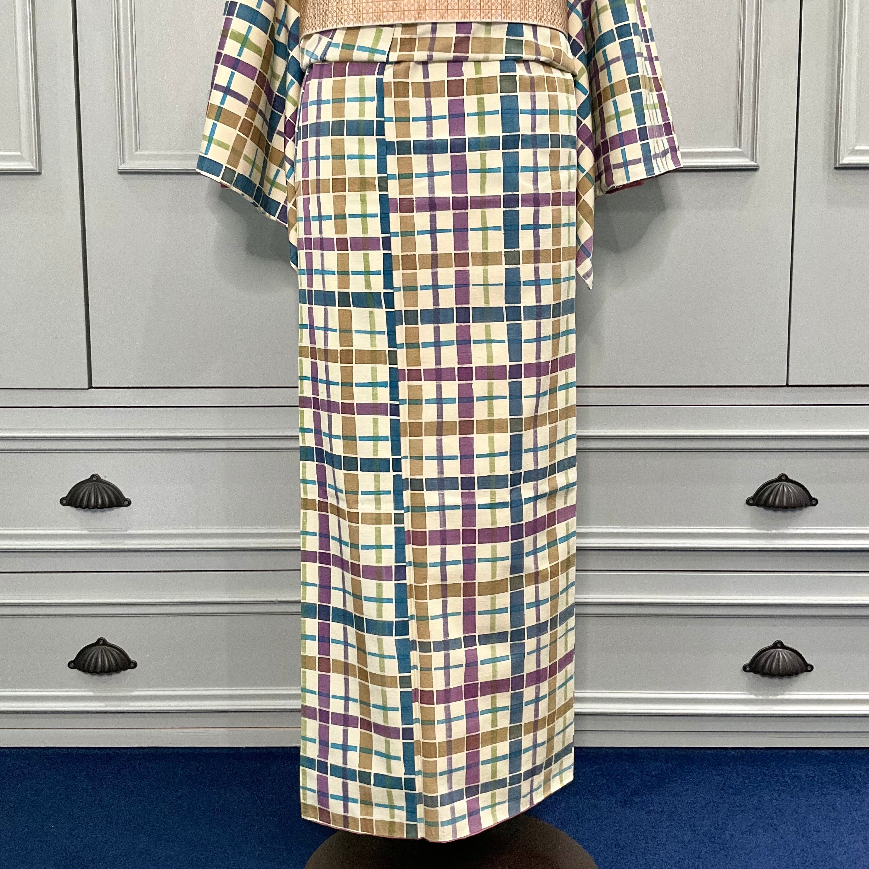 レトロチェック*格子 くすみカラー リサイクル紬着物 A568