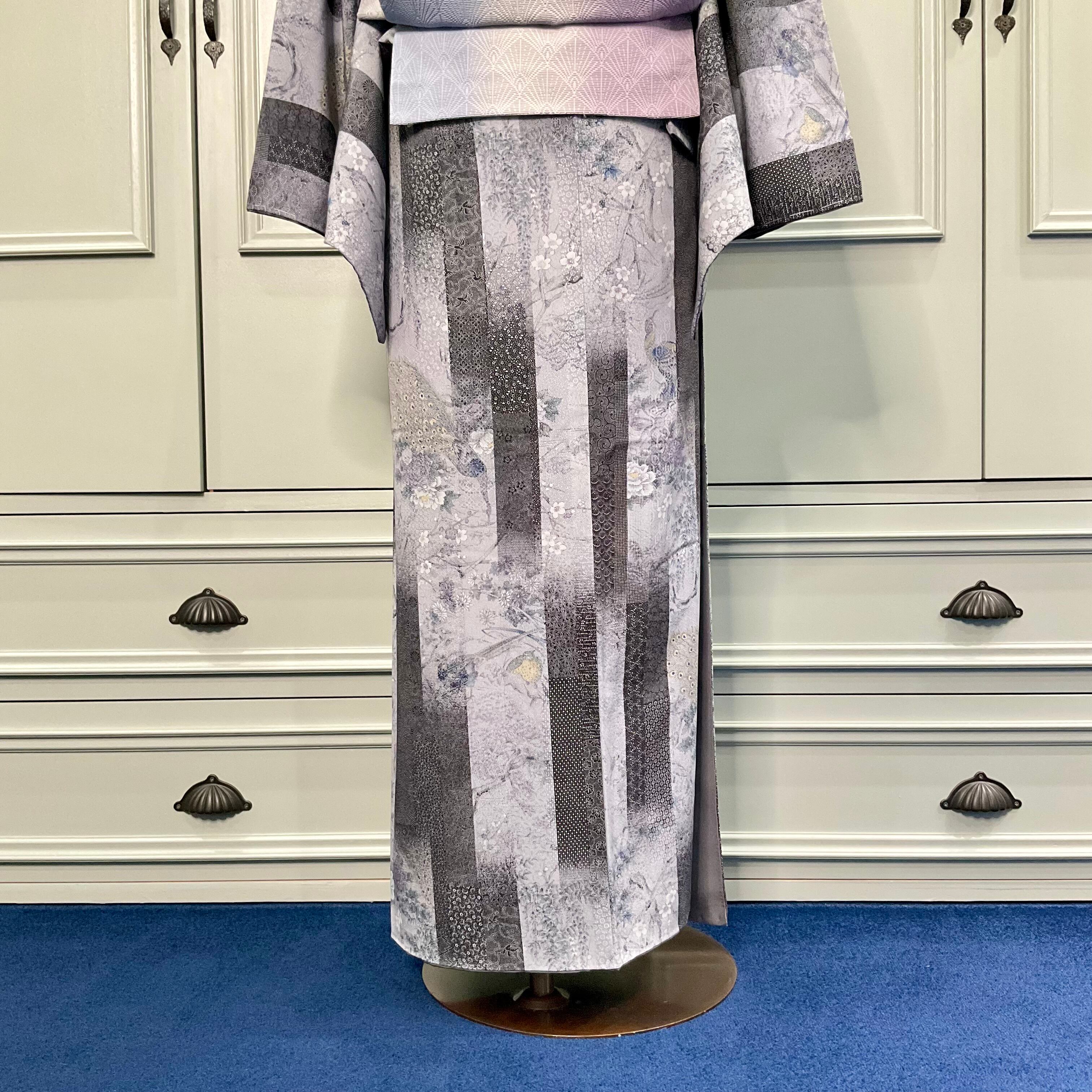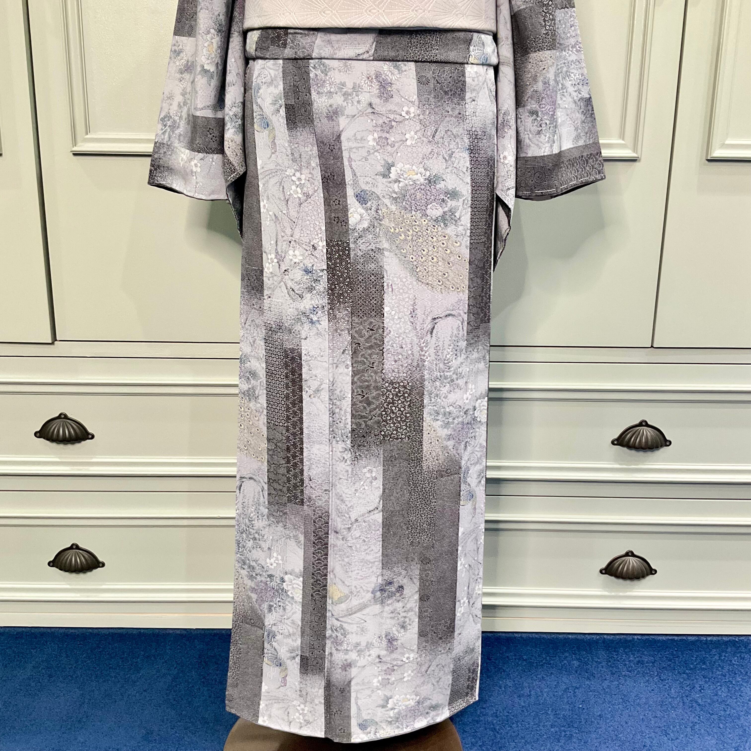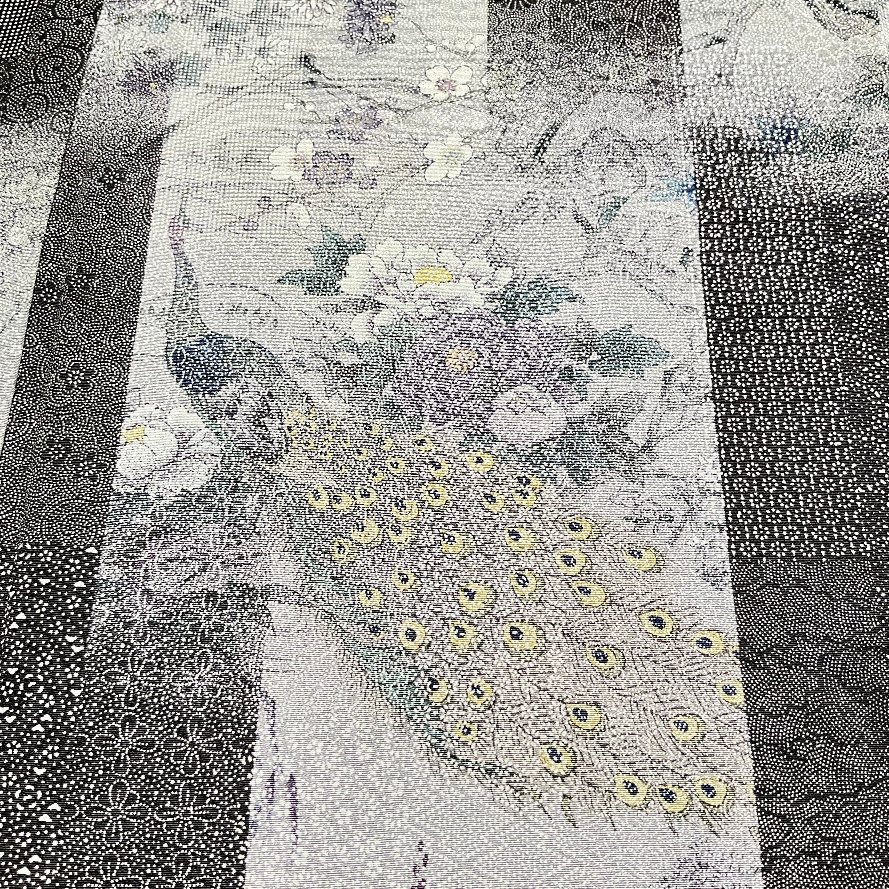 黒とグレーの地色に細やかな江戸小紋文様が施され、その中でも孔雀の優美な姿が印象的なリサイクル小紋です