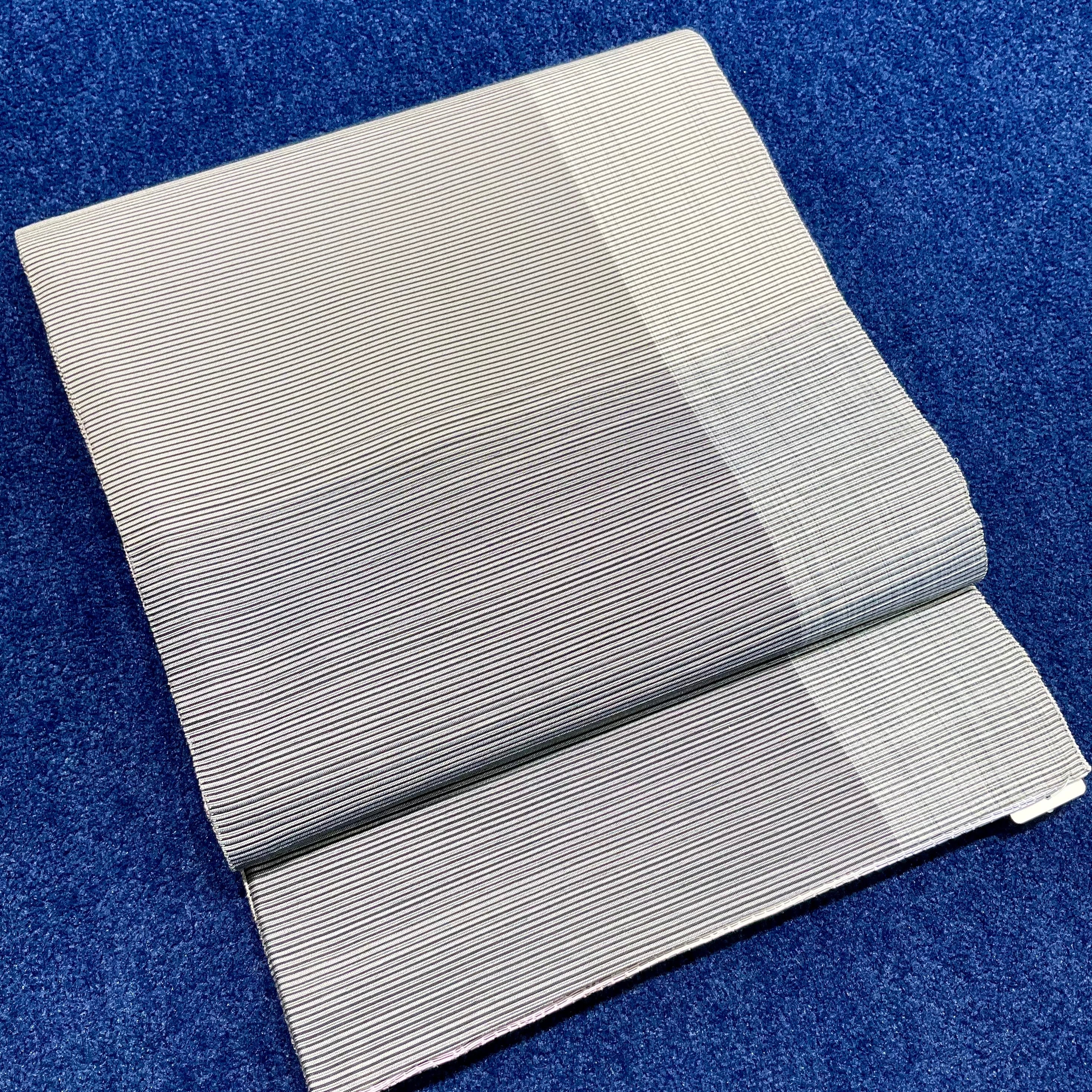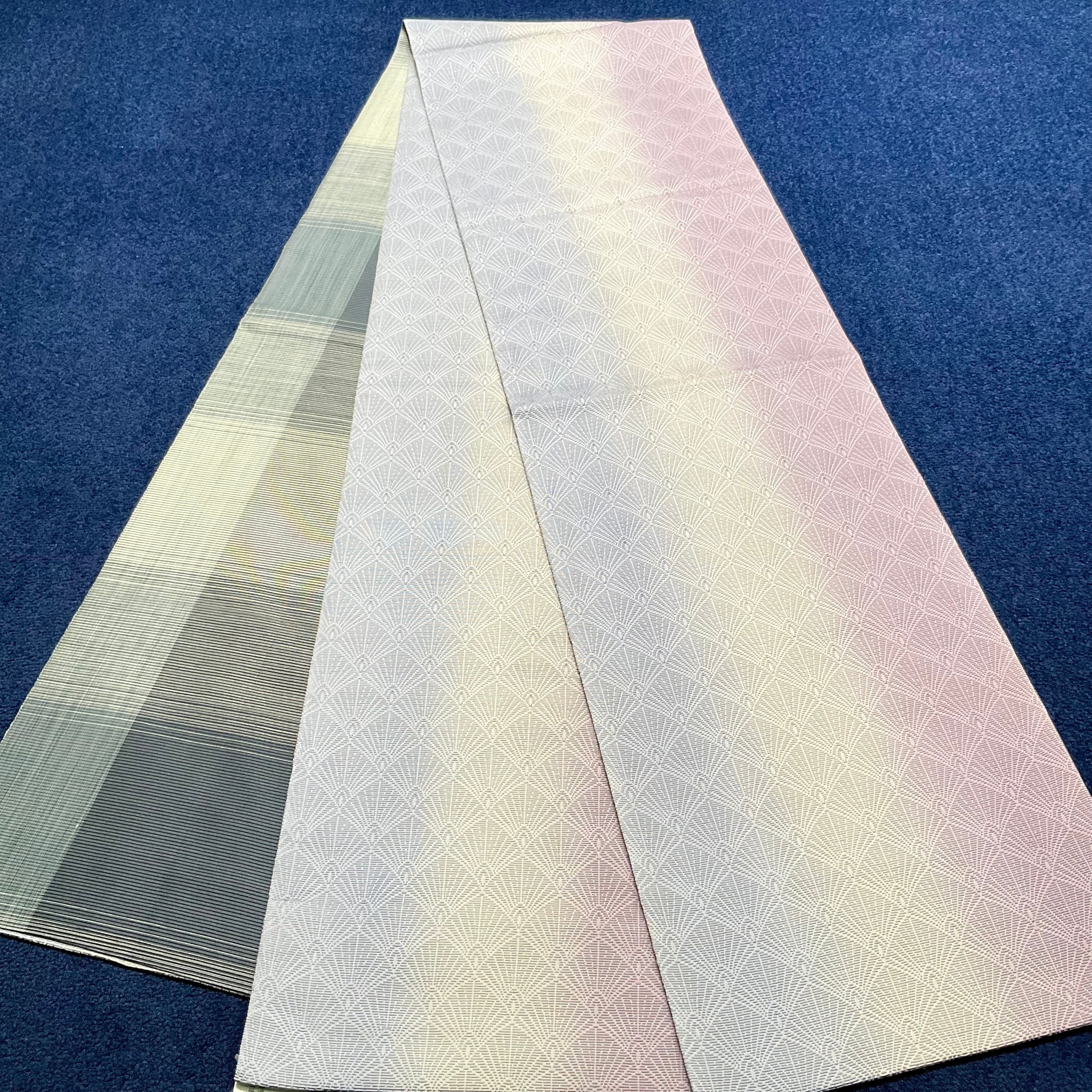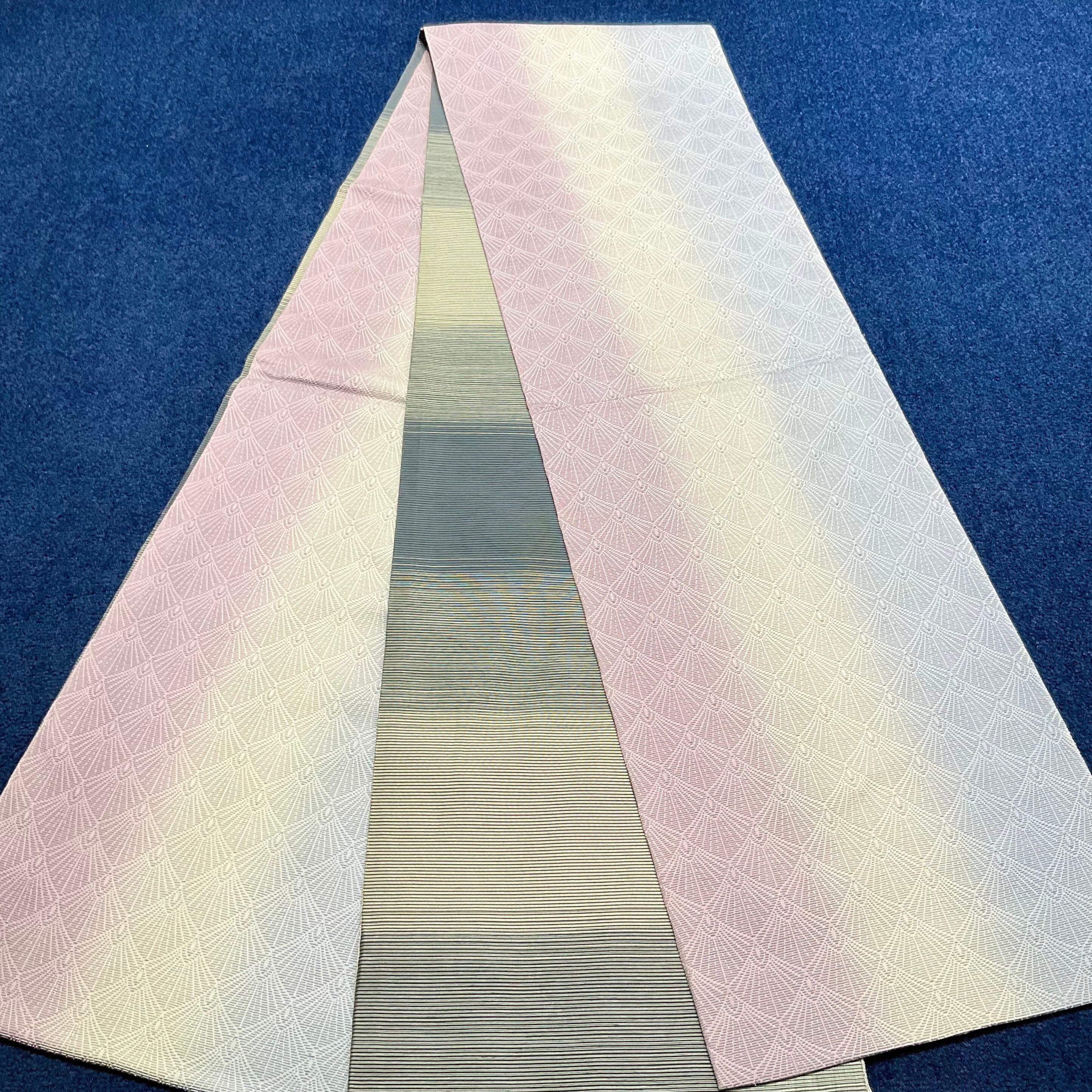 スッキリとシンプルながらも、地色が寒色と暖色の組み合わせで、合わせる着物を選ばずコーディネートを楽しめ、重宝する1本です