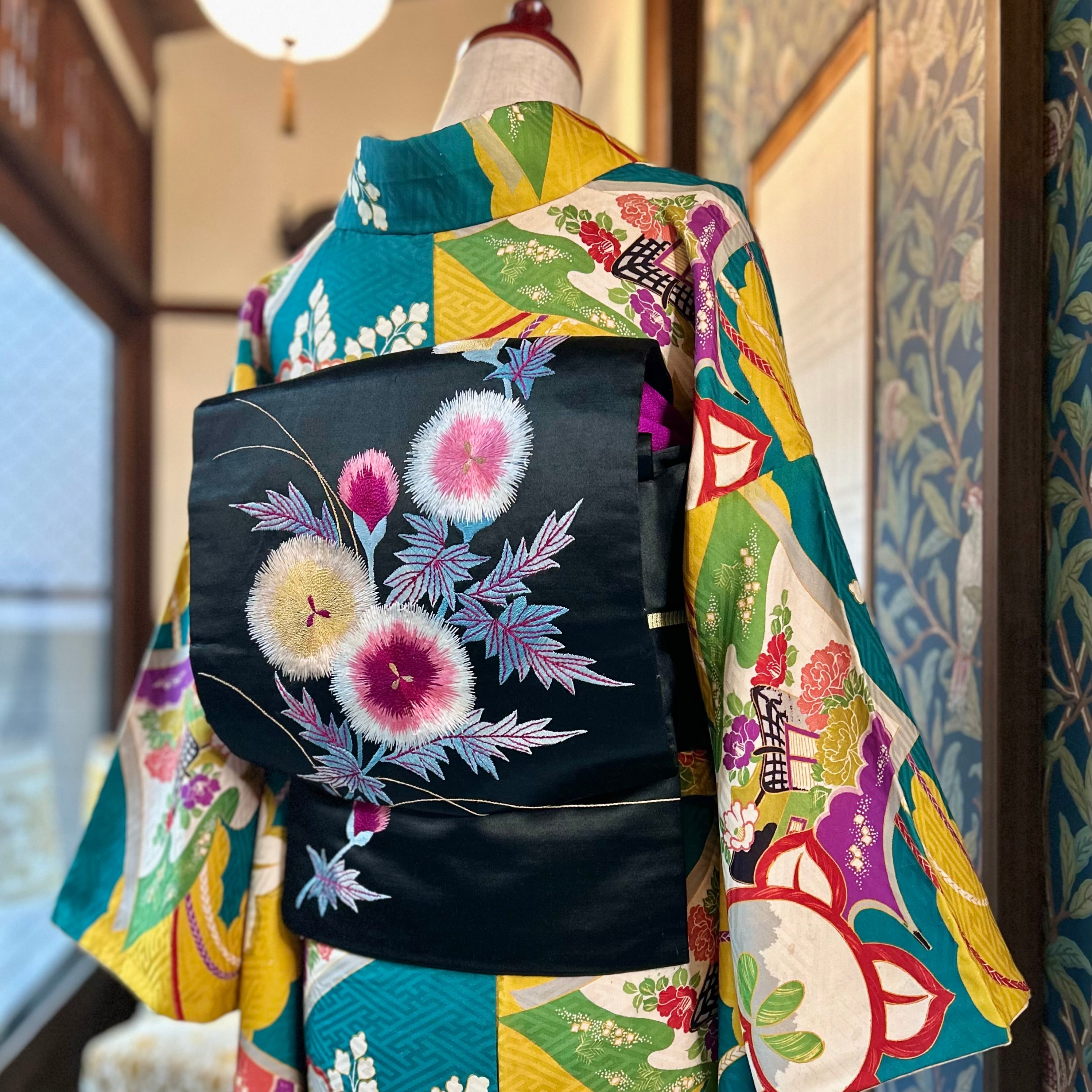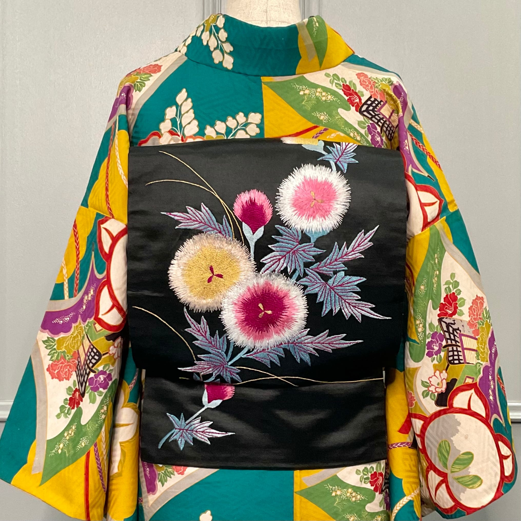 黒地なので、華やかで色数の多いアンティーク着物に合わせてもグッと締まります♪