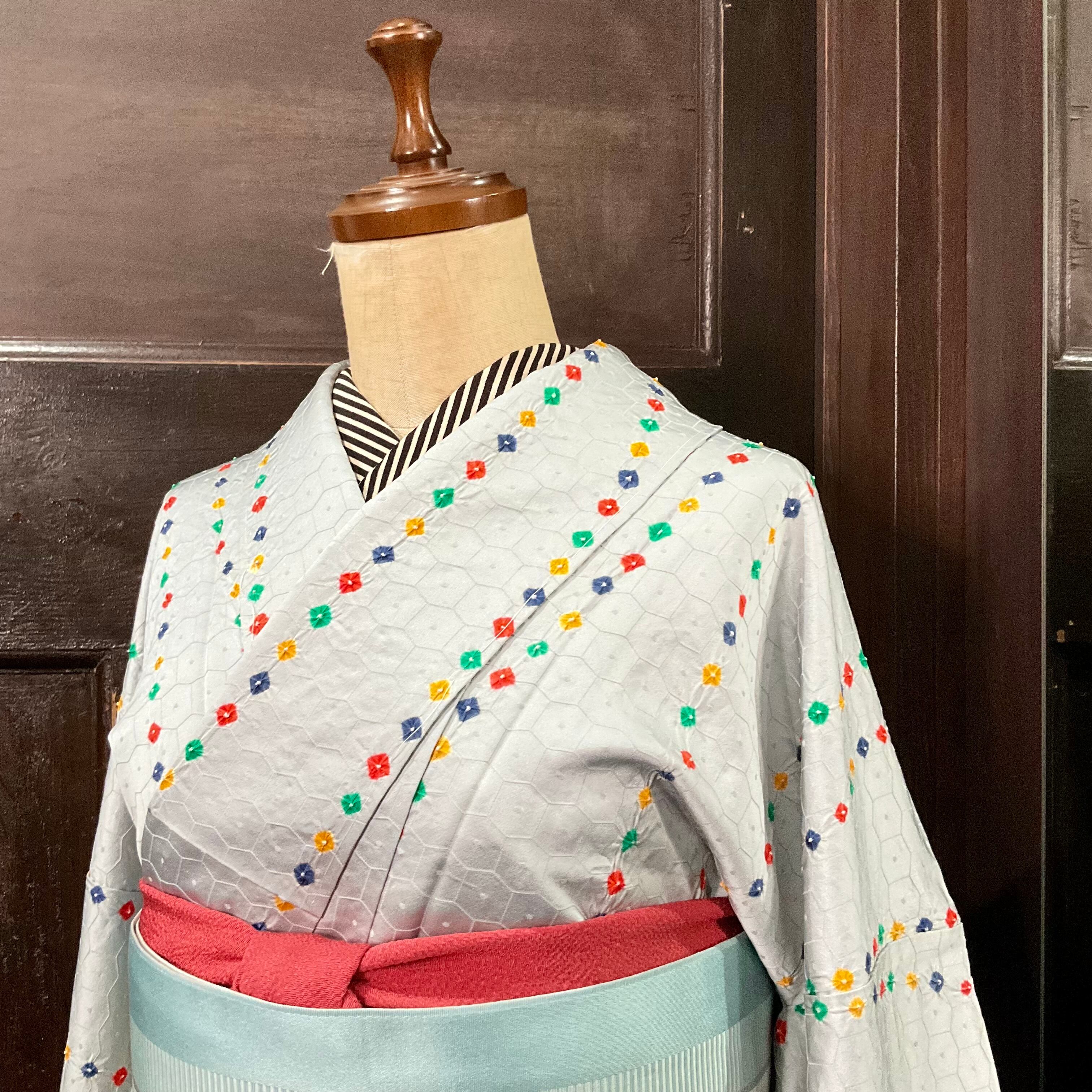 グレーの地色にカラフルな絞りが縦にポツポツと染められたかわいらしいリサイクル小紋着物です