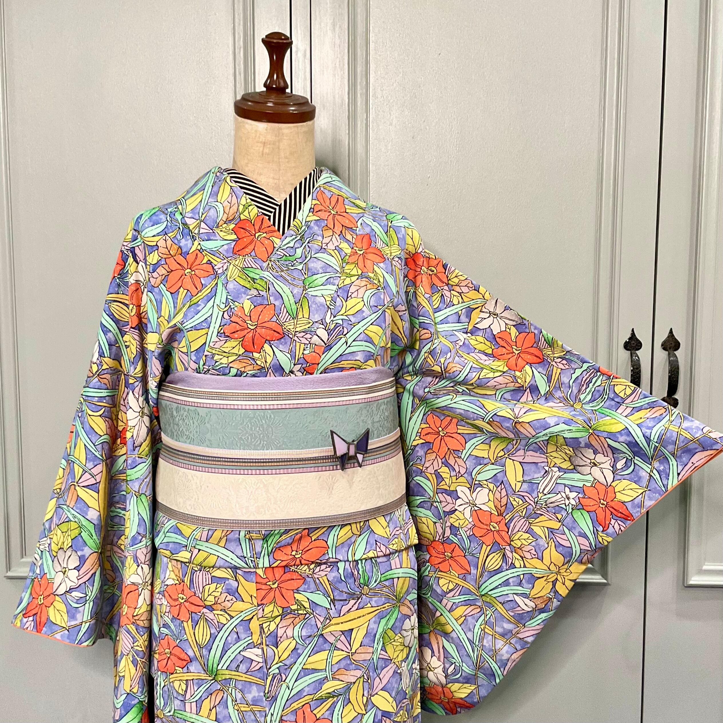 long*ボタニカルアート*洋花 ブルー オレンジ 小紋着物 A578