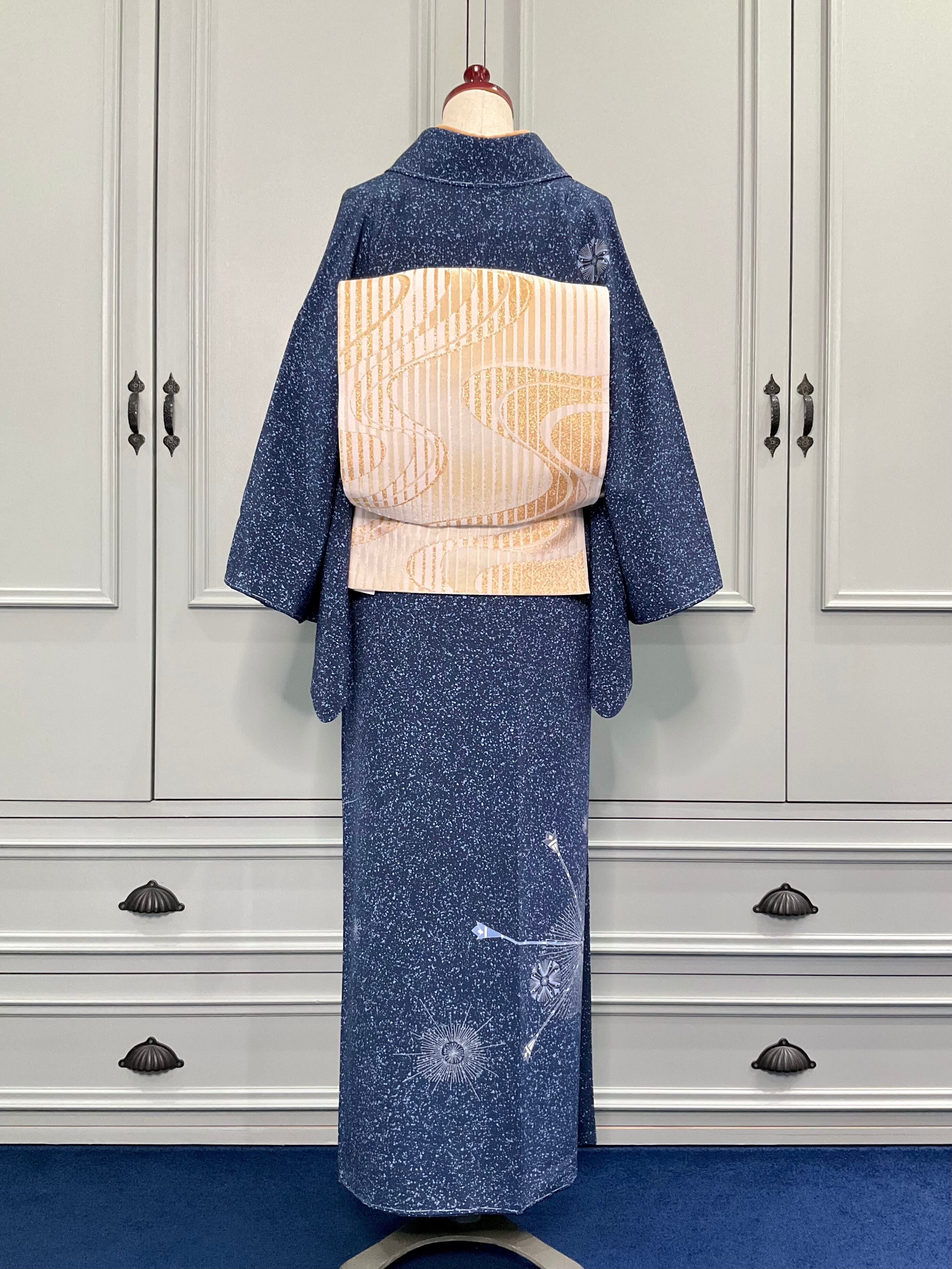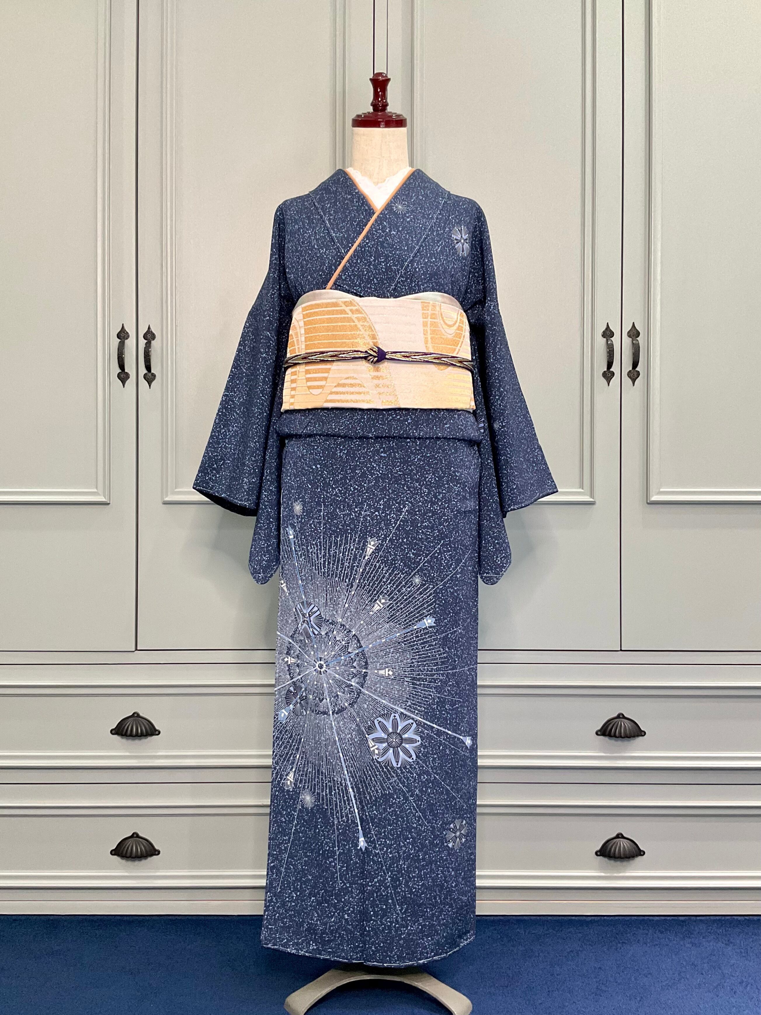 ネイビーの地色にたたき染めを施し、スタイリッシュなデザインが目を惹く作家物のリサイクル付下げです