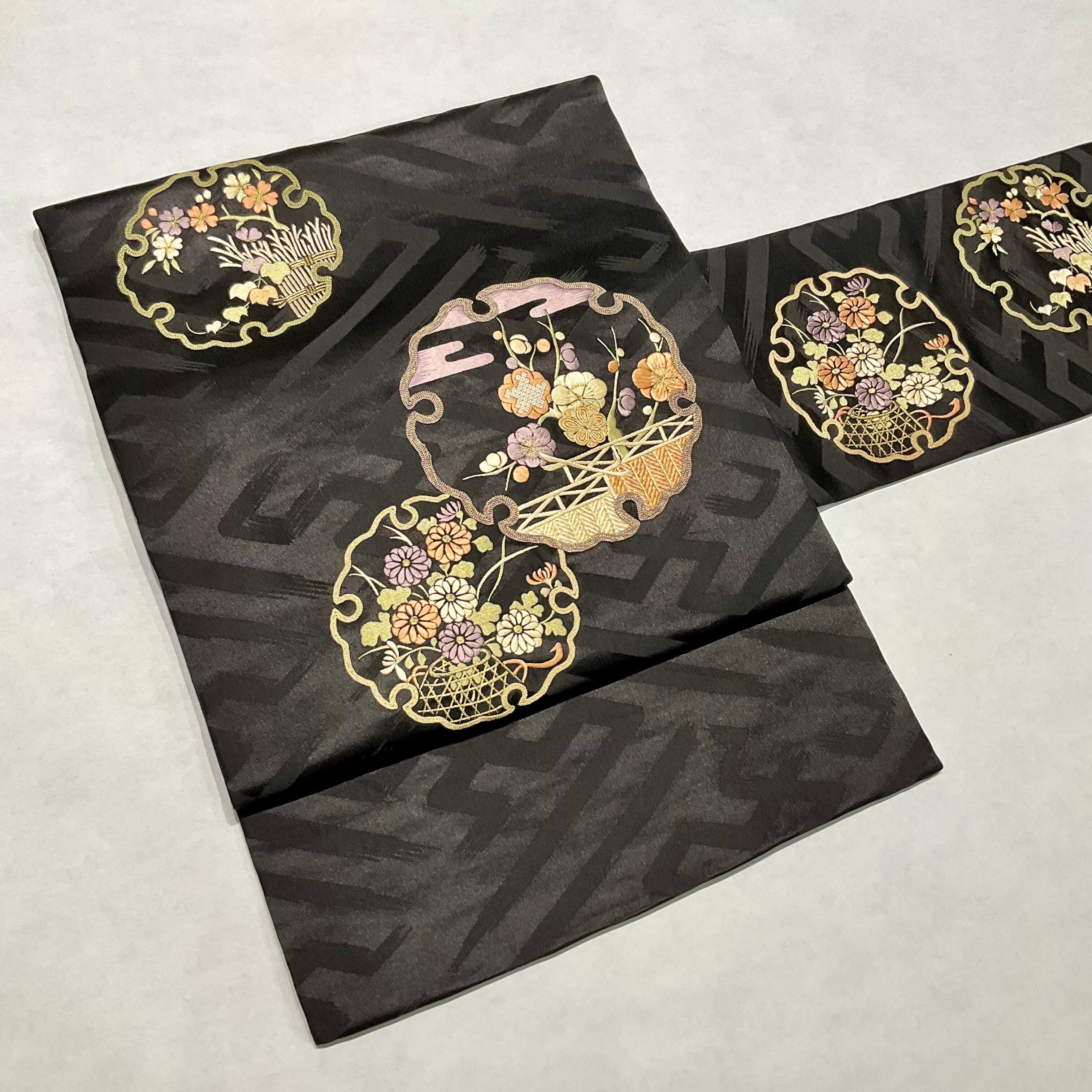 雪輪*刺繍 梅 桜 菊 花 黒繻子 アンティーク名古屋帯 A582