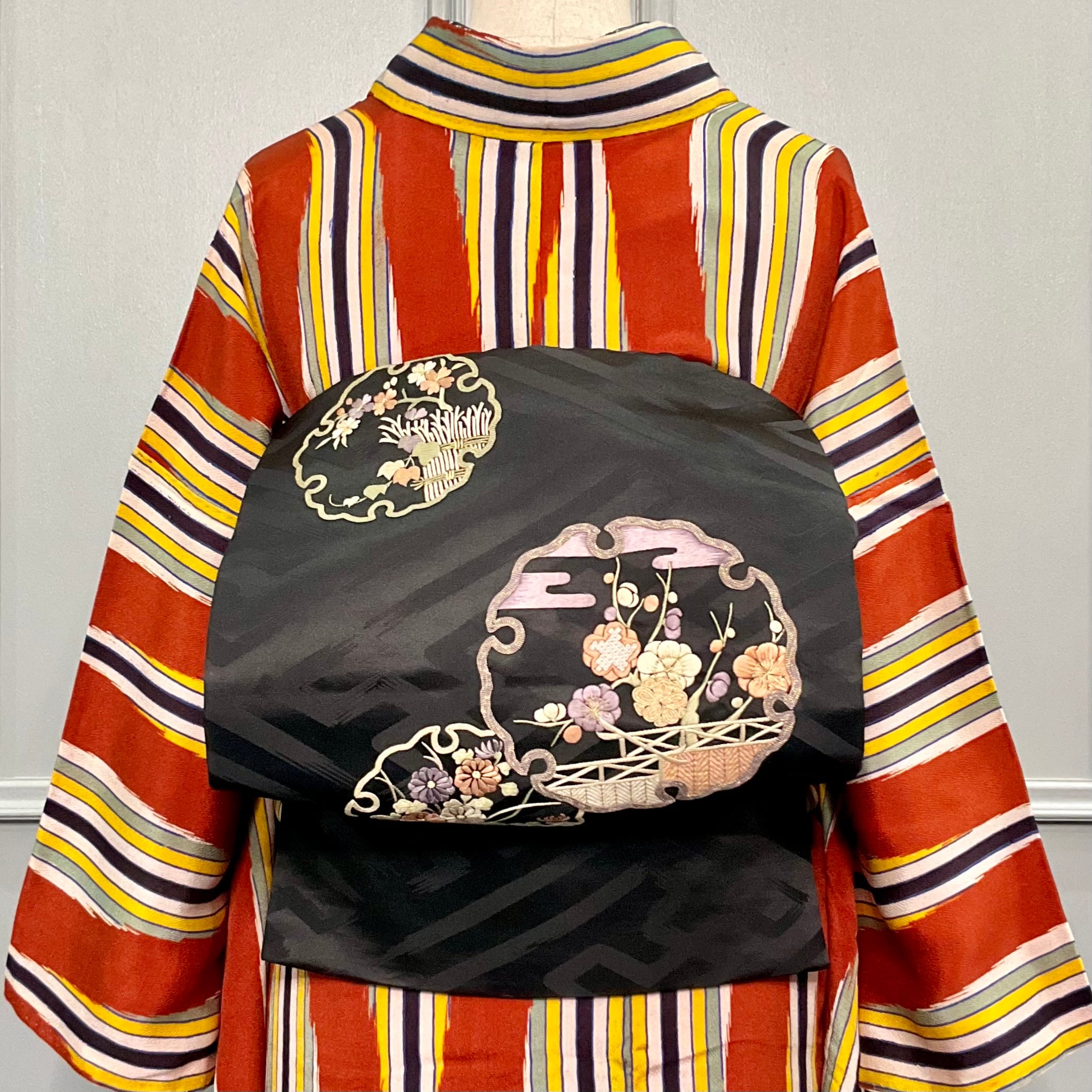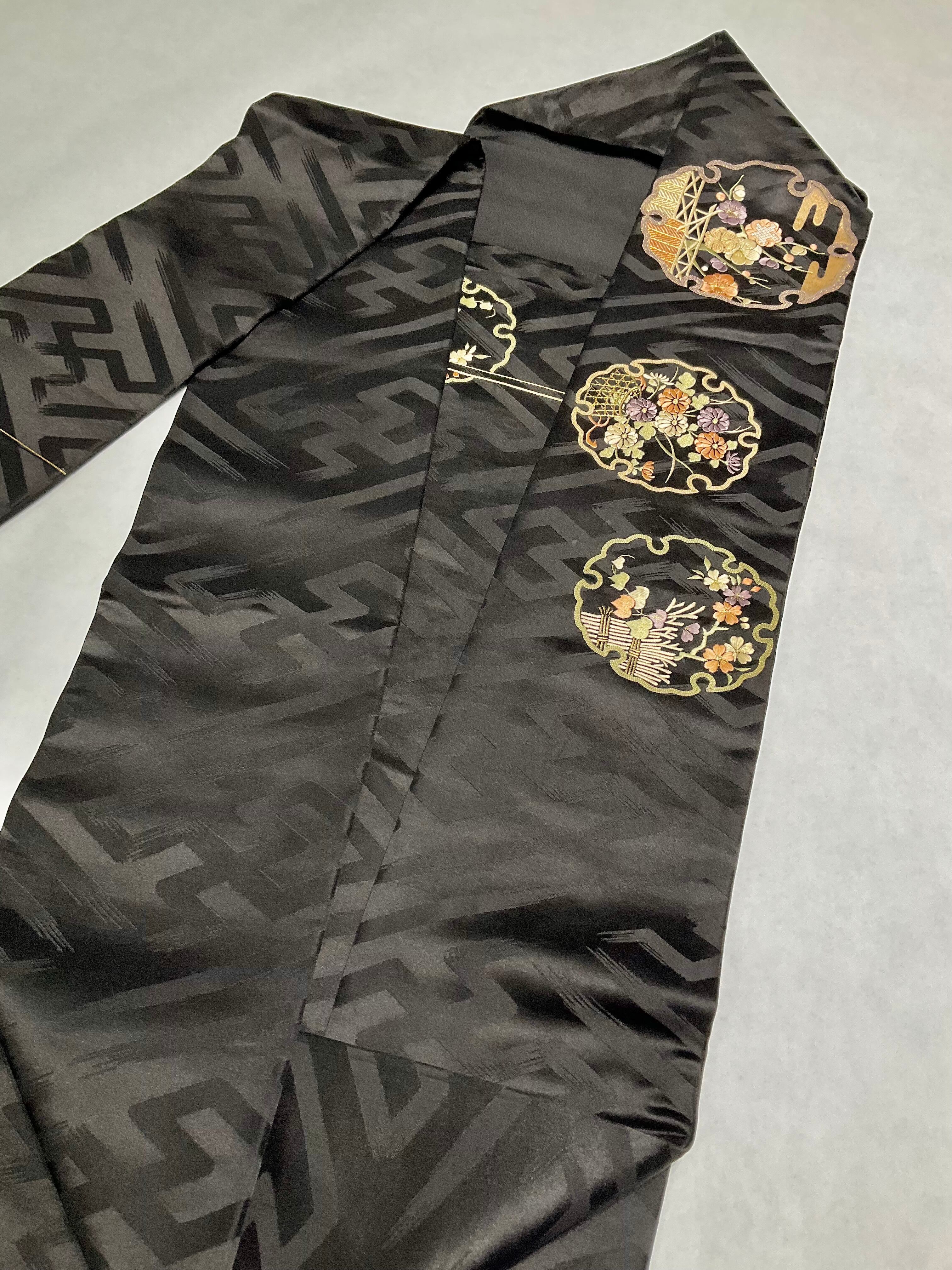 黒地なので、華やかで色数の多いアンティーク着物に合わせてもグッと締まります♪