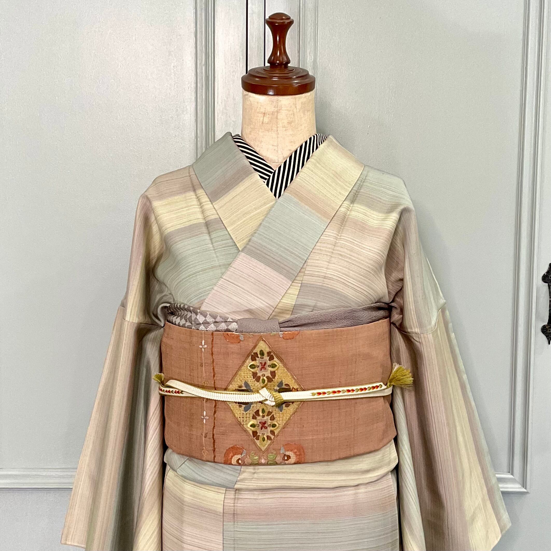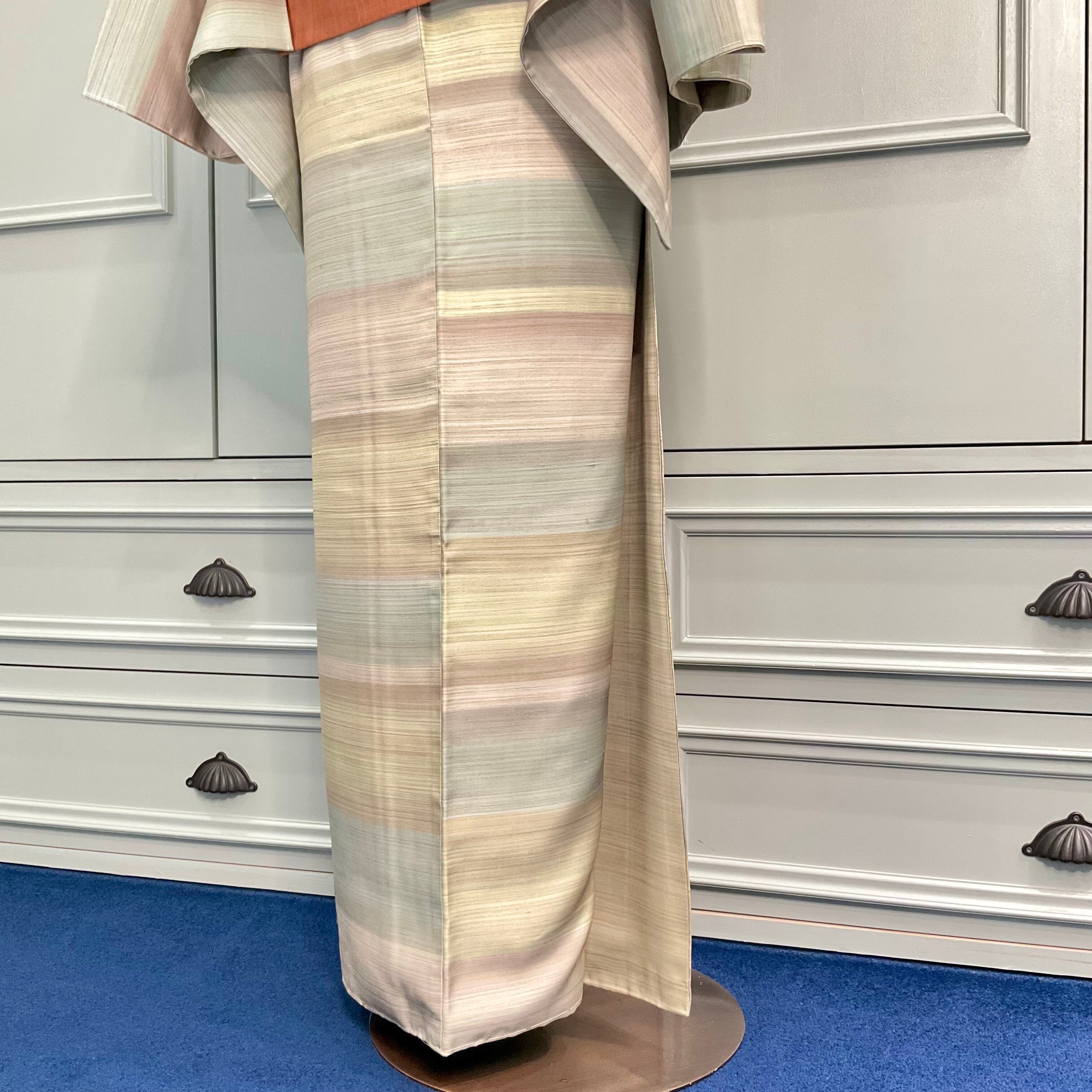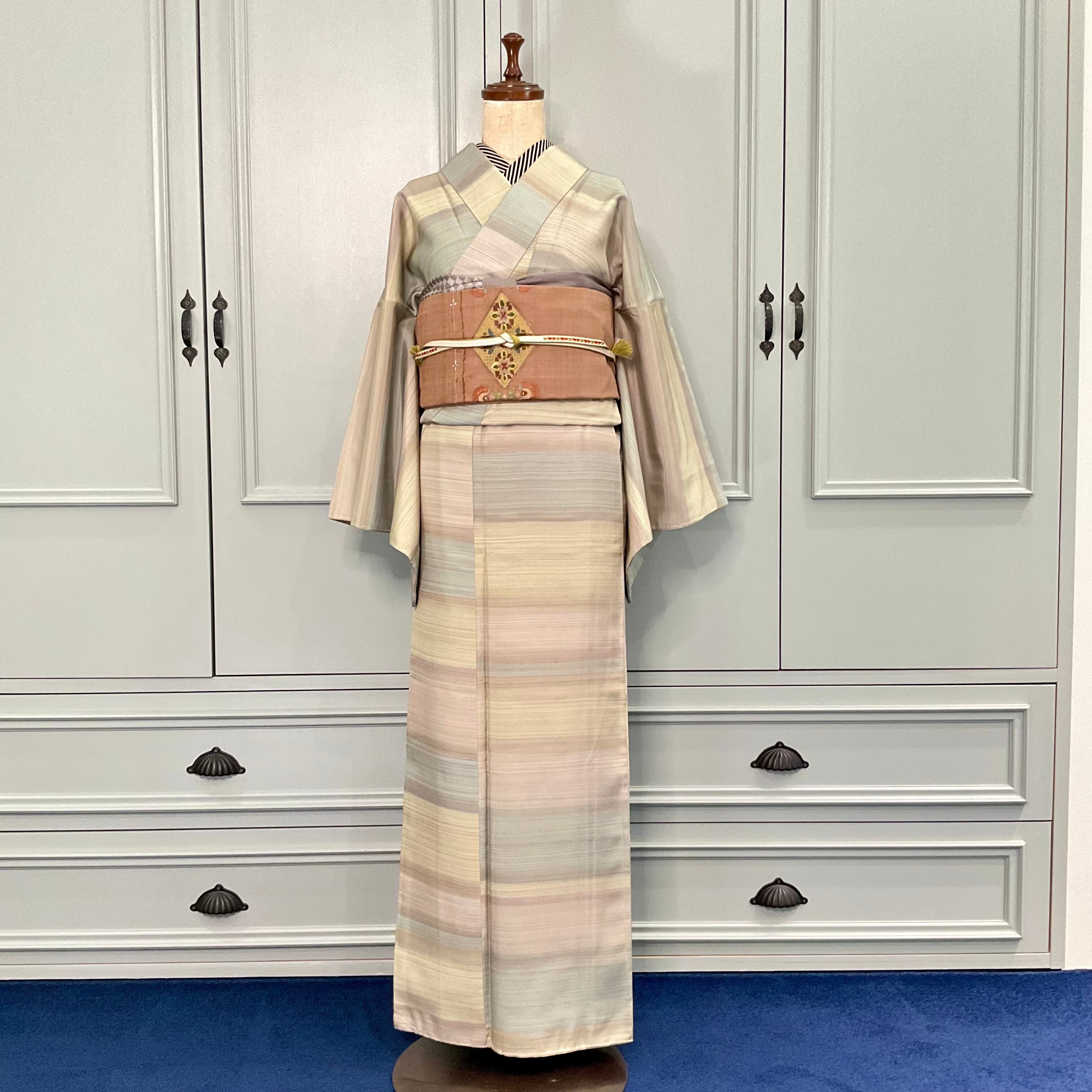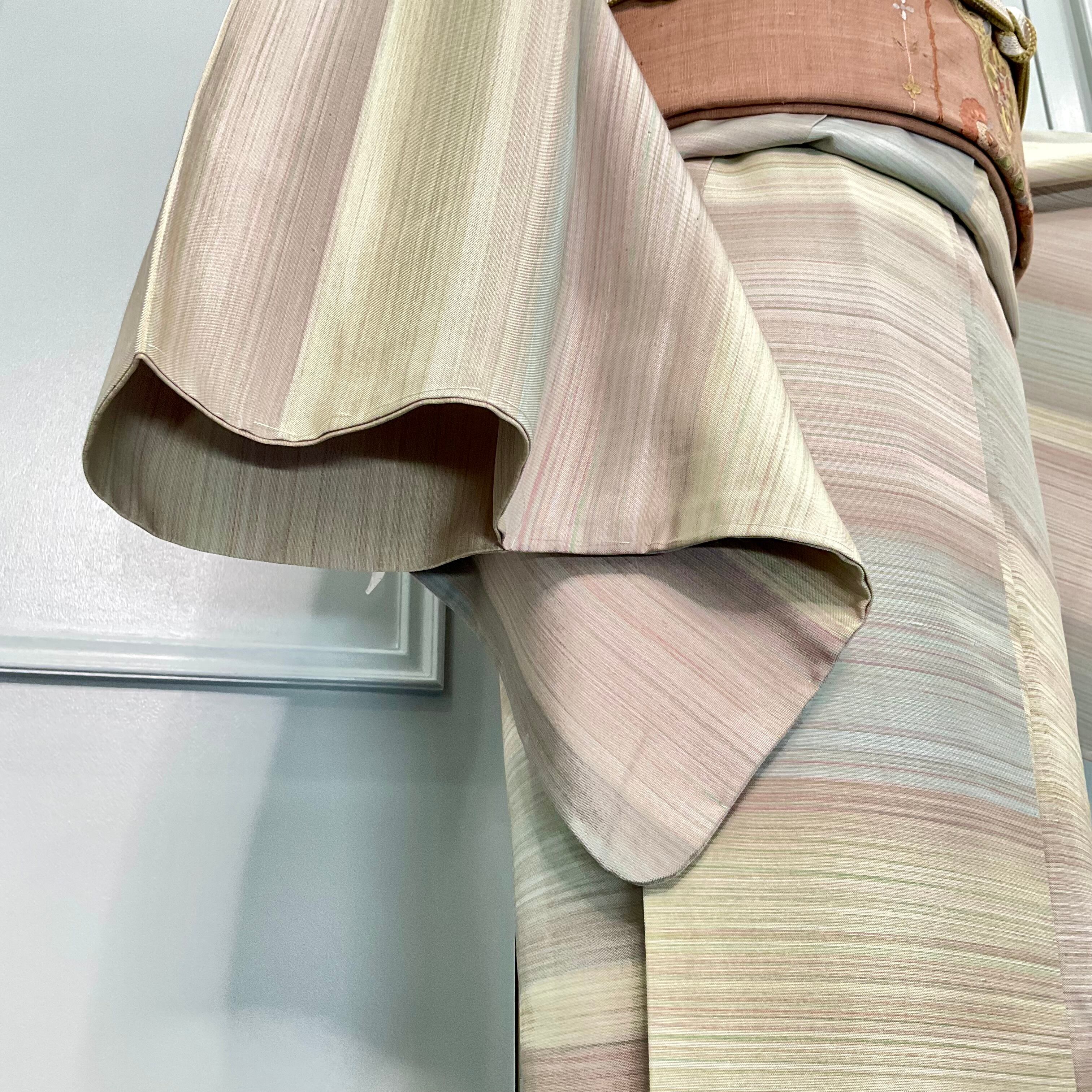 淡い色合いの縞模様は無地感覚でさまざまな帯を合わせやすく、 季節を問わず長く飽きずに重宝いただけるのでオススメです