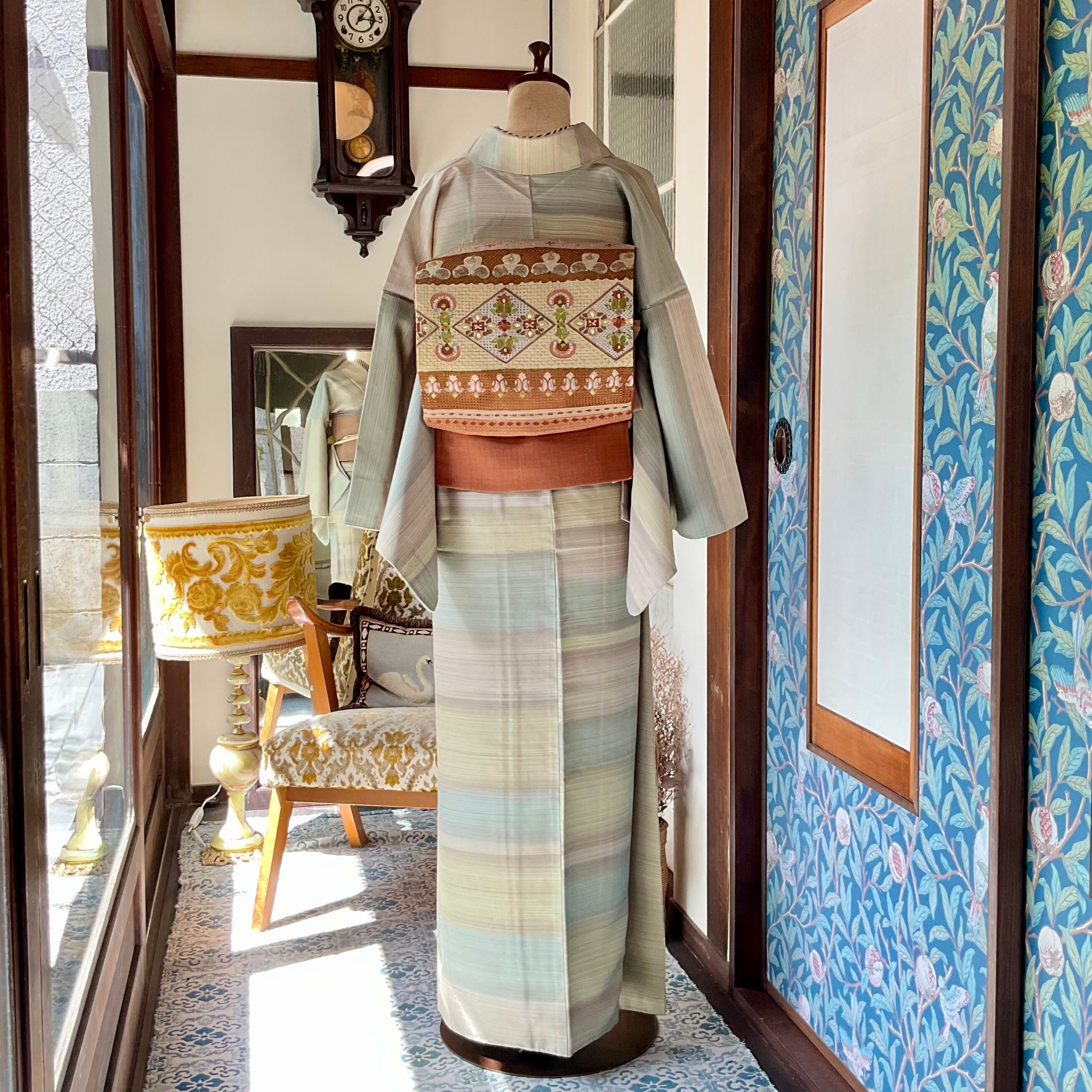 奥行きのある刺繍はグリーン、ラベンダー、ブルー、ボルドーなどで様々なカラーで彩られ、紬の風合いに馴染み、趣ある帯姿に♪