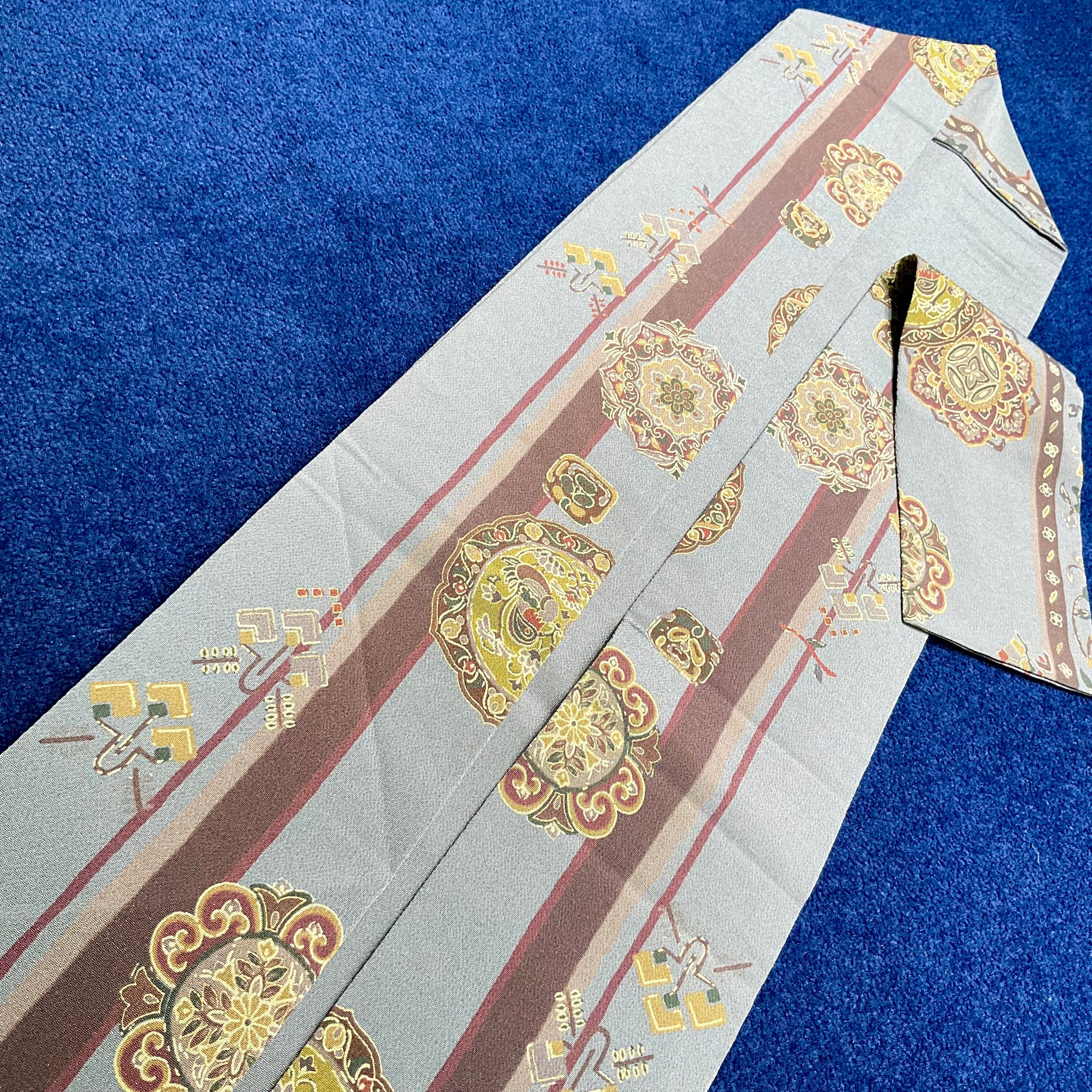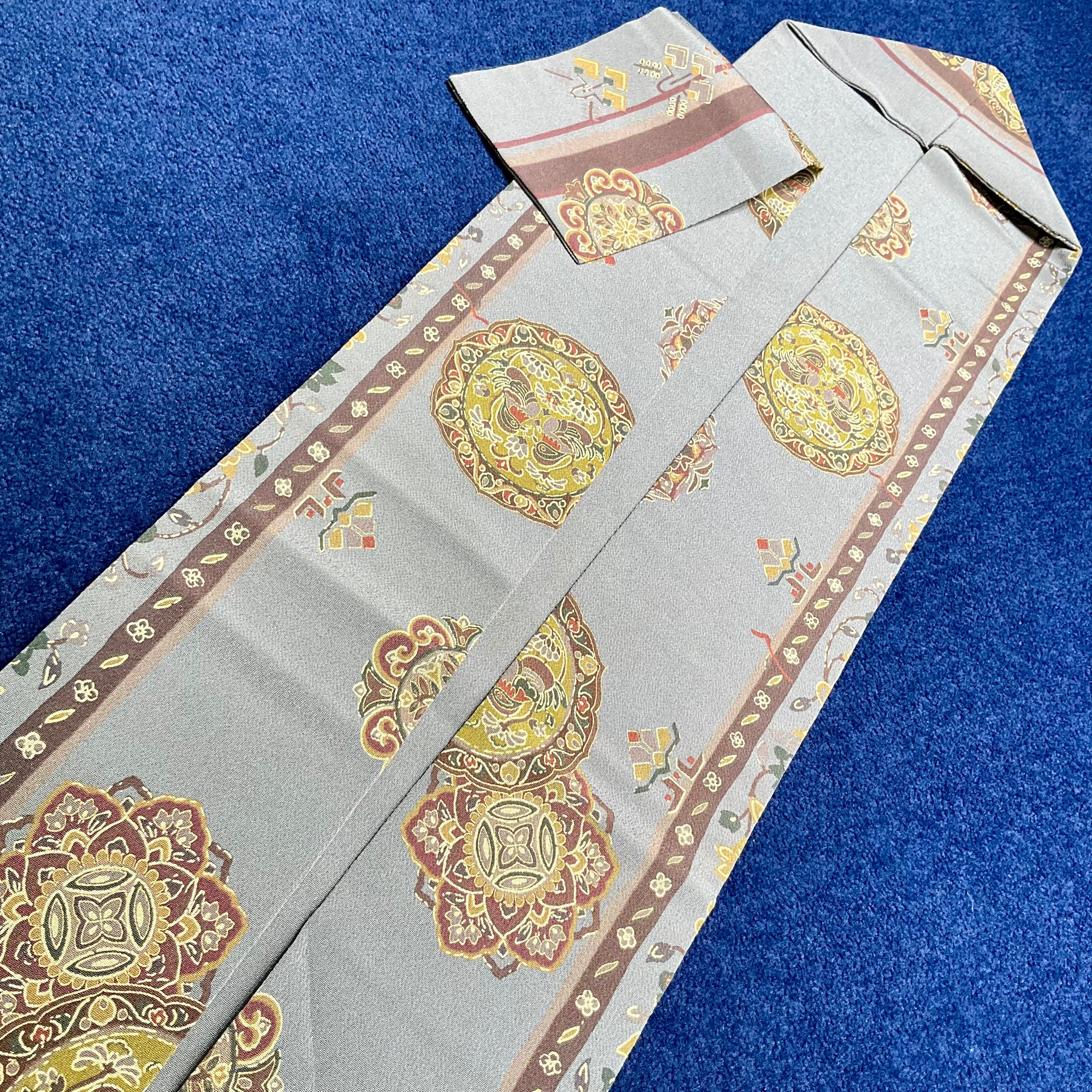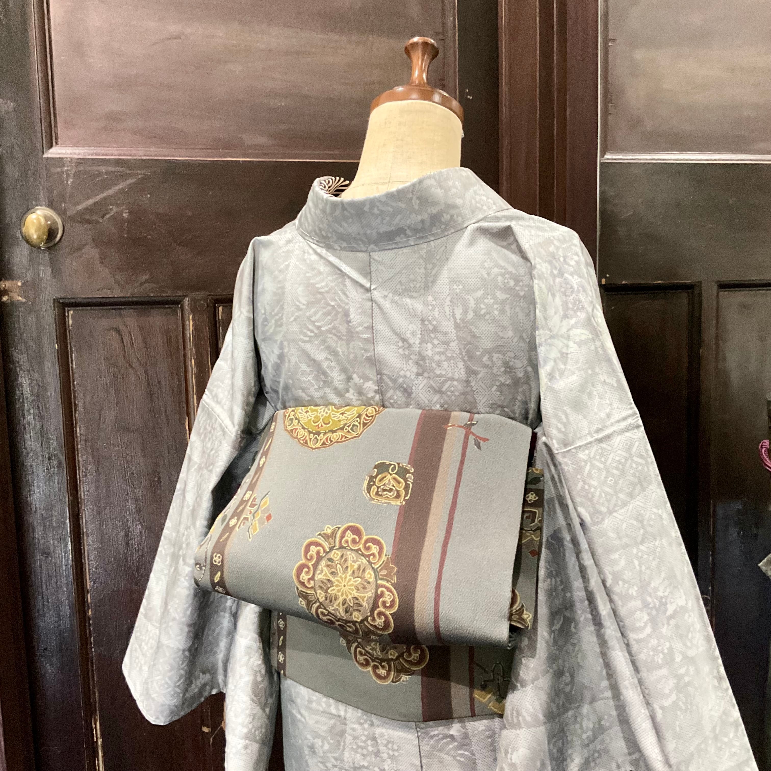 グレーの地色に鴛鴦や華文が描かれたちりめん地の名古屋帯です