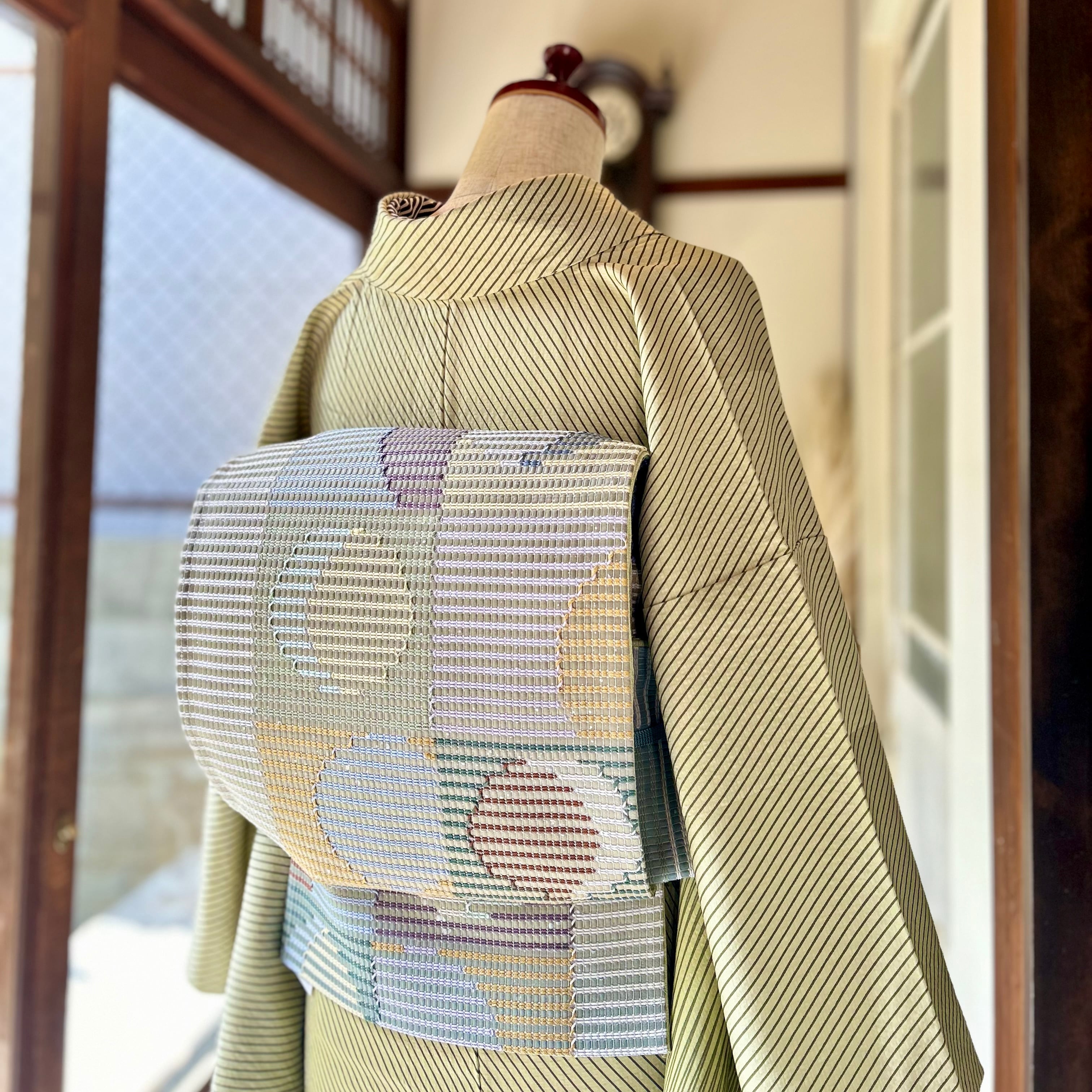 全体的に落ち着いた色使いですが、織りでデザインされた、縞や丸、四角の模様が目を惹き、帯に現代アートを施したようで、まさに着るアート!