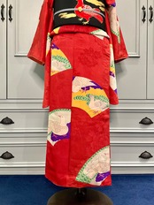 朱色に近い深みのあるオレンジに、扇面の黄色や紫、グリーンの色使いがアンティークらしい美しさですね✨