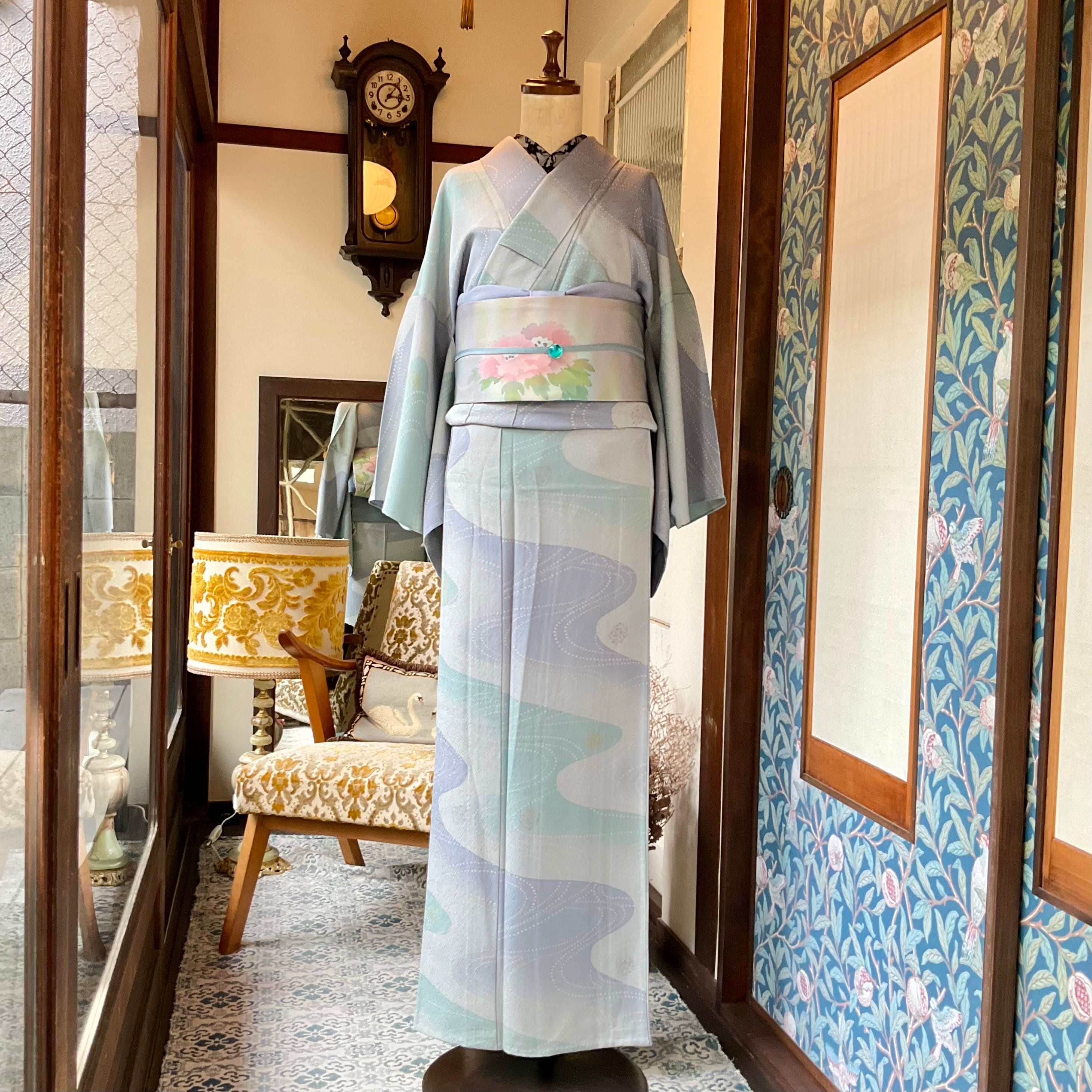 ブルーやグリーンの地色に、流線がデザインされた涼やかな単衣仕立ての小紋着物です