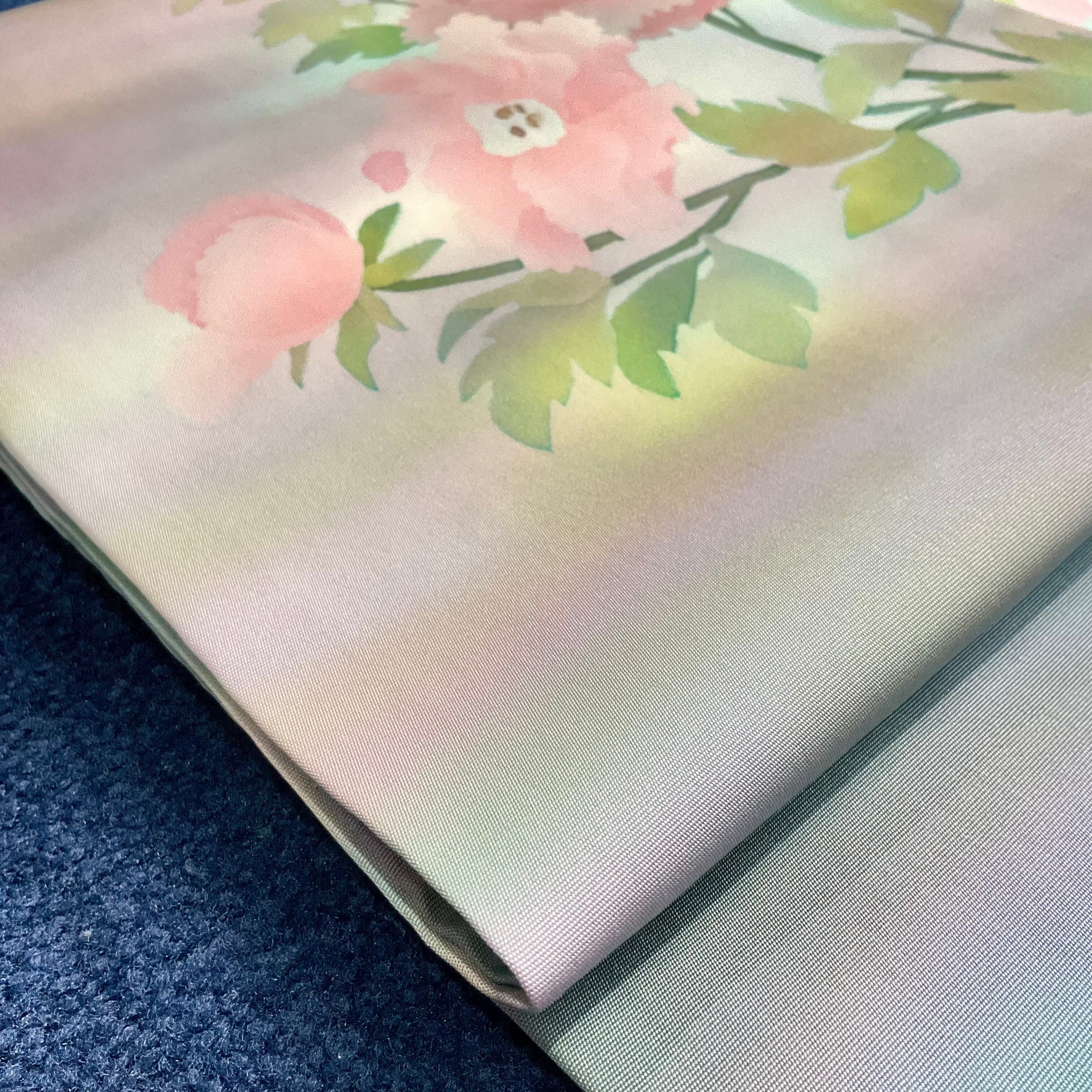 落ち着いたカラーグラデーションの地色に、高貴で美しく奥ゆかしさのある牡丹を描いた染め帯は上品さたっぷり