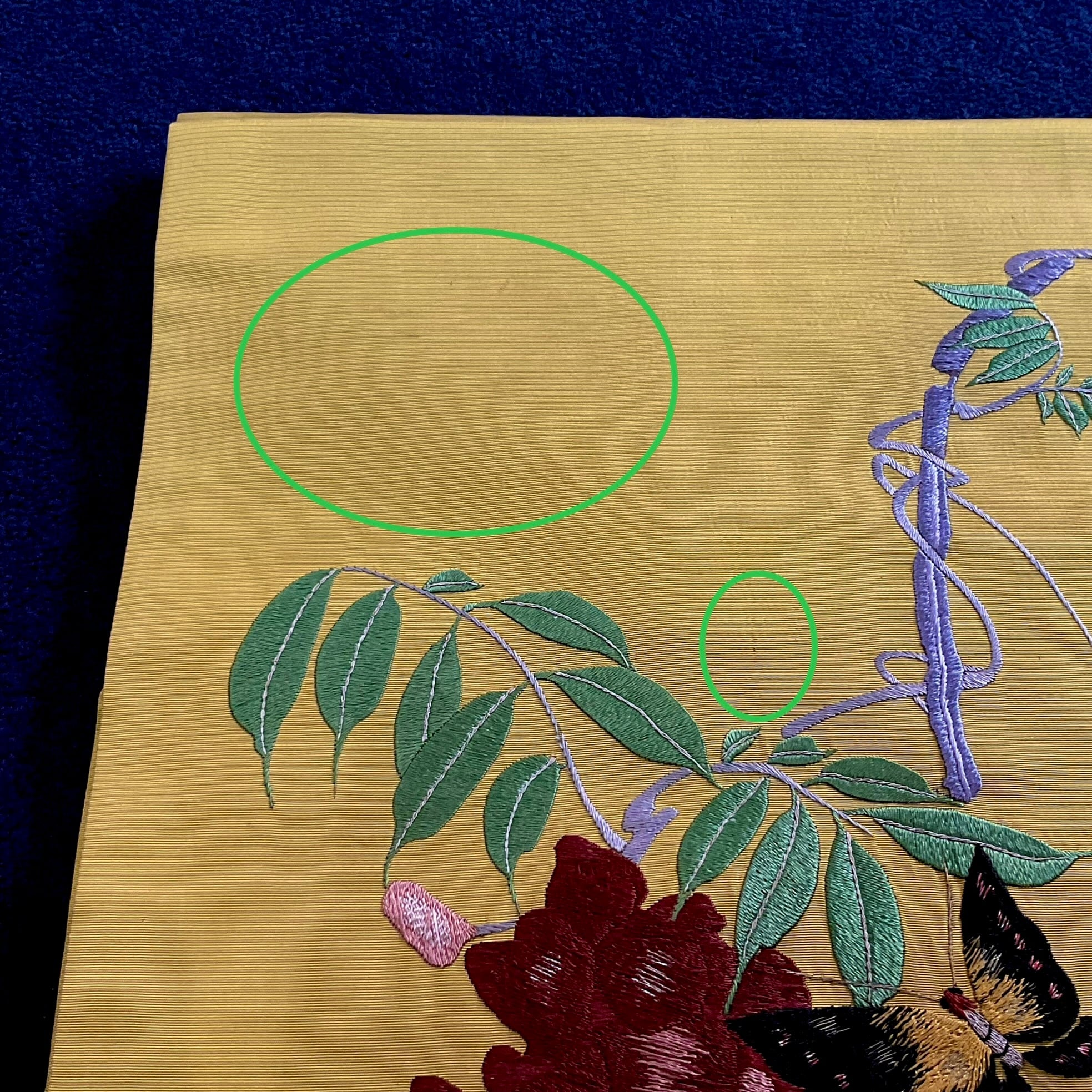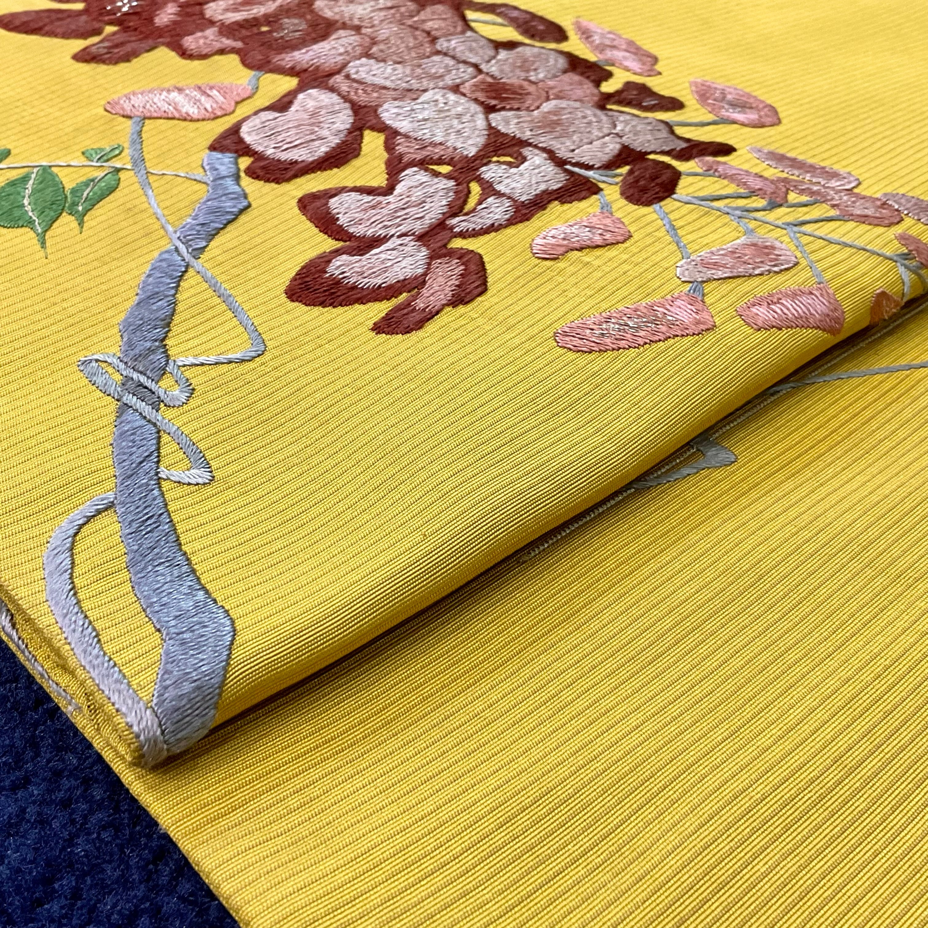 芥子色系のイエロー地に、大きな藤と蝶々が刺繍されたアンティーク名古屋帯です