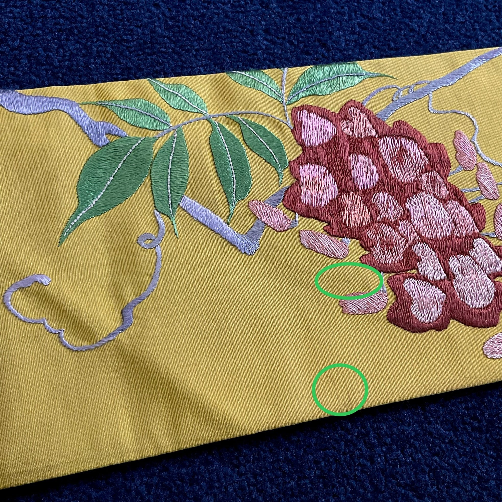 手刺繍ならではの繊細さと立体感があり、藤の花びらなどの所々に銀糸が使われていて、ほんのり煌めく様子が素敵ですね✨細かい技巧に見とれてしまいます。