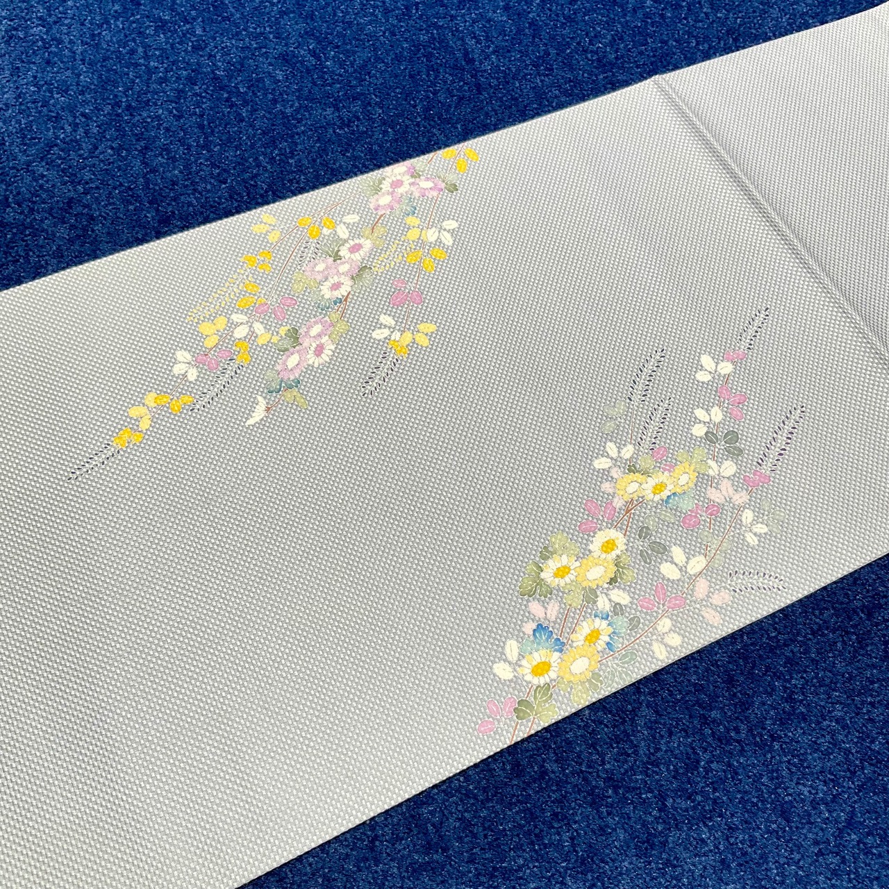 青紫や瑠璃色の花は、上品で美しく、少しかしこまった装いにもしっくりとくる洒落袋帯です✨️