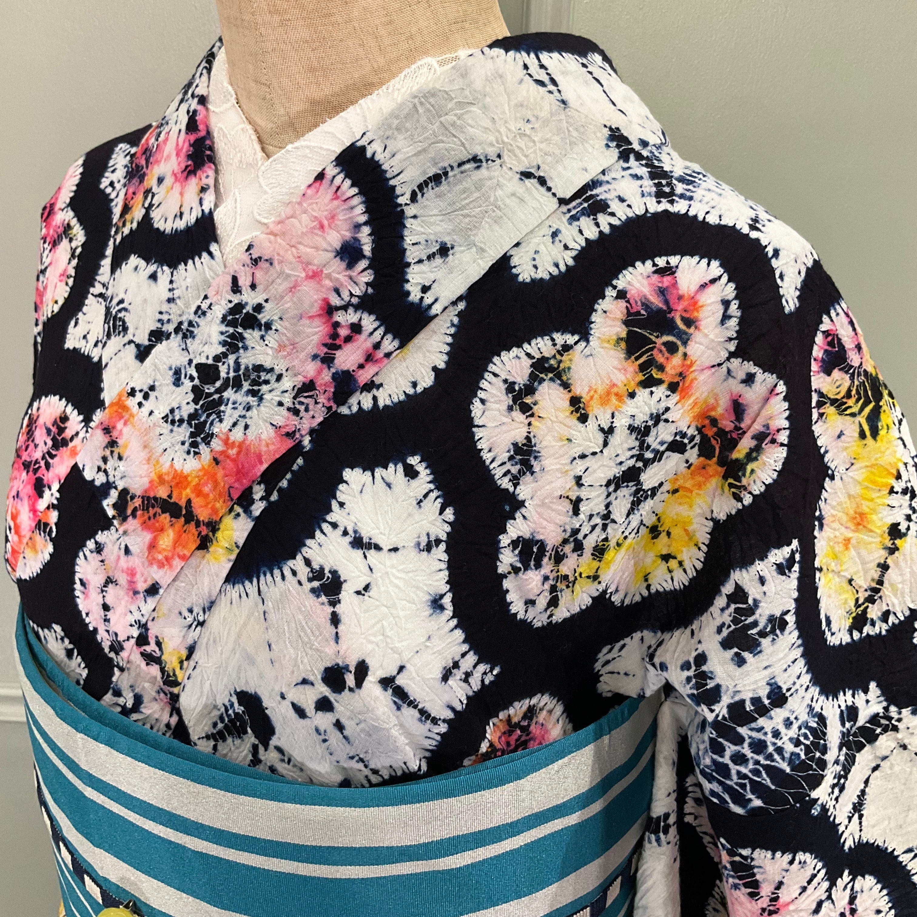 白×濃紺地に、梅の花がいっぱいの絞り模様が目を惹く有松鳴海絞り浴衣です