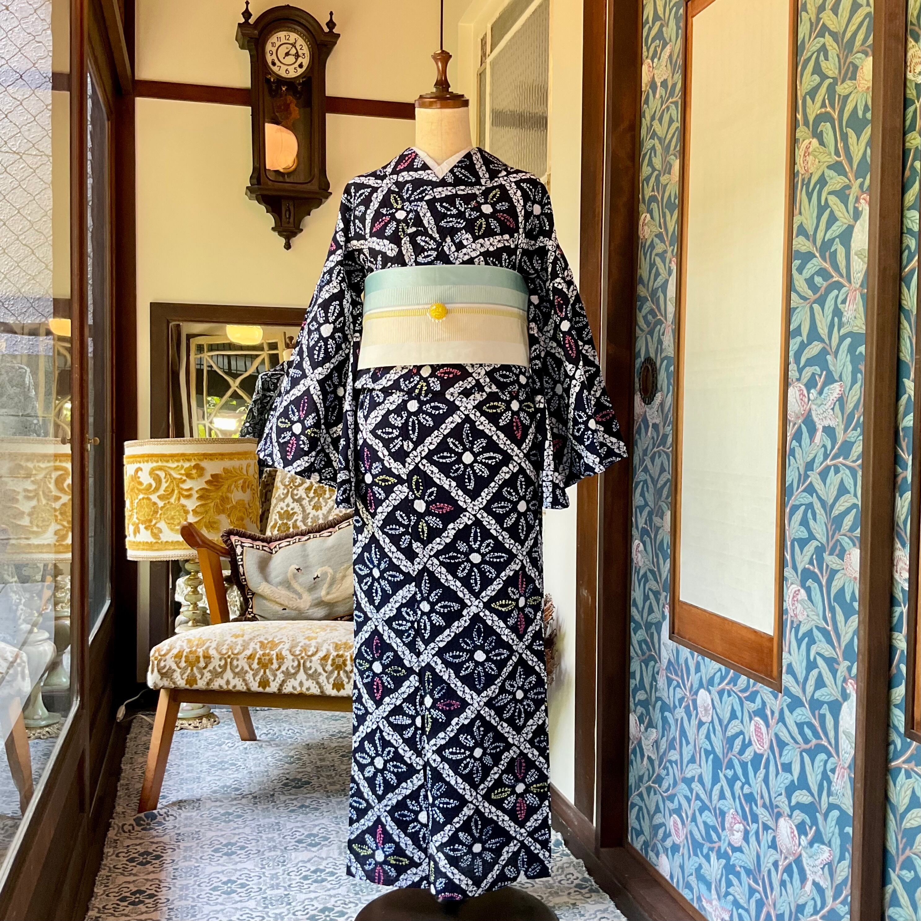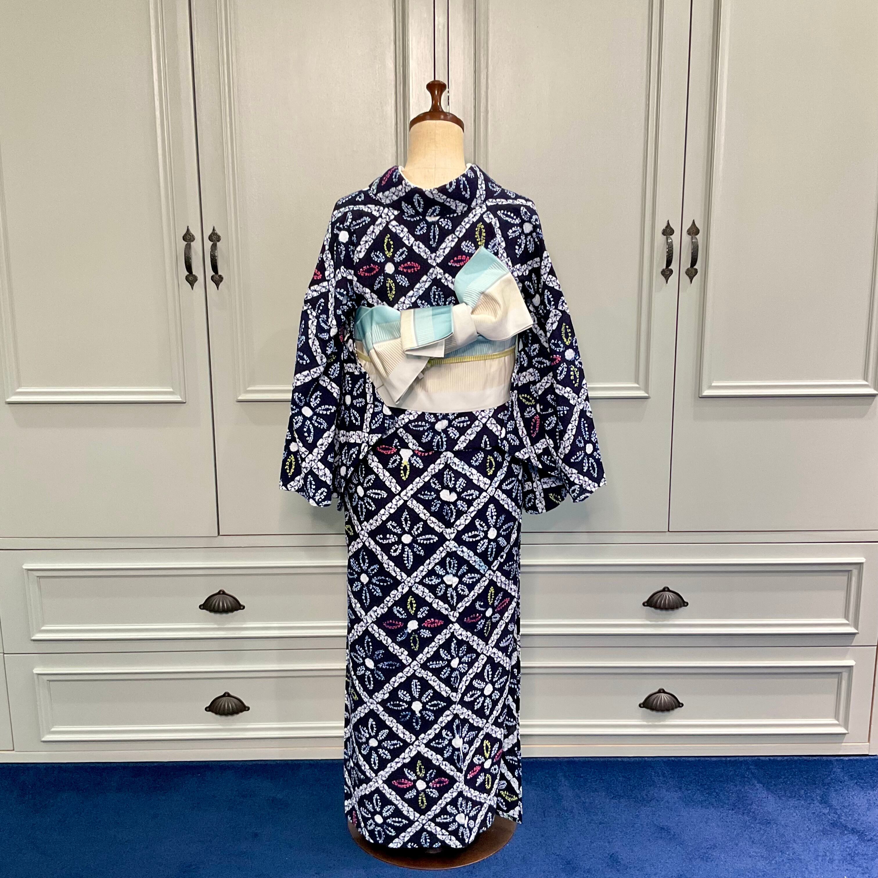 藍色の地色に、菱の中に花模様がキリッとデザインされた美しい有松鳴海絞り浴衣です♪