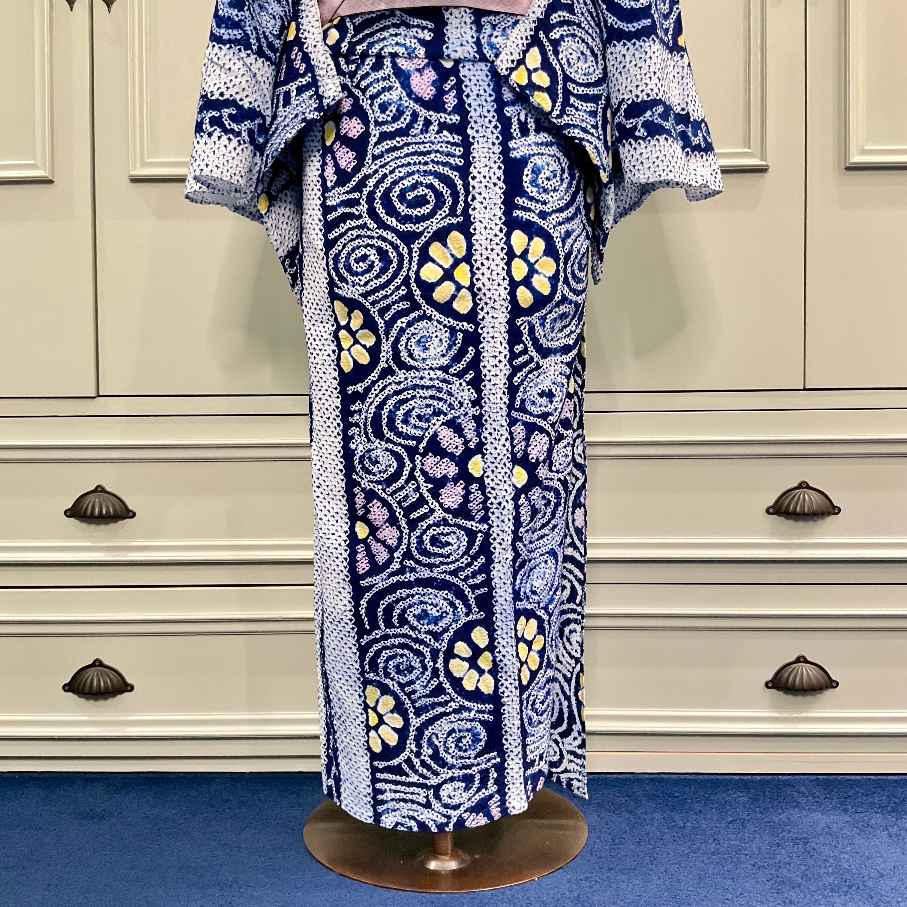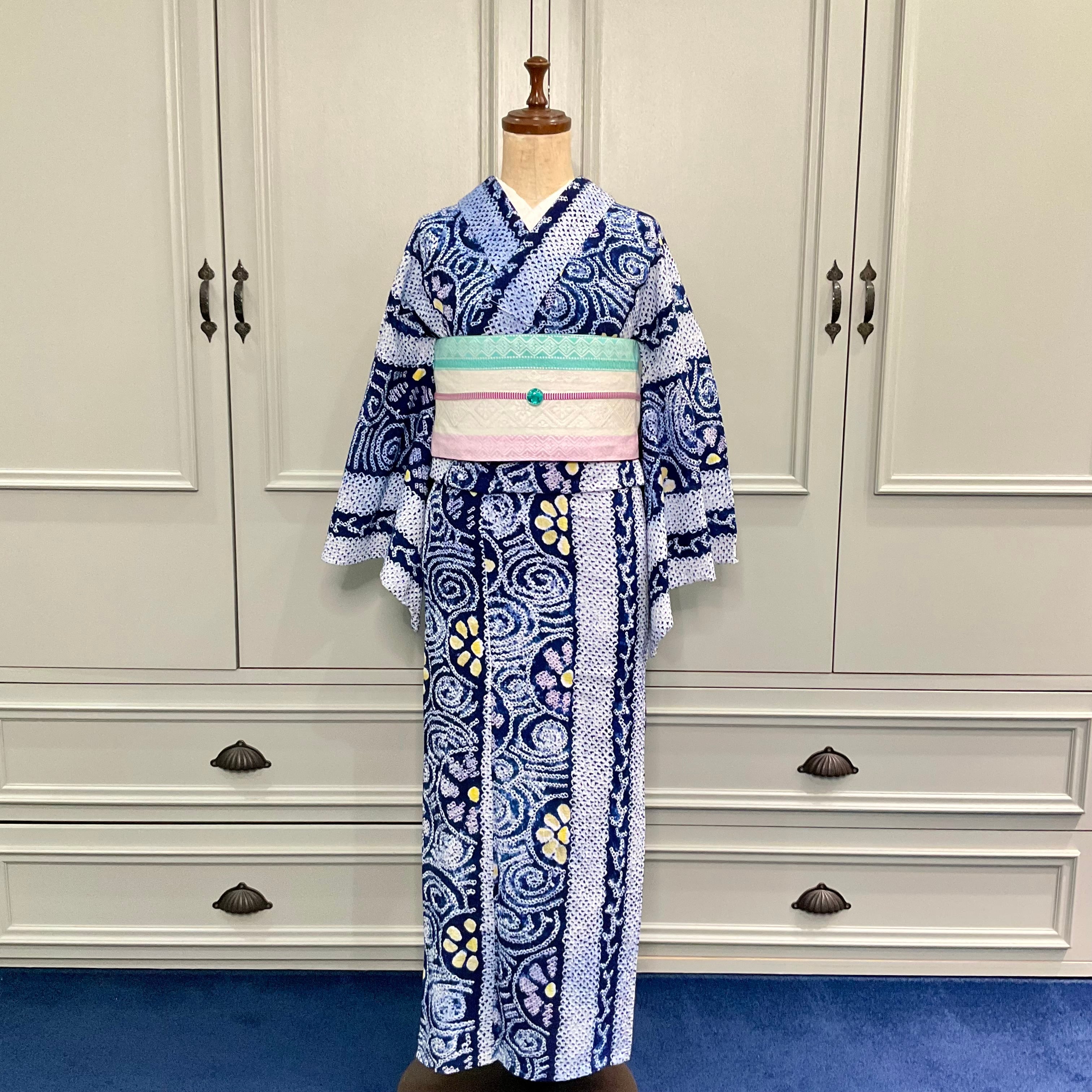ネイビーの地色に、縦ラインにスッキリと渦や花模様がデザインされた有松鳴海絞り浴衣です