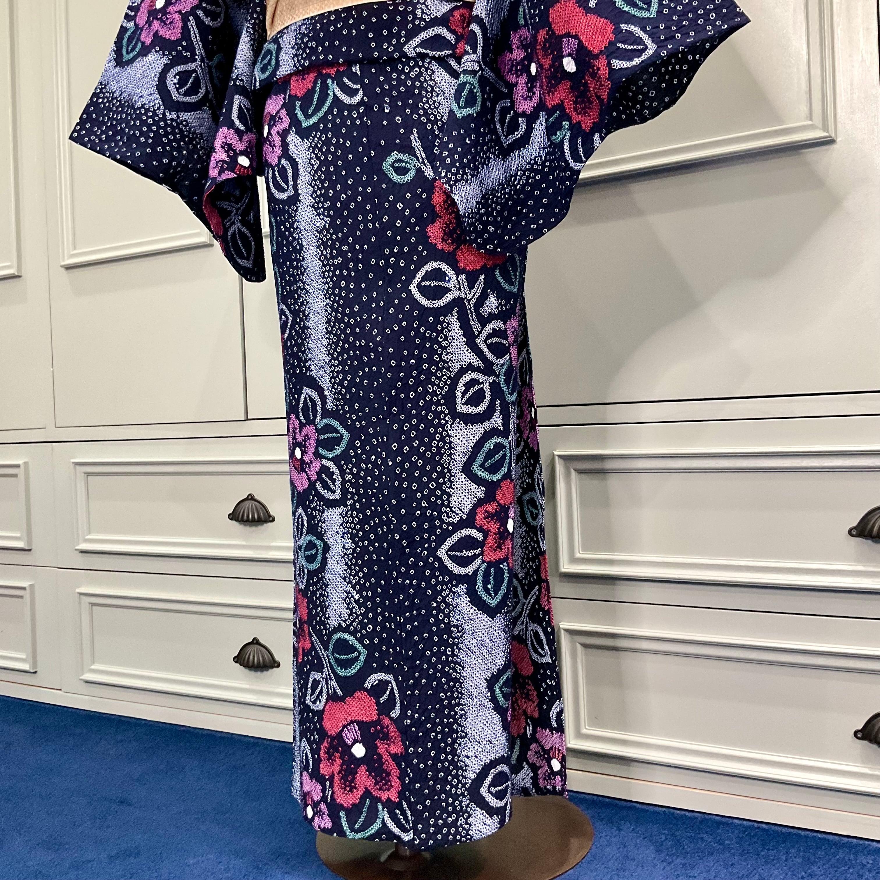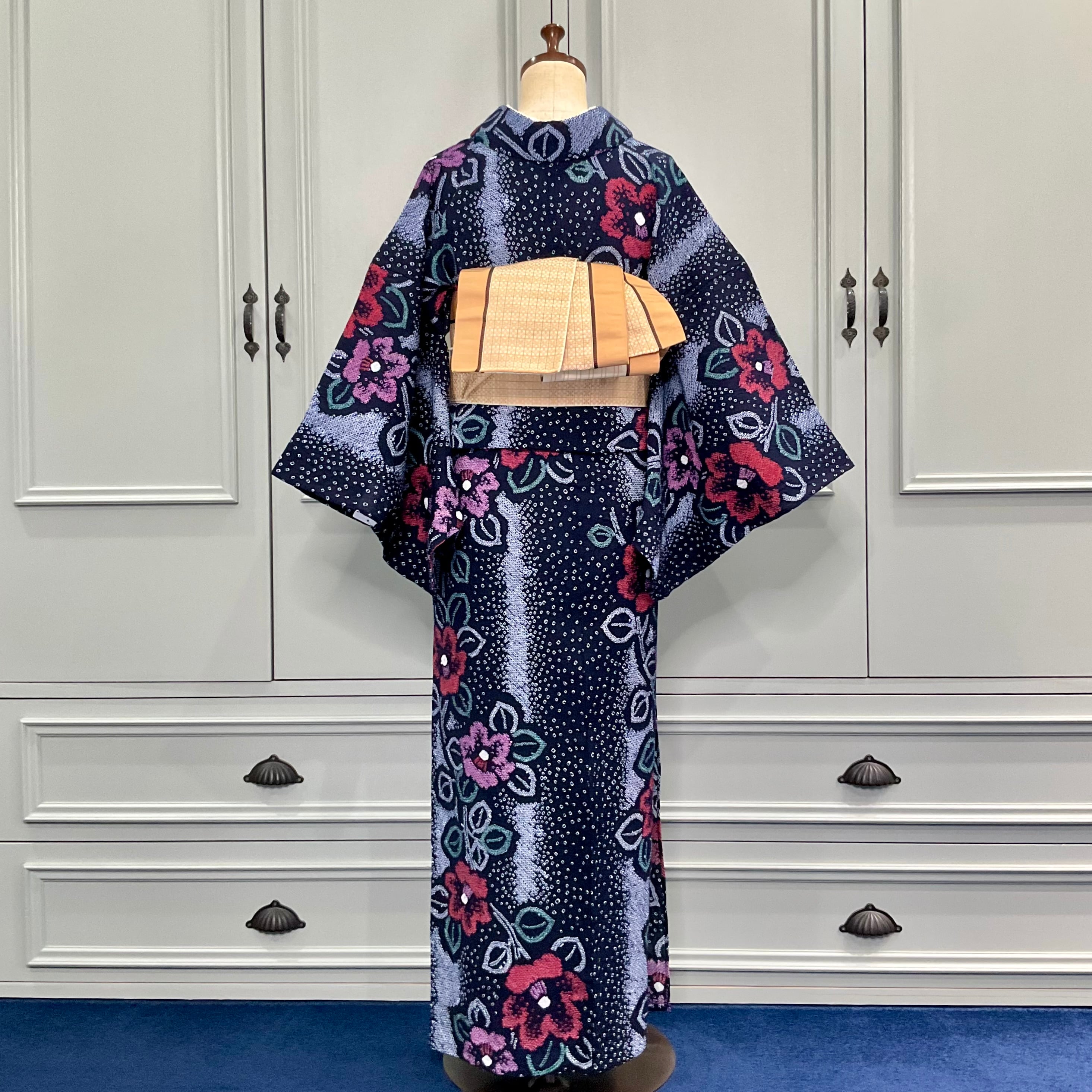 long*真夜中の椿*ストライプ 有松鳴海絞り浴衣 未使用品 花 濃紺 A721