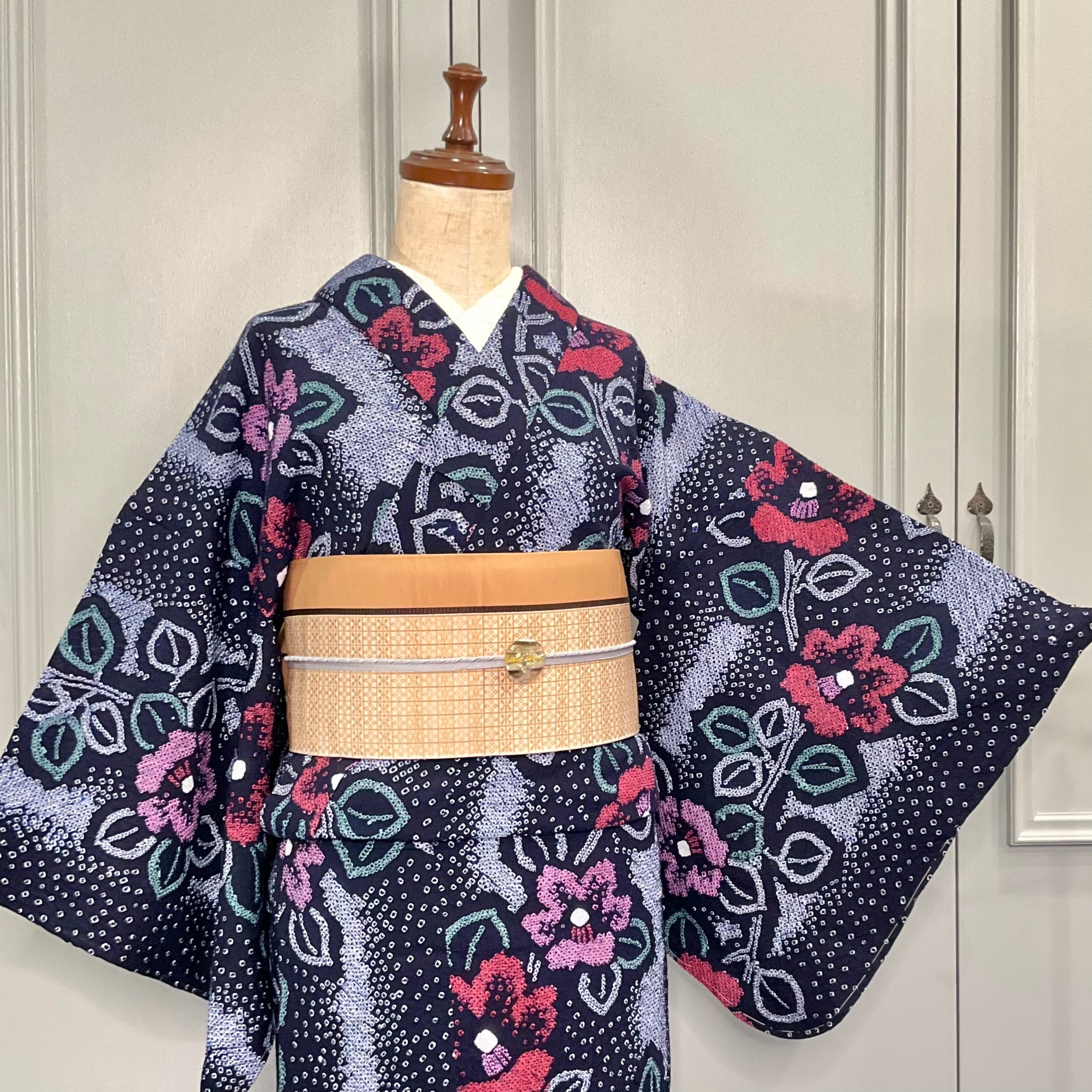 濃紺の地色に、赤や桃の椿の花、緑色の葉模様がデザインされた大人シックな有松鳴海絞り浴衣です