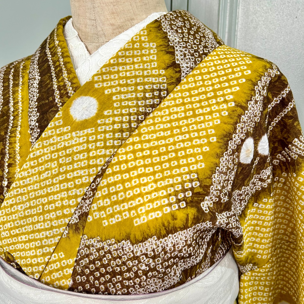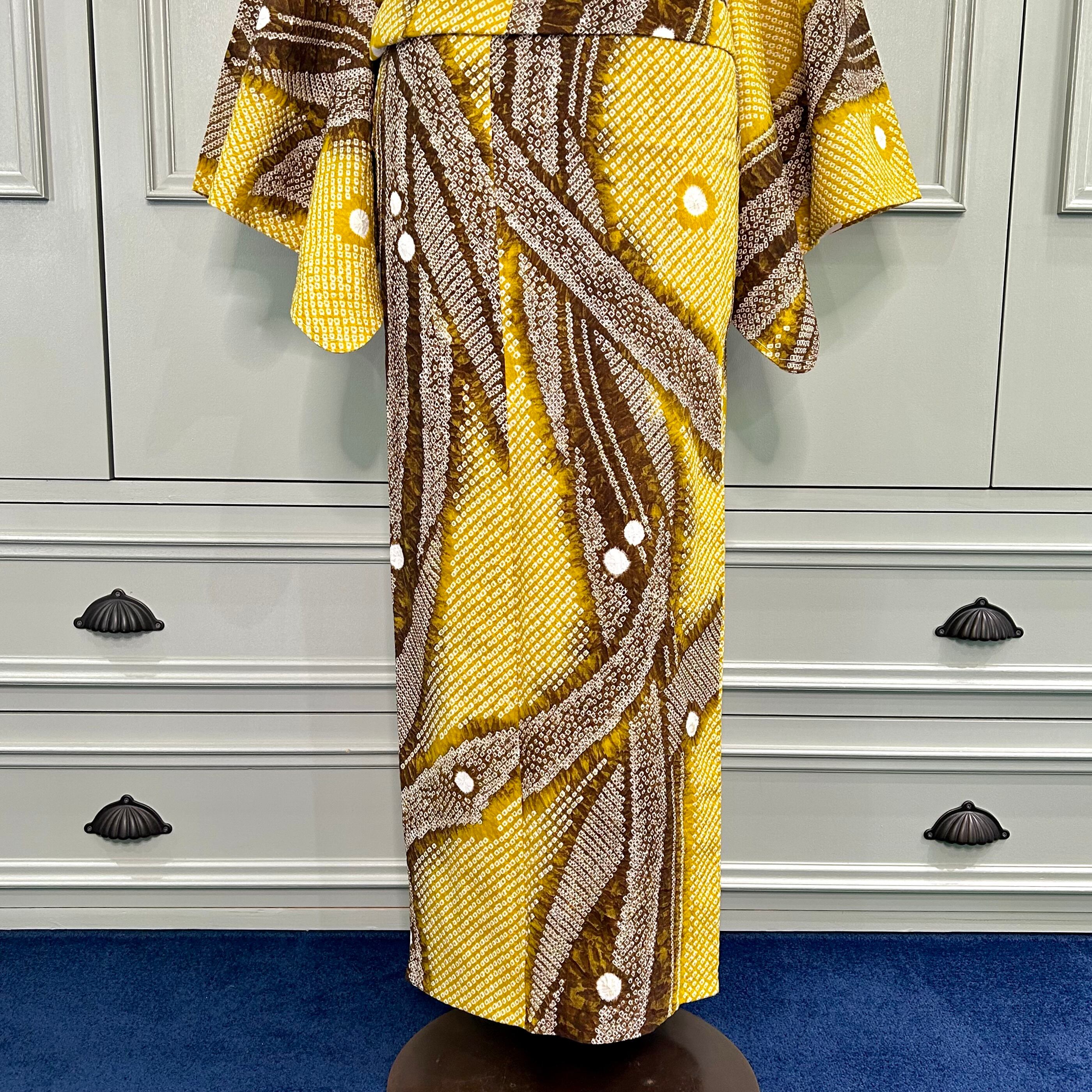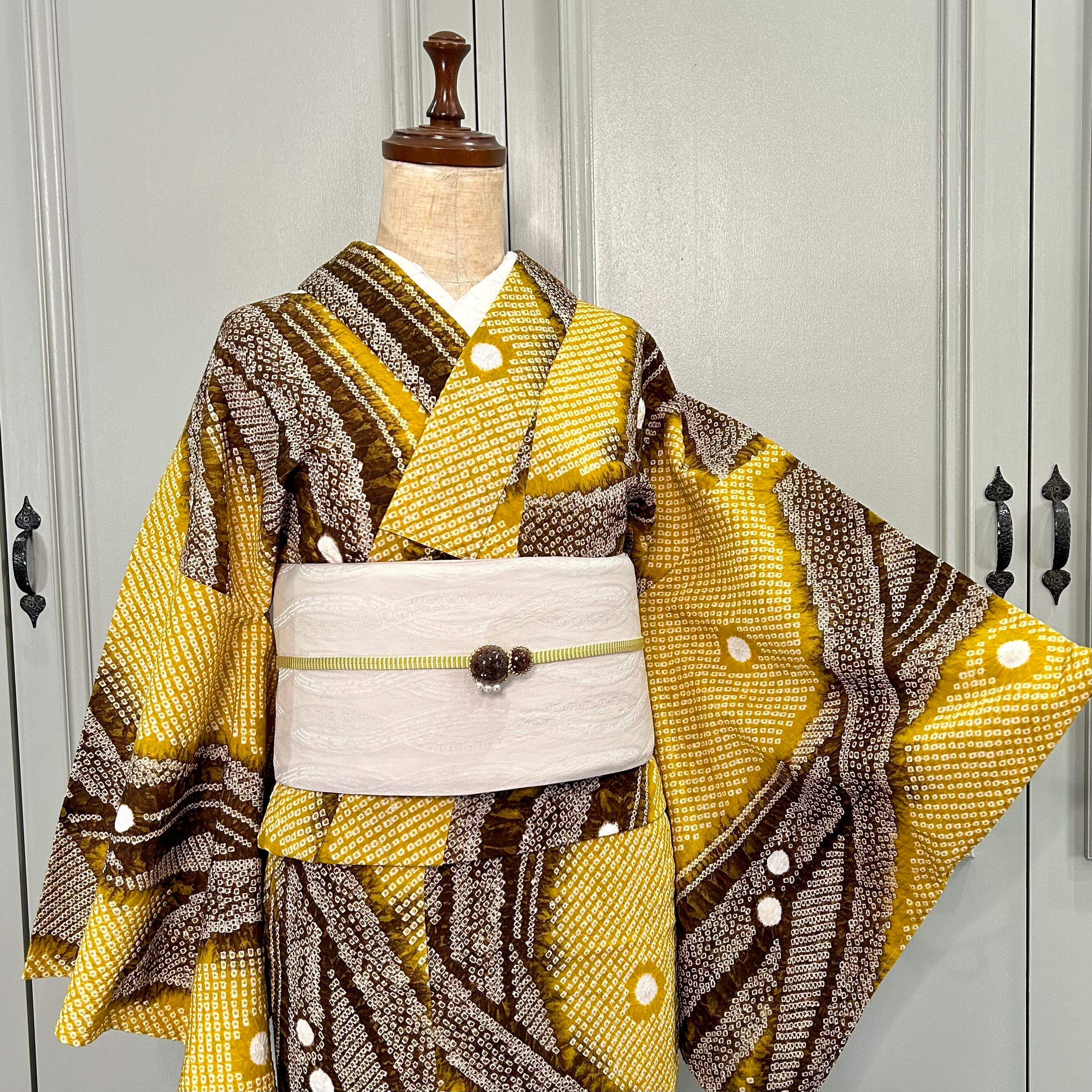 マスタードや明るいブラウン系の地色に、流れるような幾何学模様がデザインされたスタイリッシュな有松鳴海絞り浴衣です♪