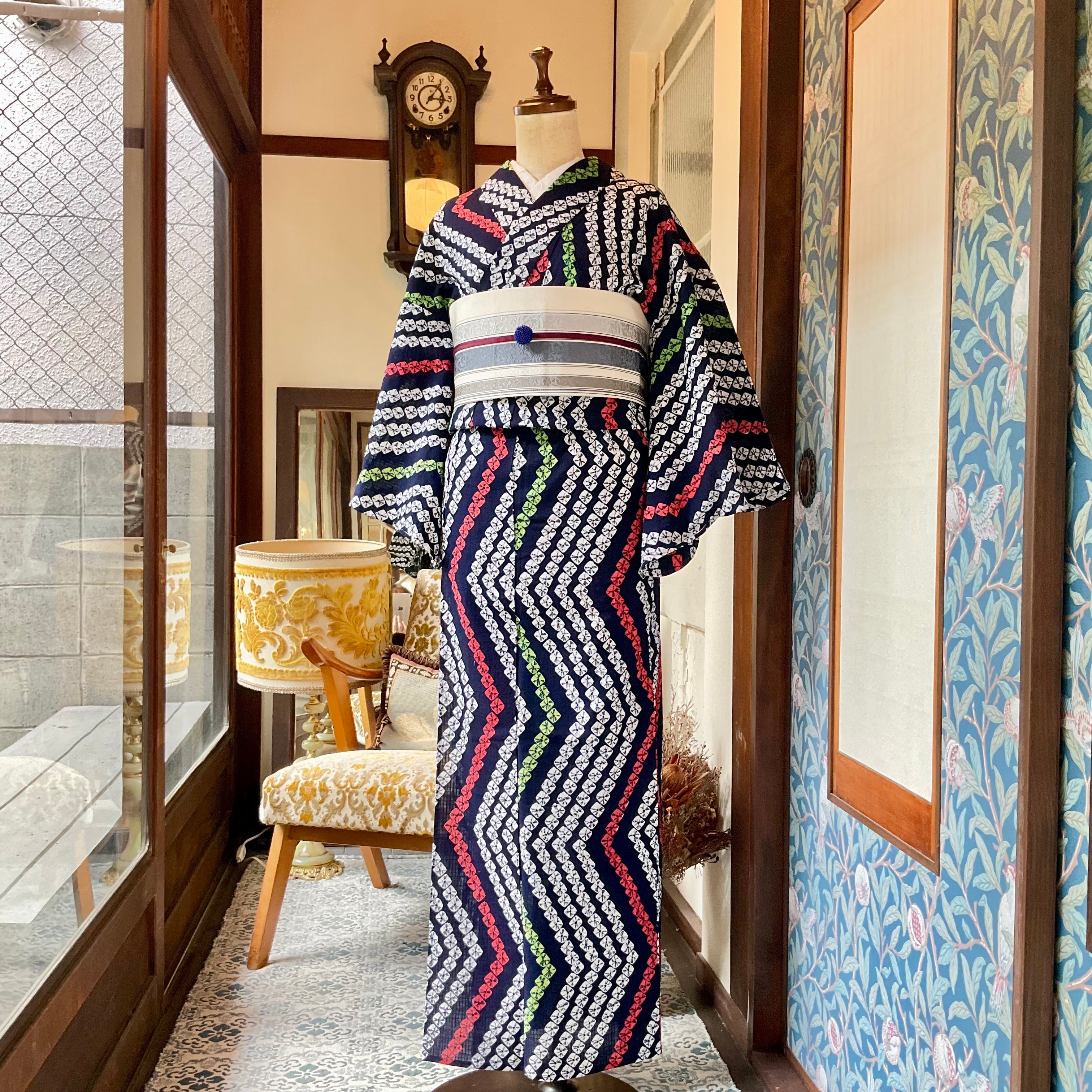 じぐざぐネオン*有松鳴海絞り浴衣 濃紺 ネイビー A724